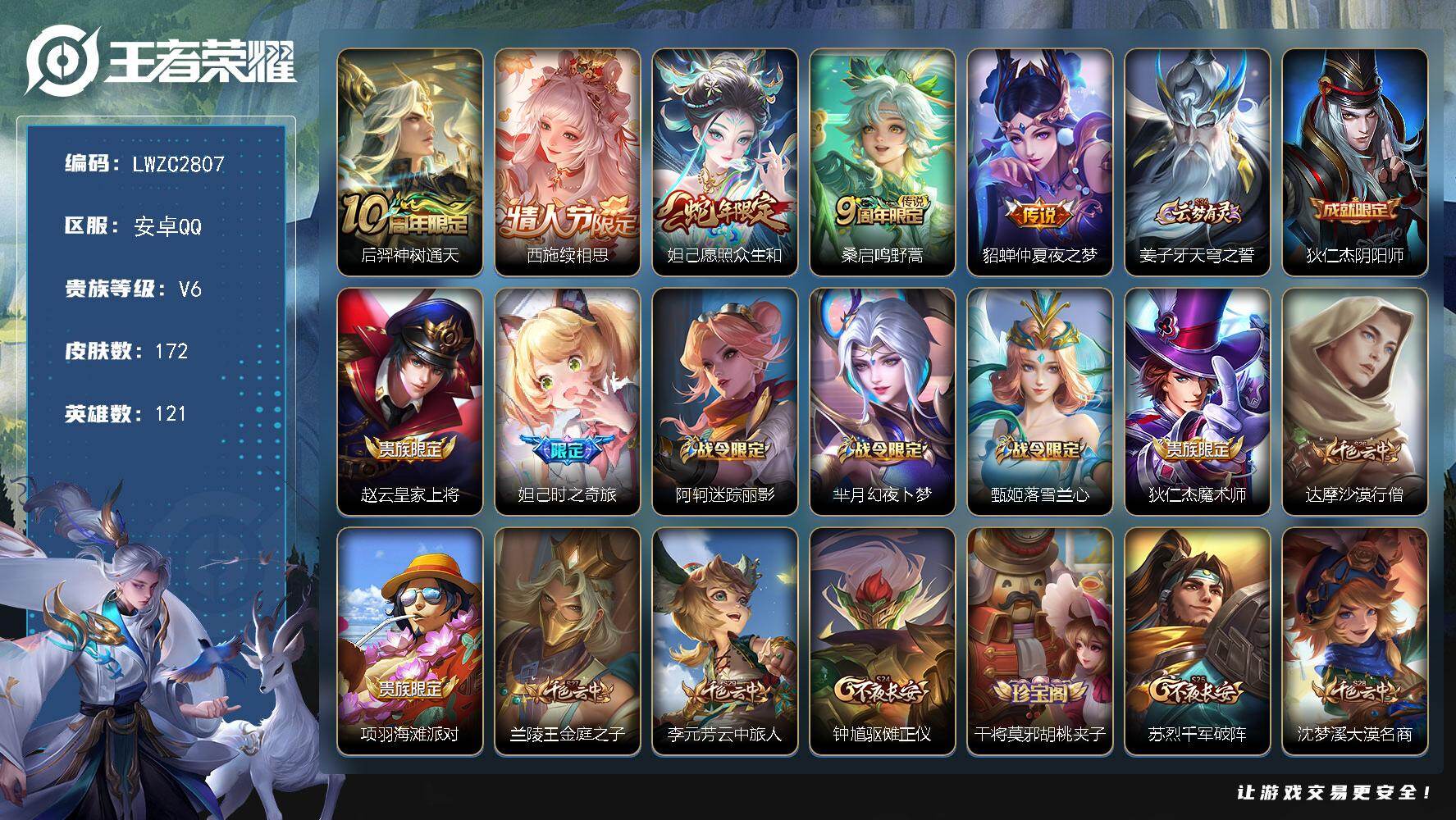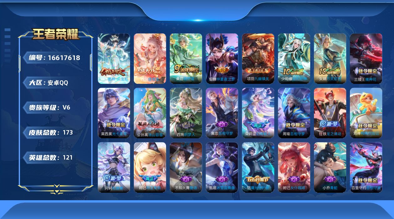 [16617618]可二次【特价出售/店主推荐】安卓Q-V6-永恒钻石III段位-121英雄-172皮肤-5传说-44史诗 【英雄全皮】:戈娅全皮,空空儿全皮 【传说皮肤】:后羿神树通天,西施续相思,妲己愿照众生和,桑启鸣野蒿,貂蝉仲夏夜之梦 【限定皮肤】:姜子牙天穹之誓,狄仁杰阴阳师,赵云皇家上将,妲己时之奇旅,阿轲迷踪丽影,芈月幻夜卜梦,甄姬落雪兰心,狄仁杰魔术师,达摩沙漠行僧,项羽海滩派对,兰陵王金庭之子,李元芳云中旅人,钟馗驱傩正仪,干将莫邪胡桃夹子,苏烈千军破阵,沈梦溪大漠名商,裴擒虎擒涛扼浪,米莱狄胡桃异想国,西施玲珑珍味,鲁班大师探海日志,桑启海盐诗旅,戈娅驭风魔法,艾琳女武神,阿古朵江河有灵,张良古海寻踪,鬼谷子天穹祈灯,沈梦溪龙舞盛年,刘邦剑破天穹,周瑜熔金海岸 【年限皮肤】:妲己愿照众生和 【赛季限定】:钟馗驱傩正仪,苏烈千军破阵,达摩沙漠行僧,兰陵王金庭之子,沈梦溪大漠名商,李元芳云中旅人,桑启海盐诗旅,裴擒虎擒涛扼浪,鲁班大师探海日志,张良古海寻踪,鬼谷子天穹祈灯,刘邦剑破天穹,姜子牙天穹之誓,东皇太一噬灭天穹,太乙真人谧流熔炉,钟馗虚灵犬护,甄姬逆浪荇歌,亚瑟荣光之誓,项羽九幽镇关 【战令限定】:阿轲迷踪丽影,米莱狄胡桃异想国,芈月幻夜卜梦,甄姬落雪兰心,戈娅驭风魔法,西施玲珑珍味,百里守约百相守梦,老夫子百相守梦,刘禅鸭鸭历险记,沈梦溪鸭鸭历险记,周瑜百相守梦,孙策百相守梦,兰陵王傩神司,莱西奥光弋星穹,明世隐往忆晖光 【史诗皮肤】:赵云皇家上将,貂蝉圣诞恋歌,甄姬冰雪圆舞曲,王昭君偶像歌手,狄仁杰魔术师,廉颇地狱岩魂,宫本武藏鬼剑武藏,孙尚香水果甜心,妲己魅力维加斯,妲己女仆咖啡,墨子金属风暴,李白千年之狐,吕布末日机甲,夏侯惇乘风破浪,小乔缤纷独角兽,安琪拉心灵骇客,铠曙光守护者,蔡文姬舞动绿茵,程咬金功夫厨神,大乔猫狗日记,狄仁杰鹰眼统帅,小乔青蛇,不知火舞魅语,阿轲迷踪丽影,米莱狄胡桃异想国,艾琳奇遇舞章,貂蝉唤灵魅影,妲己时之奇旅,戈娅驭风魔法,阿古朵江河有灵,百里守约百相守梦,阿轲化蝶舞,刘禅鸭鸭历险记,狂铁龙之律动,周瑜百相守梦,黄忠百相守梦,朵莉亚幻珠鲛人,西施织梦人,公孙离涂山容容,莱西奥光弋星穹,兰陵王傩神司,女娲万灵启世,少司缘巫礼祀神,项羽九幽镇关 【其他皮肤】:项羽海滩派对,韩信教廷特使,韩信街头霸王,露娜哥特玫瑰,阿轲爱心护理,