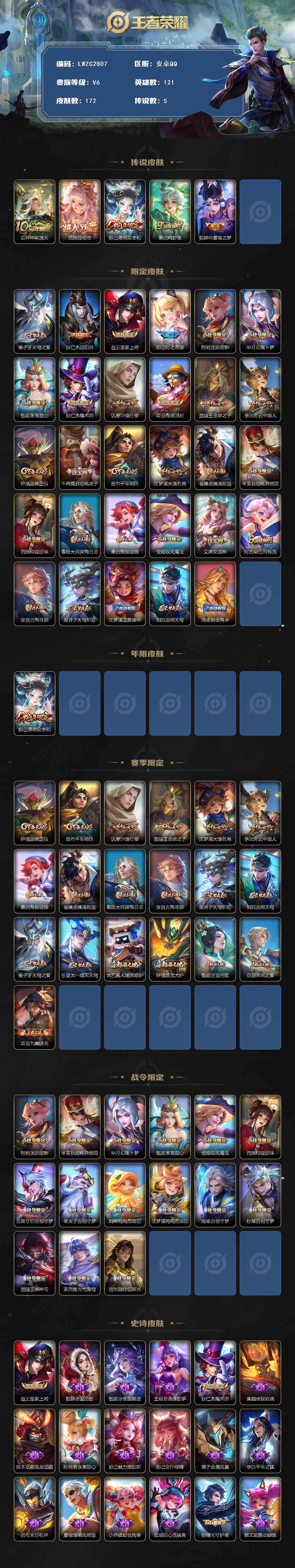 [16617618]可二次【特价出售/店主推荐】安卓Q-V6-永恒钻石III段位-121英雄-172皮肤-5传说-44史诗
