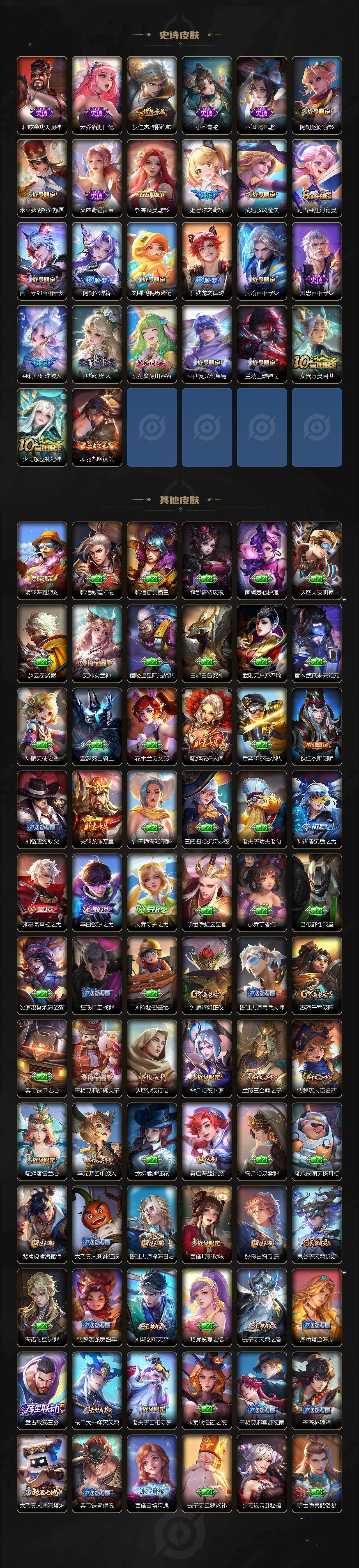 【史诗皮肤】:赵云皇家上将,貂蝉圣诞恋歌,甄姬冰雪圆舞曲,王昭君偶像歌手,狄仁杰魔术师,廉颇地狱岩魂,宫本武藏鬼剑武藏,孙尚香水果甜心,妲己魅力维加斯,妲己女仆咖啡,墨子金属风暴,李白千年之狐,吕布末日机甲,夏侯惇乘风破浪,小乔缤纷独角兽,安琪拉心灵骇客,铠曙光守护者,蔡文姬舞动绿茵,程咬金功夫厨神,大乔猫狗日记,狄仁杰鹰眼统帅,小乔青蛇,不知火舞魅语,阿轲迷踪丽影,米莱狄胡桃异想国,艾琳奇遇舞章,貂蝉唤灵魅影,妲己时之奇旅,戈娅驭风魔法,阿古朵江河有灵,百里守约百相守梦,阿轲化蝶舞,刘禅鸭鸭历险记,狂铁龙之律动,周瑜百相守梦,黄忠百相守梦,朵莉亚幻珠鲛人,西施织梦人,公孙离涂山容容,莱西奥光弋星穹,兰陵王傩神司,女娲万灵启世,少司缘巫礼祀神,项羽九幽镇关