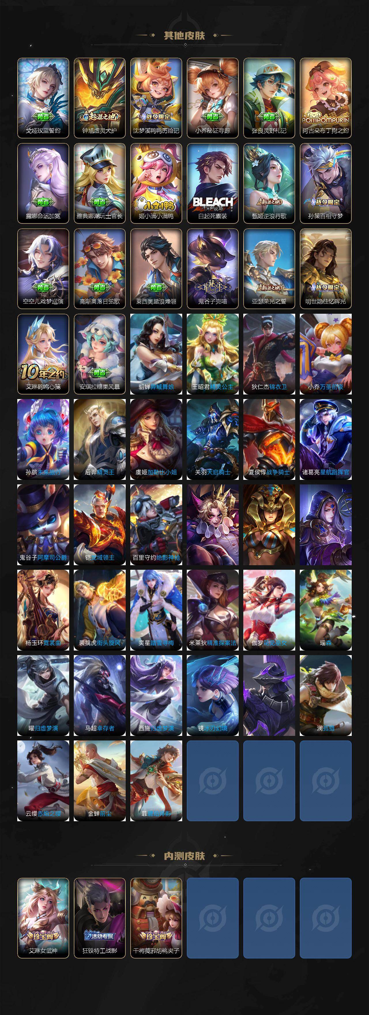 【战令限定】:阿轲迷踪丽影,米莱狄胡桃异想国,芈月幻夜卜梦,甄姬落雪兰心,戈娅驭风魔法,西施玲珑珍味,百里守约百相守梦,老夫子百相守梦,刘禅鸭鸭历险记,沈梦溪鸭鸭历险记,周瑜百相守梦,孙策百相守梦,兰陵王傩神司,莱西奥光弋星穹,明世隐往忆晖光