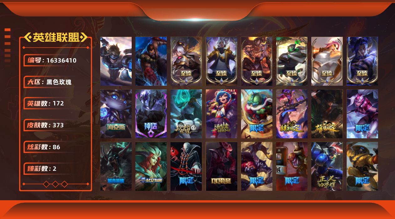 [16336410]【店主推荐捡漏号!可直接换绑】未定级段位-172英雄-373皮肤-86炫彩-2终极-11神话-62限定-31传说-102史诗 【至臻皮肤】:至臻征服者贾克斯,至臻源计划正义艾瑞莉娅,至臻烈焰美人薇恩,至臻福牛守护者菲奥娜,至臻真实伤害亚索,至臻至高天奎桑提 【臻彩皮肤】:无畏骑士瑟庄妮赤子初心,源计划联合艾希红莲之弓 【年限皮肤】:定海神珍孙悟空,玉净夜叉凯特琳,虎痴之拳蔚 【海克斯皮肤】:海克斯科技波比 【情人节限定】:觅心猎手薇恩,觅心女王艾希 【冰雪限定】:幸福女神乐芙兰,圣诞开心鬼提莫,圣诞精灵崔丝塔娜,阿木木“主人不要我了”,邪恶圣诞老人维迦,夺命美人卡特琳娜,雪默丁格,圣诞玩偶波比,圣诞老人古拉加斯,圣诞驯鹿克格莫,魄罗骑士瑟庄妮,雪球也能爆炸吉格斯,冰雪节辛吉德 【终极皮肤】:灵魂守卫乌迪尔,未来战士伊泽瑞尔 【神话皮肤】:十周年纪念安妮,源代码乐芙兰,神凰行者瑞羽圣凰艾尼维亚,灰烬杀手塞拉斯,海克斯科技波比,至臻征服者贾克斯,至臻真实伤害亚索,至臻至高天奎桑提,至臻福牛守护者菲奥娜,至臻烈焰美人薇恩,至臻源计划正义艾瑞莉娅 【限定皮肤】:卧虎藏龙贾克斯,诺斯费拉图弗拉基米尔,Fnatic迦娜,Fnatic嘉文四世,Fnatic卡尔萨斯,Fnatic库奇,暗杀星努努和威朗普,暗杀星慎,SKTT1贾克斯,SSW辛吉德,SSW图奇,SSW泰隆,iG菲奥娜,电玩女神阿狸,胜利女神莫甘娜,胜利女神希维尔,胜利之树茂凯,胜利枪神格雷福斯,胜利女神奥莉安娜,胜利之剑亚托克斯,胜利枪神卢锡安,胜利机器人布里茨,胜利女神瑟庄妮,胜利凤凰艾尼维亚,胜利之王泰达米尔,胜利巨口克格莫,胜利女神娑娜,胜利之运崔斯特,胜利女神菲奥娜,南瓜头费德提克,鬼影重重魔腾,鬼影森森茂凯,魅惑女巫莫甘娜,泳池派对格雷福斯,泳池派对雷克顿,泳池派对李青,外星装甲库奇,暗影沃里克,永恒之森乐芙兰,勇者奈德丽,都铎王朝图奇,红桃杰克崔斯特,防暴士兵辛吉德,防暴天使凯尔 【传说皮肤】:地狱之门卫士加里奥,魔幻卡牌崔斯特,邪鸦魅影乐芙兰,大天使长米迦勒凯尔,战场女武神凯尔,合金巨兽努努和威朗普,女皇艾希,源计划联合艾希,恶魔之刃泰达米尔,鬼魂新娘莫甘娜,绅士科加斯,战地巨兽科加斯,双重冰晶艾尼维亚,律政大亨蒙多,电玩女神娑娜,冰霜之刃艾瑞莉娅,红色男爵库奇,苹果机器人布里茨,冰川巨兽墨菲特,地狱行