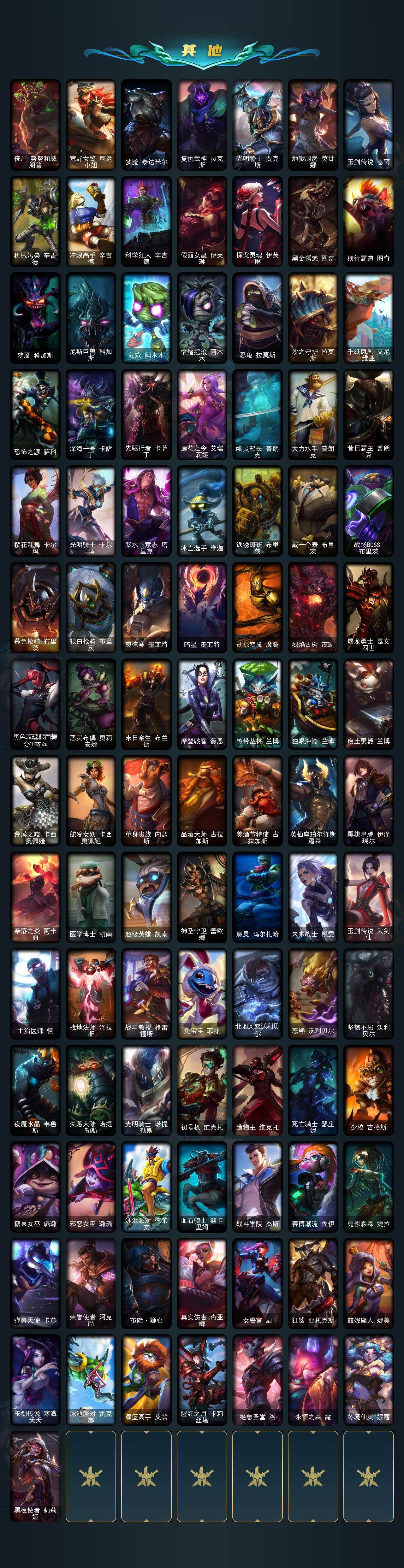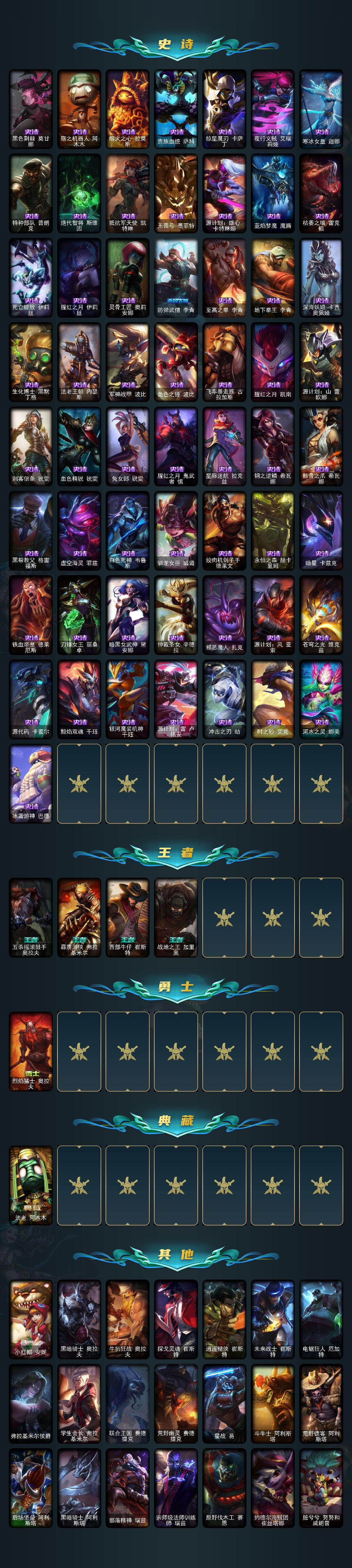 【史诗皮肤】:安伯斯与提妮,战争机器赛恩,月光女神阿忒弥斯索拉卡,熊猫提莫,火箭达人崔丝塔娜,紫晶射手艾希,国王泰达米尔,黑色荆棘莫甘娜,殇之机器人阿木木,熔火之心拉莫斯,贵族血统萨科,掠星魔刃卡萨丁,夜行义贼艾瑞莉娅,寒冰女皇迦娜,特种部队普朗克,绝代智将斯维因,抵抗军天使凯特琳,无畏号墨菲特,源计划雄心卡特琳娜,蓝焰梦魔魔腾,枯萎之壤雷克顿,死亡绽放伊莉丝,腥红之月伊莉丝,灵骨工匠奥莉安娜,防弹武僧李青,至高之拳李青,地下拳王李青,深海妖姬卡西奥佩娅,生化博士黑默丁格,法老王朝内瑟斯,军神战甲波比,血色之锤波比,飞车暴走族古拉加斯,腥红之月凯南,源计划山蕾欧娜,刺客信条锐雯,血色精锐锐雯,兔女郎锐雯,腥红之月鬼武者慎,星际迷航拉克丝,钢之逆鳞希瓦娜,骸骨
