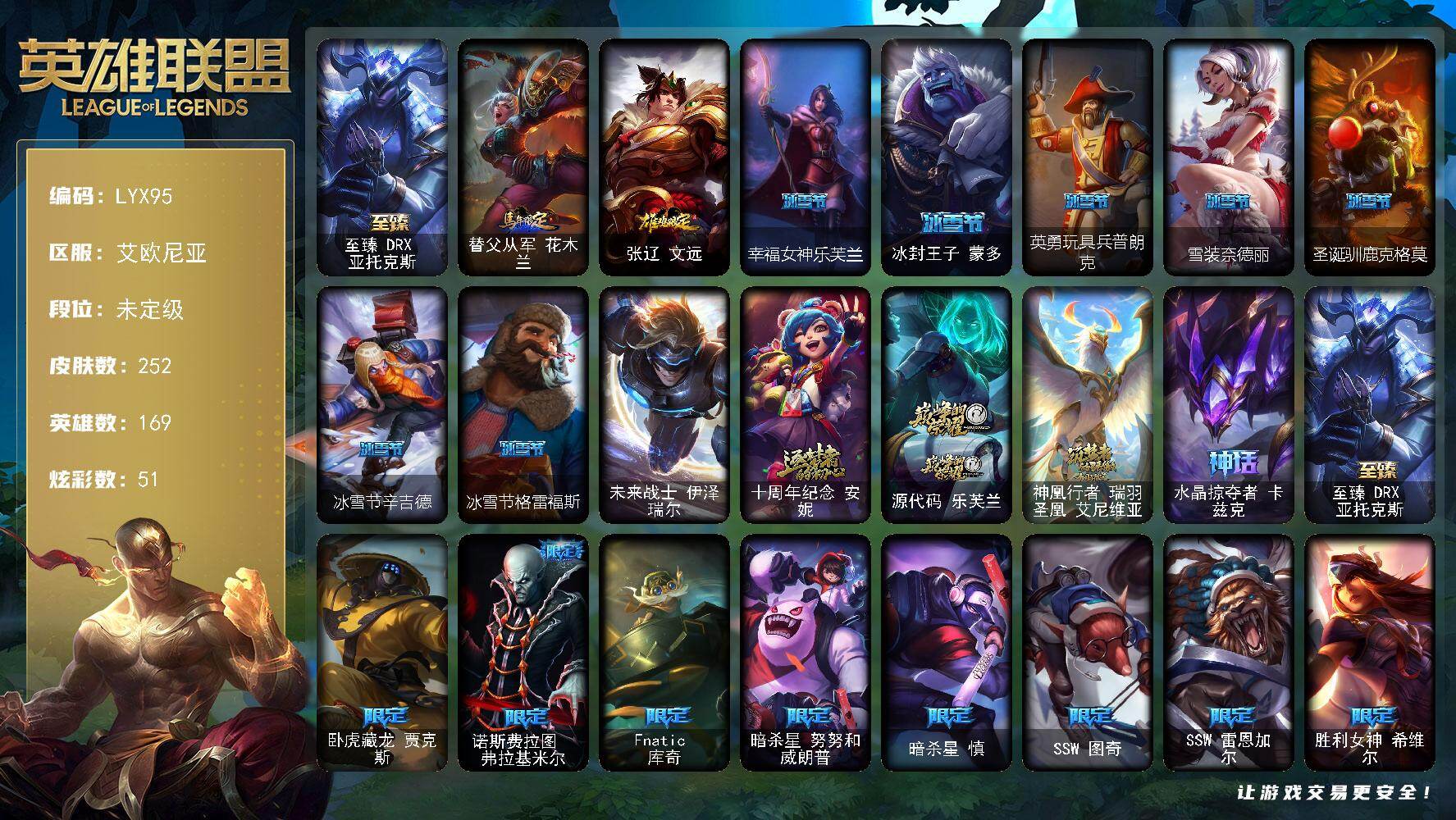 [16619039]可二次【特价出售/店主推荐】未定级段位-169英雄-252皮肤-51炫彩-1终极-5神话-39限定-17传说-64史诗 【至臻皮肤】:至臻DRX亚托克斯 【臻彩皮肤】:神龙尊者圣龙李青龙腾云起,魔女阿卡丽虚荣,净雪之月莫甘娜冬虹,红莲之刃锐雯 【年限皮肤】:替父从军花木兰,张辽文远 【冰雪限定】:幸福女神乐芙兰,冰封王子蒙多,英勇玩具兵普朗克,雪装奈德丽,圣诞驯鹿克格莫,冰雪节辛吉德,冰雪节格雷福斯 【终极皮肤】:未来战士伊泽瑞尔 【神话皮肤】:十周年纪念安妮,源代码乐芙兰,神凰行者瑞羽圣凰艾尼维亚,水晶掠夺者卡兹克,至臻DRX亚托克斯 【限定皮肤】:卧虎藏龙贾克斯,诺斯费拉图弗拉基米尔,Fnatic库奇,暗杀星努努和威朗普,暗杀星慎,SSW图奇,SSW雷恩加尔,胜利女神希维尔,胜利之树茂凯,胜利枪神格雷福斯,胜利女神奥莉安娜,胜利之剑亚托克斯,胜利枪神卢锡安,胜利机器人布里茨,胜利女神瑟庄妮,胜利凤凰艾尼维亚,胜利之王泰达米尔,胜利剑圣易,胜利之运崔斯特,胜利女神菲奥娜,海贼瑞兹,南瓜头费德提克,蒙多蒙多,女猎手希维尔,暗影沃里克,创战纪希维尔,都铎王朝图奇,防暴士兵格雷福斯,防暴士兵辛吉德,防暴天使凯尔 【传说皮肤】:地狱之门卫士加里奥,战场女武神凯尔,提莫约德尔人的一大步,欧米伽小队幽灵特工,合金巨兽努努和威朗普,双重冰晶艾尼维亚,律政大亨蒙多,冰霜之刃艾瑞莉娅,红色男爵库奇,最终BOSS维迦,第三类接触黑默丁格,黯黑魔龙希瓦娜,宇航员诺提勒斯,女校长菲奥娜,灌篮高手德莱厄斯,神王德莱厄斯,蔷薇绅士杰斯 【史诗皮肤】:安伯斯与提妮,战争机器赛恩,月光女神阿忒弥斯索拉卡,熊猫提莫,火箭达人崔丝塔娜,紫晶射手艾希,国王泰达米尔,黑色荆棘莫甘娜,殇之机器人阿木木,熔火之心拉莫斯,贵族血统萨科,掠星魔刃卡萨丁,夜行义贼艾瑞莉娅,寒冰女皇迦娜,特种部队普朗克,绝代智将斯维因,抵抗军天使凯特琳,无畏号墨菲特,源计划雄心卡特琳娜,蓝焰梦魔魔腾,枯萎之壤雷克顿,死亡绽放伊莉丝,腥红之月伊莉丝,灵骨工匠奥莉安娜,防弹武僧李青,至高之拳李青,地下拳王李青,深海妖姬卡西奥佩娅,生化博士黑默丁格,法老王朝内瑟斯,军神战甲波比,血色之锤波比,飞车暴走族古拉加斯,腥红之月凯南,源计划山蕾欧娜,刺客信条锐雯,血色精锐锐雯,兔女郎锐雯,腥红之月鬼武者慎,星际迷航拉克丝,钢之逆鳞希瓦娜,骸骨