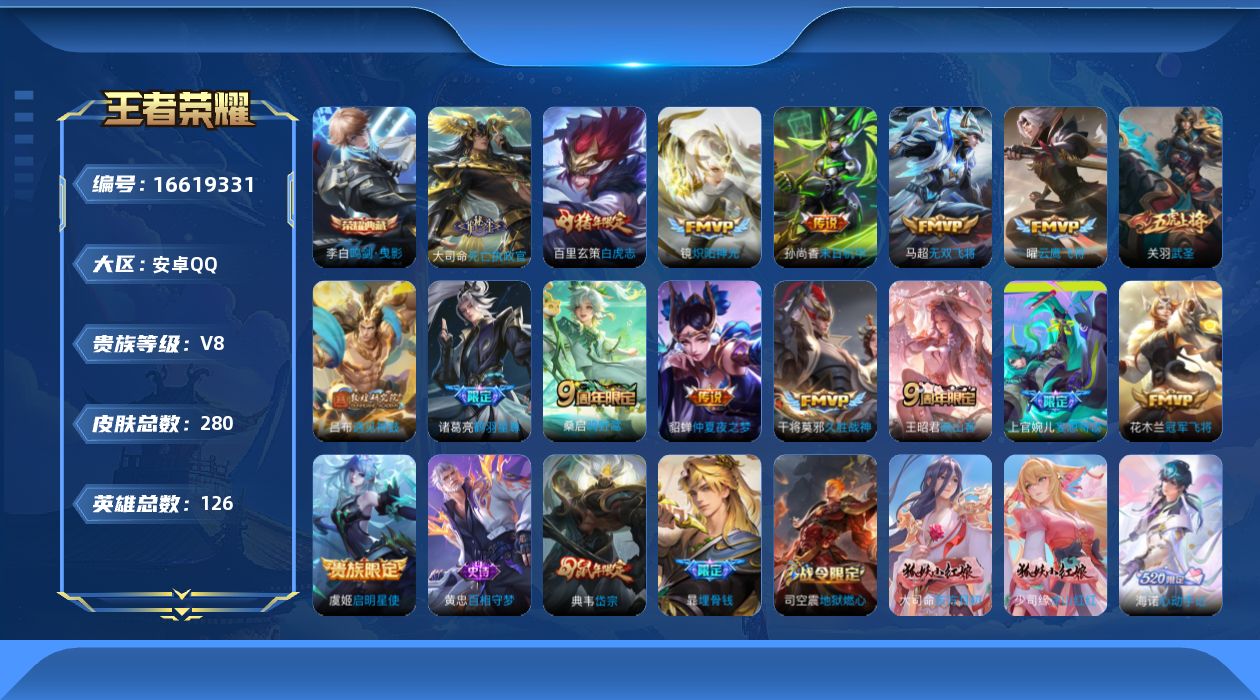 [16619331]安卓Q-V8-最强王者段位-126英雄-280皮肤-1典藏皮肤-17传说-91史诗【英雄全皮】:大司命全皮,海诺全皮【荣耀典藏】:李白鸣剑曳影【传说皮肤】:后羿神树通天,大司命死亡执政官,王昭君映山客,桑启鸣野蒿,吕布遇见神鼓,上官婉儿妄想奇谈,诸葛亮鹤羽星尊,马超无双飞将,镜炽阳神光,虞姬启明星使,关羽武圣,曜云鹰飞将,干将莫邪久胜战神,百里玄策白虎志,花木兰冠军飞将,貂蝉仲夏夜之梦,孙尚香末日机甲【限定皮肤】:暃埋骨钱,蔡文姬夏日便利店,大乔绒语心约,虞姬夏日便利店,姜子牙天穹之誓,杨戬破阵退雄兵,狄仁杰阴阳师,赵云皇家上将,墨子神迹守卫,孙尚香蔷薇恋人,庄周高山流水,高渐离玩趣恶龙,钟无艳超时空战士,孙膑天狼运算者,孙膑寅虎展翼,白起夜都怪侠,芈月幻夜卜梦,吕布遇见神鼓,元歌云间偶戏,元歌无心,甄姬游园惊梦,甄姬落雪兰心,典韦岱宗,狄仁杰魔术师,狄仁杰万华元夜,达摩星际陆战队,达摩沙漠行僧,项羽海滩派对,老夫子醍醐杖,老夫子航海奇遇记,关羽武圣,安琪拉魔法小厨娘,程咬金演武夺筹,韩信傲雪梅枪,王昭君午后时光,兰陵王金庭之子,亚瑟潮玩骑士王,后羿圣弓游侠,李元芳银河之约,李元芳云中旅人,虞姬启明星使,钟馗神迹守卫,钟馗驱傩正仪,干将莫邪真爱魔法,雅典娜单词大作战,鬼谷子原初探秘者,鬼谷子五谷丰年,诸葛亮鹤羽星尊,黄忠火炮绅士,苏烈千军破阵,百里玄策白虎志,弈星混沌棋,梦奇顽趣,沈梦溪大漠名商,明世隐疑决卦,明世隐吟游魔法,裴擒虎李小龙,裴擒虎擒涛扼浪,狂铁电玩高手,米莱狄胡桃异想国,云中君纤云弄巧,伽罗天狼溯光者,上官婉儿梁祝,上官婉儿妄想奇谈,嫦娥拒霜思,蒙犽狂想玩偶喵,鲁班大师探海日志,桑启海盐诗旅,艾琳流音漫舞,司空震地狱燃心,阿古朵江河有灵,张良古海寻踪,蒙犽百解令,高渐离燃音魔法,妲己灵卜魔法,鬼谷子天穹祈灯,沈梦溪龙舞盛年,刘邦剑破天穹,程咬金群星魔术团,关羽决胜骁骑,镜青焰无极,项羽苍威无极,海诺心动手记,芈月浮光幕影,周瑜熔金海岸 【年限皮肤】:百里玄策白虎志,典韦岱宗,孙膑寅虎展翼 【赛季限定】:弈星混沌棋,明世隐疑决卦,老夫子醍醐杖,鬼谷子原初探秘者,狄仁杰万华元夜,程咬金演武夺筹,钟馗驱傩正仪,苏烈千军破阵,达摩沙漠行僧,兰陵王金庭之子,沈梦溪大漠名商,李元芳云中旅人,桑启海盐诗旅,裴擒虎擒涛扼浪,鲁班大师探海日志,张良古海寻踪,鬼谷子天