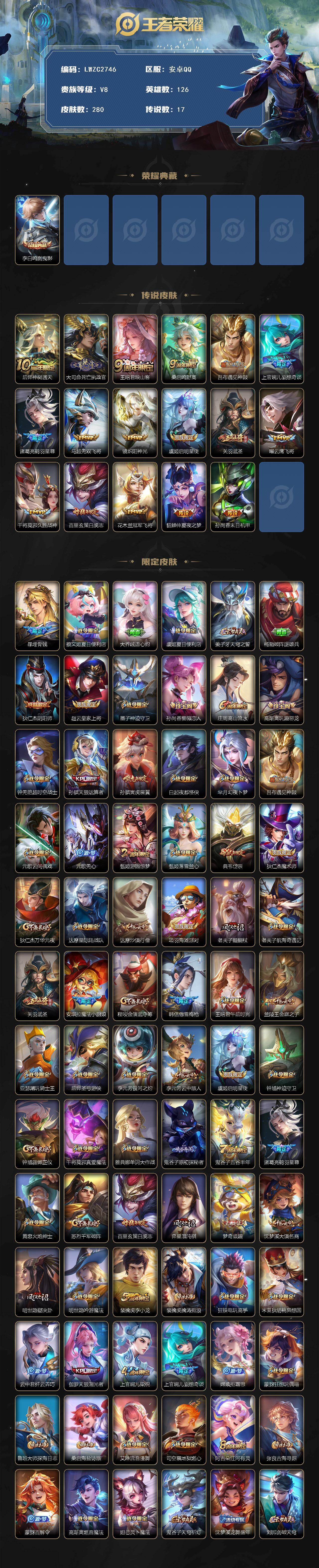 [16619331]安卓Q-V8-最强王者段位-126英雄-280皮肤-1典藏皮肤-17传说-91史诗【英雄全皮】:大司命全皮,海诺全皮【荣耀典藏】:李白鸣剑曳影【传说皮肤】:后羿神树通天,大司命死亡执政官,王昭君映山客,桑启鸣野蒿,吕布遇见神鼓,上官婉儿妄想奇谈,诸葛亮鹤羽星尊,马超无双飞将,镜炽阳神光,虞姬启明星使,关羽武圣,曜云鹰飞将,干将莫邪久胜战神,百里玄策白虎志,花木兰冠军飞将,貂蝉仲夏夜之梦,孙尚香末日机甲【限定皮肤】:暃埋骨钱,蔡文姬夏日便利店,大乔绒语心约,虞姬夏日便利店,姜子牙天穹之誓,杨戬破阵退雄兵,狄仁杰阴阳师,赵云皇家上将,墨子神迹守卫,孙尚香蔷薇恋人,庄周高山流水,高渐离玩趣恶龙,钟无艳超时空战士,孙膑天狼运算者,孙膑寅虎展翼,白起夜都怪侠,芈月幻夜卜梦,吕布遇见神鼓,元歌云间偶戏,元歌无心,甄姬游园惊梦,甄姬落雪兰心,典韦岱宗,狄仁杰魔术师,狄仁杰万华元夜,达摩星际陆战队,达摩沙漠行僧,项羽海滩派对,老夫子醍醐杖,老夫子航海奇遇记,关羽武圣,安琪拉魔法小厨娘,程咬金演武夺筹,韩信傲雪梅枪,王昭君午后时光,兰陵王金庭之子,亚瑟潮玩骑士王,后羿圣弓游侠,李元芳银河之约,李元芳云中旅人,虞姬启明星使,钟馗神迹守卫,钟馗驱傩正仪,干将莫邪真爱魔法,雅典娜单词大作战,鬼谷子原初探秘者,鬼谷子五谷丰年,诸葛亮鹤羽星尊,黄忠火炮绅士,苏烈千军破阵,百里玄策白虎志,弈星混沌棋,梦奇顽趣,沈梦溪大漠名商,明世隐疑决卦,明世隐吟游魔法,裴擒虎李小龙,裴擒虎擒涛扼浪,狂铁电玩高手,米莱狄胡桃异想国,云中君纤云弄巧,伽罗天狼溯光者,上官婉儿梁祝,上官婉儿妄想奇谈,嫦娥拒霜思,蒙犽狂想玩偶喵,鲁班大师探海日志,桑启海盐诗旅,艾琳流音漫舞,司空震地狱燃心,阿古朵江河有灵,张良古海寻踪,蒙犽百解令,高渐离燃音魔法,妲己灵卜魔法,鬼谷子天穹祈灯,沈梦溪龙舞盛年,刘邦剑破天穹,程咬金群星魔术团,关羽决胜骁骑,镜青焰无极,项羽苍威无极,海诺心动手记,芈月浮光幕影,周瑜熔金海岸