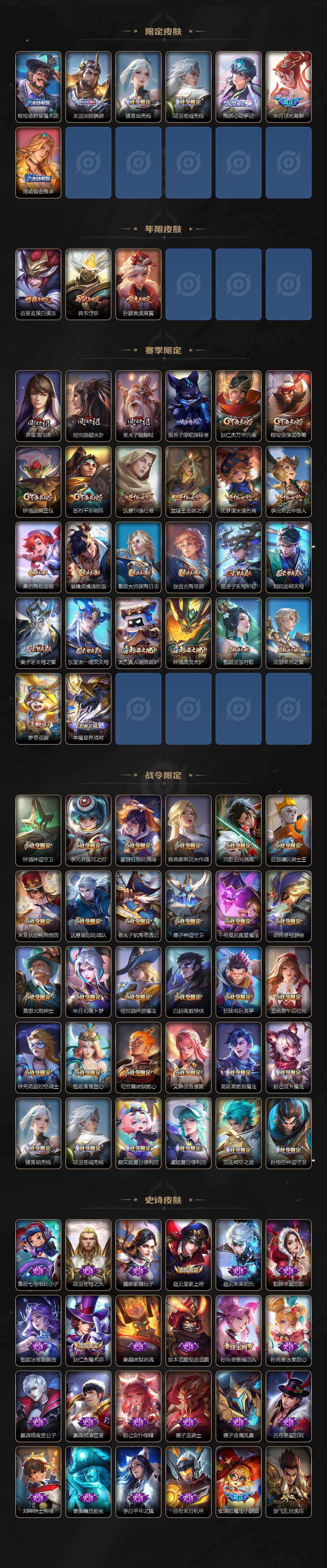 【赛季限定】:弈星混沌棋,明世隐疑决卦,老夫子醍醐杖,鬼谷子原初探秘者,狄仁杰万华元夜,程咬金演武夺筹,钟馗驱傩正仪,苏烈千军破阵,达摩沙漠行僧,兰陵王金庭之子,沈梦溪大漠名商,李元芳云中旅人,桑启海盐诗旅,裴擒虎擒涛扼浪,鲁班大师探海日志,张良古海寻踪,鬼谷子天
