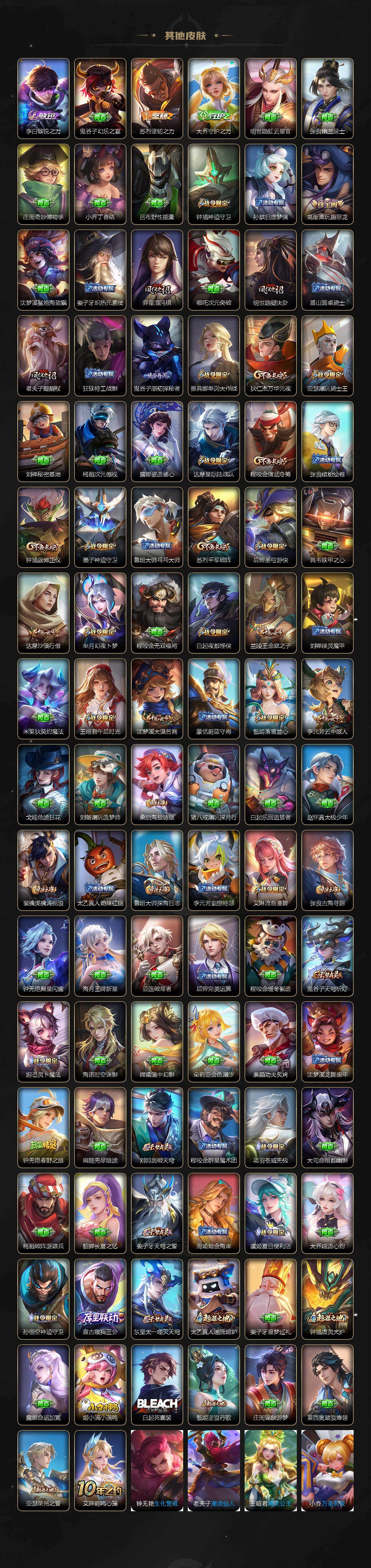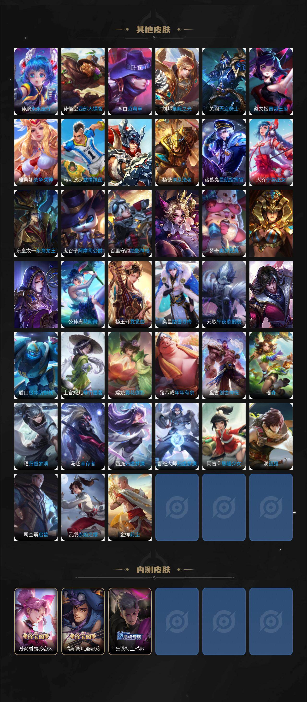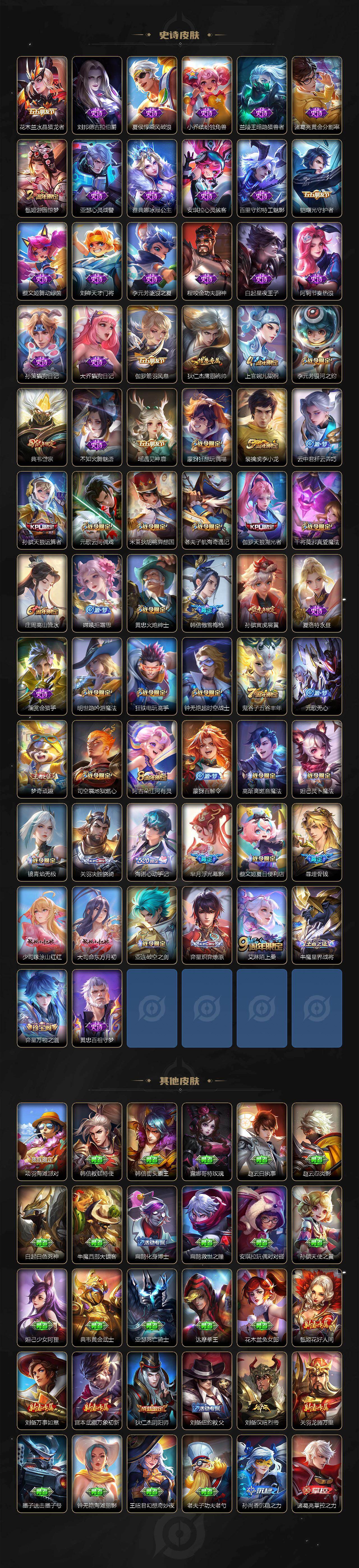 瑶遇见神鹿,伽罗箭羽风息,李元芳逐浪之夏,不知火舞魅语,大乔猫狗日记,孙策猫狗日记,阿轲节奏热浪,露娜紫霞仙子,诸葛亮黄金分割率,项羽苍穹之光,雅典娜冰冠公主,吕布末日机甲,鲁班七号电玩小子,墨子龙骑士,嬴政摇滚巨星,刘禅绅士熊喵,刘禅天才门将,白起星夜王子,安琪拉心灵骇客,程咬金功夫厨神,刘邦德古拉伯爵,兰陵王暗隐猎兽者,曹操幽灵船长,宫本武藏鬼剑武藏,亚瑟心灵战警,蔡文姬舞动绿茵,廉颇地狱岩魂,小乔缤纷独角兽,夏侯惇乘风破浪,花木兰水晶猎龙者,铠曙光守护者,墨子金属风暴,吕布圣诞狂欢,貂蝉圣诞恋歌,百里守约特工魅影,嬴政暗夜贵公子,嫦娥拒霜思,李白千年之狐,夏洛特永昼,澜赏金猎手,蒙犽百解令,高渐离燃音魔法,关羽决胜骁骑,海诺心动手记