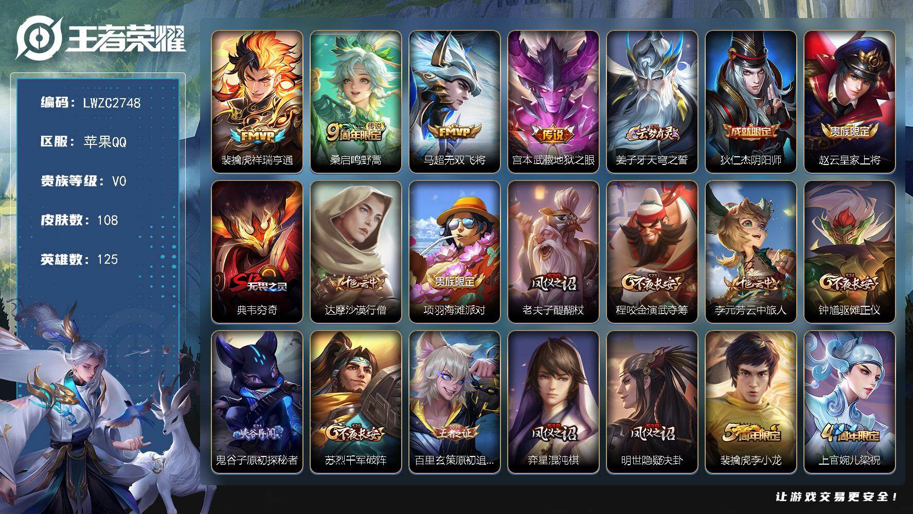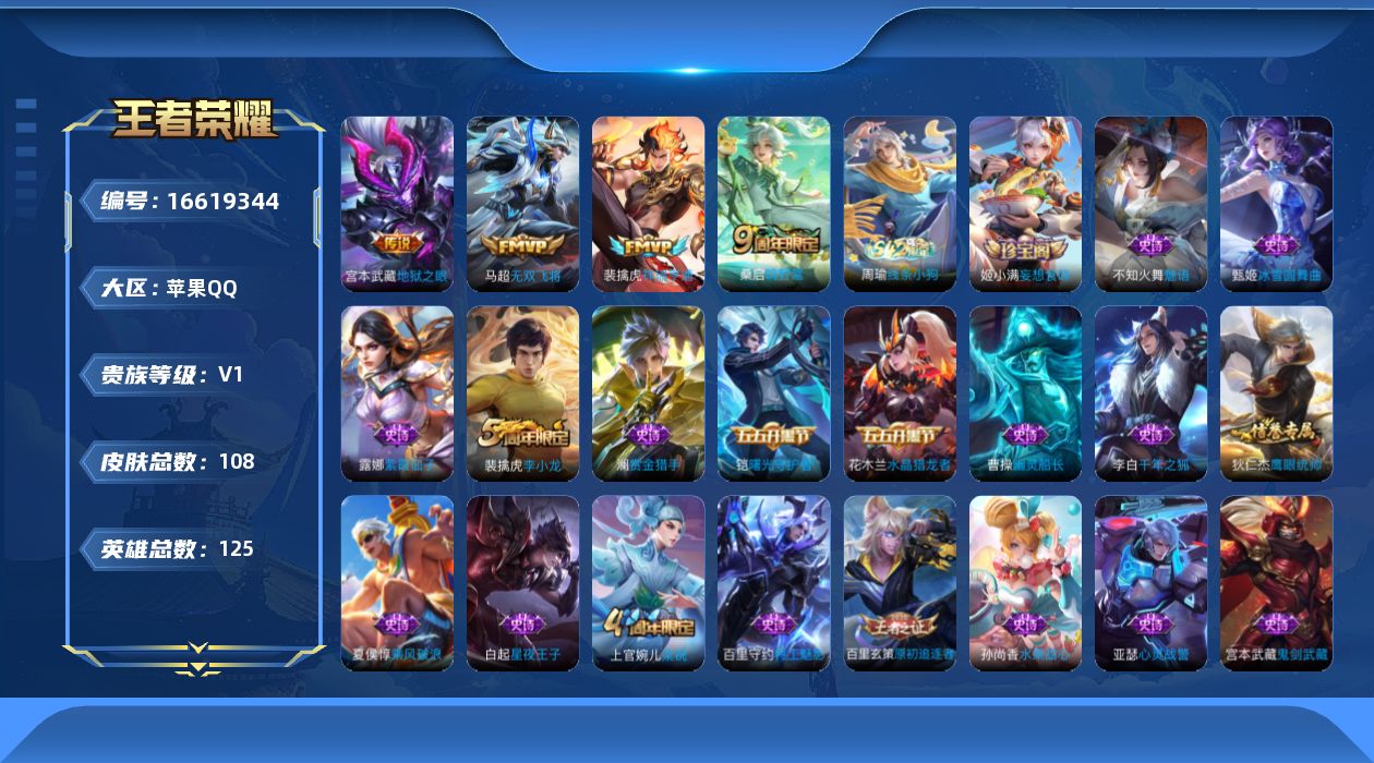 - [12294062]实名: 可修改 贵族等级: V9 英雄数: 125 皮肤数: 261 荣耀水晶: 鸣剑·曳影 无双皮: 器灵·螭龙剑 传说皮: 绛天战甲,炽阳神光,一念神魔,云霓雀翎,末日机甲-孙尚香,地狱火,零号·赤焰,地狱之眼,时之恋人-刘备,无双飞将,山海·炽霜斩,山海·苍雷引,妄想实况,鹤归松栖(云缨),幻光神枪,祥瑞亨通 限定皮: 李小龙,祈雪灵祝,梁祝,御风骁将,时雨天司,龙胆,烈魂,白晶晶,飞衡,凤求凰,至尊宝,默契交锋-兰陵王,默契交锋-花木兰,深海之息,枫霜尽,五谷丰年,诗剑行,山海·玄木吟,鸣野蒿,愿照·九州拓