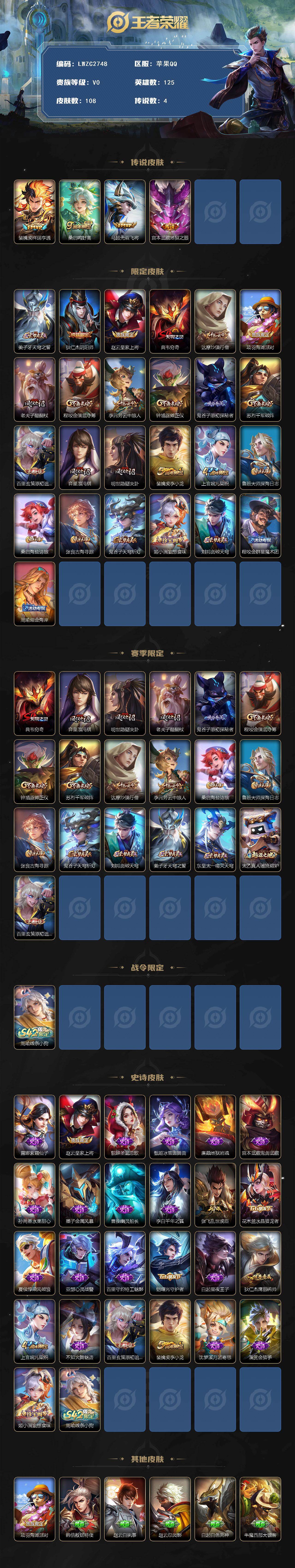 [16620164]苹果Q-V0-至尊星耀V段位-125英雄-108皮肤-4传说-25史诗【英雄全皮】:孙权全皮【传说皮肤】:裴擒虎祥瑞亨通,桑启鸣野蒿,马超无双飞将,宫本武藏地狱之眼【限定皮肤】:姜子牙天穹之誓,狄仁杰阴阳师,赵云皇家上将,典韦穷奇,达摩沙漠行僧,项羽海滩派对,老夫子醍醐杖,程咬金演武夺筹,李元芳云中旅人,钟馗驱傩正仪,鬼谷子原初探秘者,苏烈千军破阵,百里玄策原初追逐者,弈星混沌棋,明世隐疑决卦,裴擒虎李小龙,上官婉儿梁祝,鲁班大师探海日志,桑启海盐诗旅,张良古海寻踪,鬼谷子天穹祈灯,姬小满妄想食味,刘邦剑破天穹,程咬金群星魔术团,周瑜熔金海岸【赛季限定】:典韦穷奇,弈星混沌棋,明世隐疑决卦,老夫子醍醐杖,鬼谷子原初探秘者,程咬金演武夺筹,钟馗驱傩正仪,苏烈千军破阵,达摩沙漠行僧,李元芳云中旅人,桑启海盐诗旅,鲁班大师探海日志,张良古海寻踪,鬼谷子天穹祈灯,刘邦剑破天穹,姜子牙天穹之誓,东皇太一噬灭天穹,太乙真人谧流熔炉,百里玄策原初追逐者【战令限定】:周瑜线条小狗【史诗皮肤】:露娜紫霞仙子,赵云皇家上将,貂蝉圣诞恋歌,甄姬冰雪圆舞曲,廉颇地狱岩魂,宫本武藏鬼剑武藏,孙尚香水果甜心,墨子金属风暴,曹操幽灵船长,李白千年之狐,张飞乱世虎臣,花木兰水晶猎龙者,夏侯惇乘风破浪,亚瑟心灵战警,百里守约特工魅影,铠曙光守护者,白起星夜王子,狄仁杰鹰眼统帅,上官婉儿梁祝,不知火舞魅语,百里玄策原初追逐者,裴擒虎李小龙,沈梦溪月团寄思,澜赏金猎手,姬小满妄想食味,周瑜线条小狗 【其他皮肤】:项羽海滩派对,韩信教廷特使,赵云白执事,赵云忍炎影,白起白色死神,牛魔西部大镖客,扁鹊化身博士,扁鹊救世之瞳,宫本武藏未来纪元,姜子牙时尚教父,妲己少女阿狸,典韦黄金武士,达摩拳王,花木兰兔女郎,宫本武藏万象初新,狄仁杰阴阳师,关羽龙腾万里,宫本武藏霸王丸,老夫子功夫老勺,牛魔制霸全明星,典韦穷奇,李白敏锐之力,大乔守护之力,明世隐虹云星官,小乔丁香结,弈星混沌棋,哪吒次元突破,明世隐疑决卦,盾山圆桌骑士,老夫子醍醐杖,狂铁特工战影,鬼谷子原初探秘者,程咬金演武夺筹,钟馗驱傩正仪,鲁班大师乓乓大师,苏烈千军破阵,达摩沙漠行僧,刘禅唤灵魔甲,李元芳云中旅人,戈娅危途狂花,桑启海盐诗旅,鲁班大师探海日志,张良古海寻踪,后羿完美运算,鬼谷子天穹祈灯,扁鹊无尽旅途,刘邦剑破天穹,程咬金群星魔术团,姜子