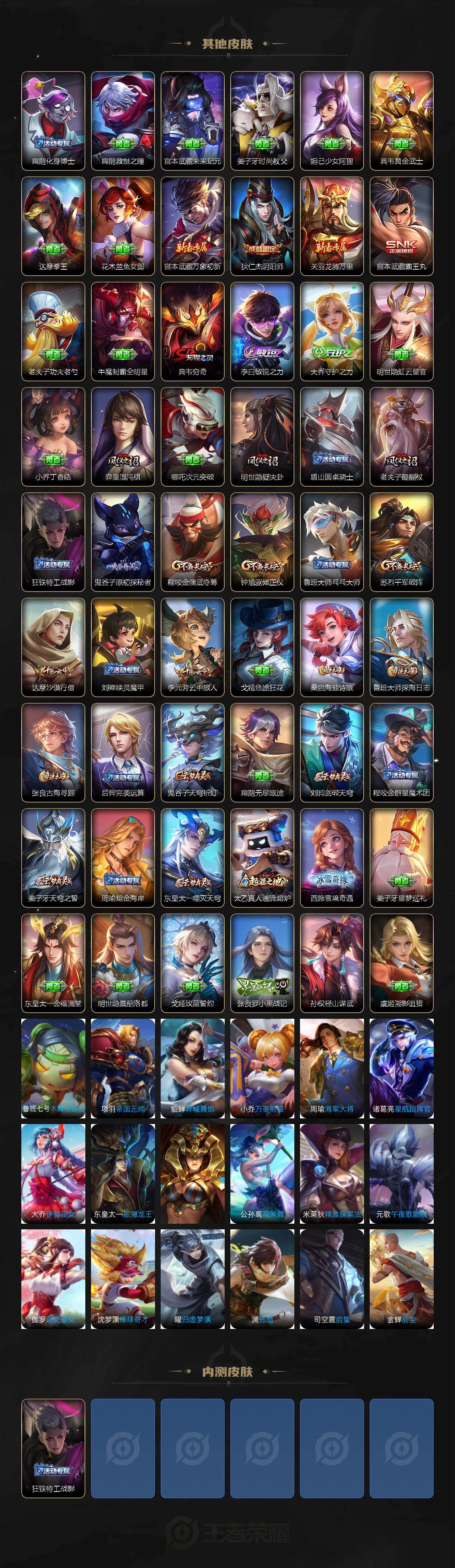 【其他皮肤】:项羽海滩派对,韩信教廷特使,赵云白执事,赵云忍炎影,白起白色死神,牛魔西部大镖客,扁鹊化身博士,扁鹊救世之瞳,宫本武藏未来纪元,姜子牙时尚教父,妲己少女阿狸,典韦黄金武士,达摩拳王,花木兰兔女郎,宫本武藏万象初新,狄仁杰阴阳师,关羽龙腾万里,宫本武藏霸王丸,老夫子功夫老勺,牛魔制霸全明星,典韦穷奇,李白敏锐之力,大乔守护之力,明世隐虹云星官,小乔丁香结,弈星混沌棋,哪吒次元突破,明世隐疑决卦,盾山圆桌骑士,老夫子醍醐杖,狂铁特工战影,鬼谷子原初探秘者,程咬金演武夺筹,钟馗驱傩正仪,鲁班大师乓乓大师,苏烈千军破阵,达摩沙漠行僧,刘禅唤灵魔甲,李元芳云中旅人,戈娅危途狂花,桑启海盐诗旅,鲁班大师探海日志,张良古海寻踪,后羿完美运算,鬼谷子天穹祈灯,扁鹊无尽旅途,刘邦剑破天穹,程咬金群星魔术团,姜子