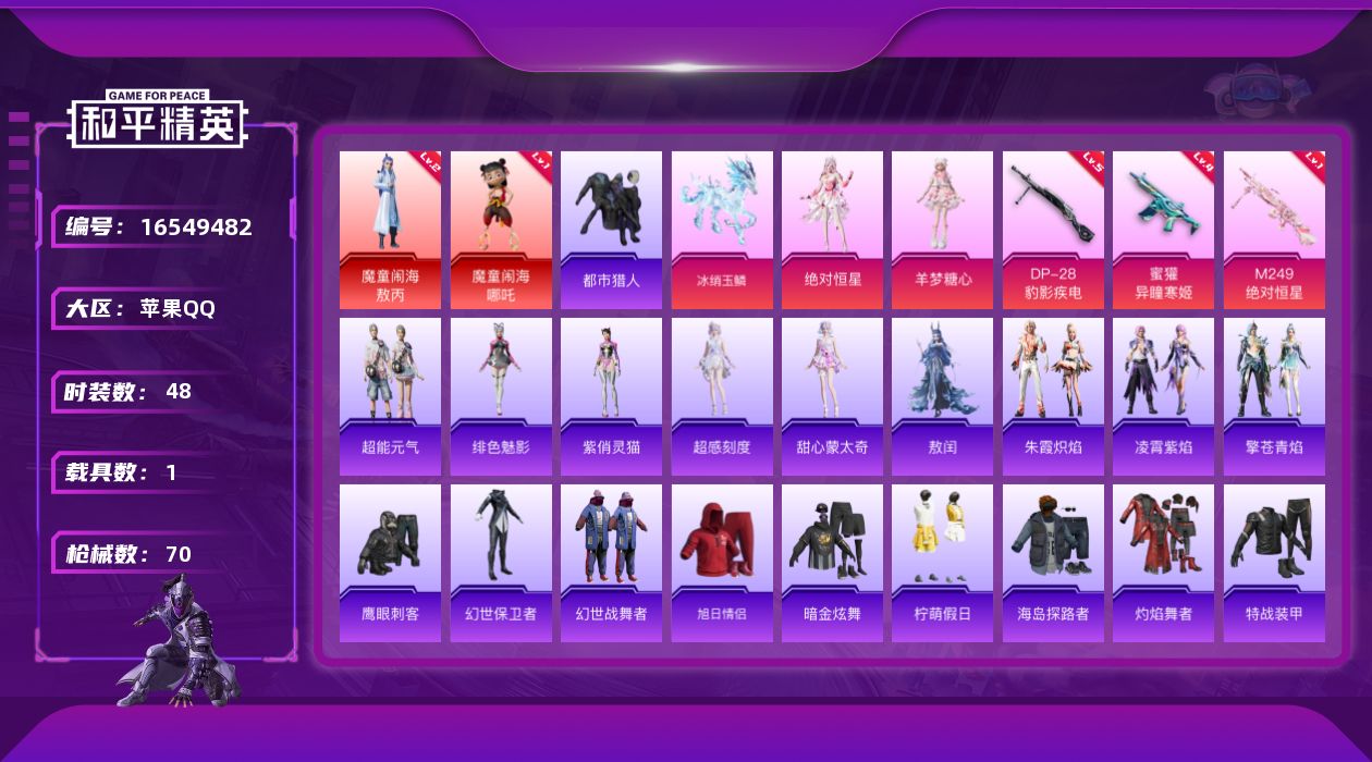 [16549482]【特价出售/店主推荐】苹果 手Q-2神装-2粉装-3特效枪-1载具-4粉色飞行器-22779热力值-3王牌印记-48套装-70枪皮【红色神装等级】:魔童闹海-敖丙(二级),魔童闹海-哪吒(一级)【红色角色神装】:魔童闹海-敖丙,魔童闹海-哪吒【热门品类】:套装-都市猎人【粉色套装】:角色-绝对恒星,角色-羊梦糖心【粉色枪皮等级】:蜜獾-异瞳寒姬(四级),M249-绝对恒星(一级),DP-28-豹影疾电(五级)【粉色载具】:冰绡玉鳞【粉色枪皮】:蜜獾-异瞳寒姬,M249-绝对恒星,DP-28-豹影疾电【粉色飞行器】:绝对恒星飞行器,飞天猪飞行器,灵珠游龙飞行器