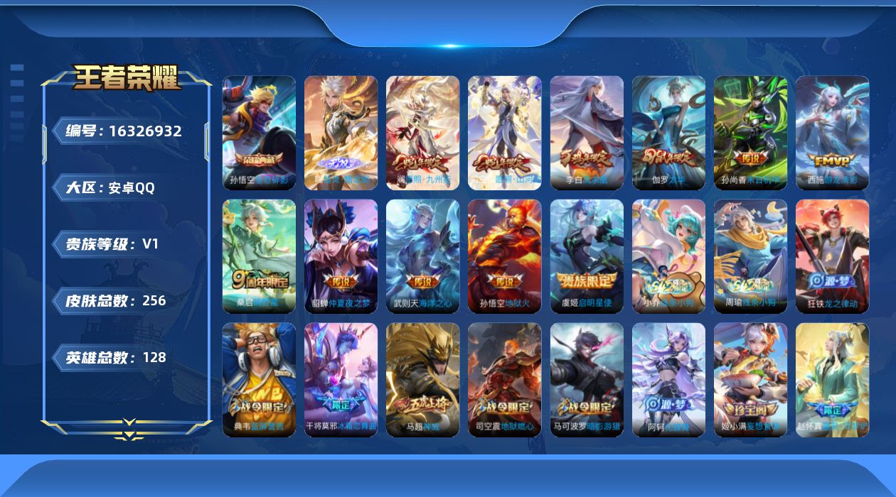 [16326932]可二次【店主推荐捡漏号!可直接换绑】安卓Q-V1-永恒钻石IV段位-126英雄-245皮肤-1典藏皮肤-1典藏英雄-1无双-12传说-75史诗