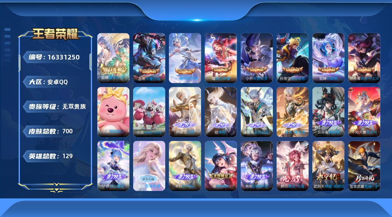 [16331250]极品无双V10!满无双!满珍品!安卓Q-V11-永恒钻石III段位-129英雄-700皮肤-7典藏皮肤-1典藏英雄-1珍品无双-13无双-9珍品传说-120传说-237史诗-12星传说-127按键
