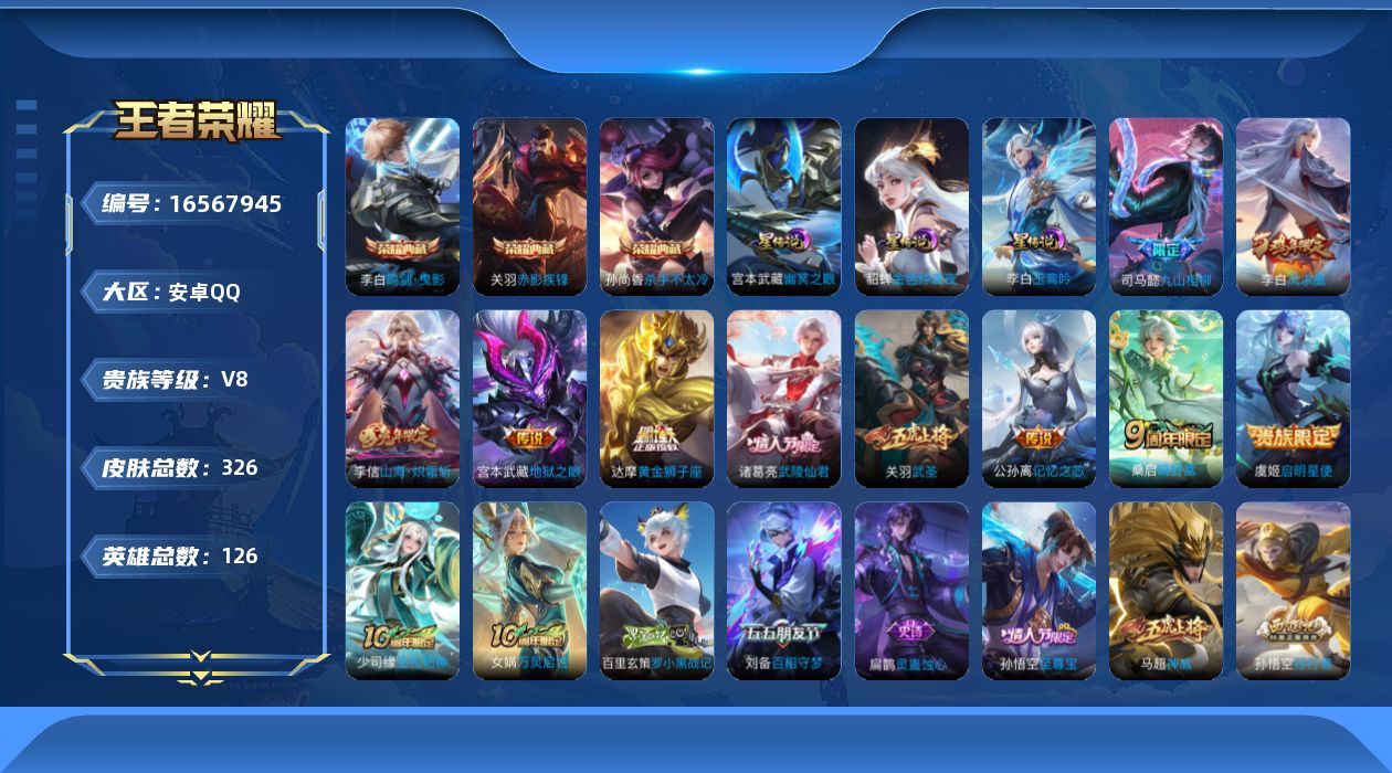 [16567945]【店主推荐捡漏号!可直接换绑】安卓Q-V8-最强王者段位39段对抗路小国标哪吒-126英雄-326皮肤-3典藏皮肤-11传说-85史诗-3星元 【英雄全皮】:孙权全皮,蒙恬全皮,空空儿全皮 【荣耀典藏】:孙尚香杀手不太冷,李白鸣剑曳影,关羽赤影疾锋 【传说皮肤】:后羿神树通天,司马懿九山相柳,桑启鸣野蒿,公孙离记忆之芯,李信山海炽霜斩,虞姬启明星使,关羽武圣,达摩黄金狮子座,诸葛亮武陵仙君,李白凤求凰,宫本武藏地狱之眼 【限定皮肤】:白起狰,姜子牙天穹之誓,狄仁杰阴阳师,虞姬凯尔特女王,赵云皇家上将,嬴政优雅恋人,庄周蜃楼王,庄周高山流水,高渐离死亡摇滚,高渐离玩趣恶龙,孙膑妖精王,扁鹊炼金王,芈月重明,芈月幻夜卜梦,元歌云间偶戏,元歌无心,甄姬游园惊梦,曹操烛龙,典韦穷奇,马可波罗暗影游猎,马可波罗山海玄木吟,狄仁杰魔术师,狄仁杰万华元夜,达摩星际陆战队,达摩沙漠行僧,项羽海滩派对,老夫子醍醐杖,关羽冰锋战神,关羽武圣,程咬金演武夺筹,韩信傲雪梅枪,兰陵王金庭之子,花木兰青春决赛季,亚瑟潮玩骑士王,孙悟空至尊宝,孙悟空孙行者,牛魔御旌,后羿圣弓游侠,刘备百相守梦,李元芳云中旅人,虞姬启明星使,钟馗驱傩正仪,杨玉环遇见飞天,哪吒逐梦之翼,干将莫邪真爱魔法,雅典娜单词大作战,雅典娜黎明之约,太乙真人饕餮,鬼谷子原初探秘者,鬼谷子五谷丰年,诸葛亮武陵仙君,黄忠火炮绅士,苏烈千军破阵,百里玄策原初追逐者,弈星混沌棋,梦奇顽趣,沈梦溪大漠名商,明世隐疑决卦,裴擒虎李小龙,裴擒虎擒涛扼浪,狂铁御狮,米莱狄御霄,米莱狄胡桃异想国,云中君纤云弄巧,李信山海炽霜斩,盾山御銮,猪八戒西部大镖客,猪八戒猪悟能,嫦娥拒霜思,蒙犽狂想玩偶喵,鲁班大师探海日志,桑启海盐诗旅,艾琳流音漫舞,司空震地狱燃心,阿古朵江河有灵,张良古海寻踪,蒙犽百解令,蒙恬荣光圣徽,鬼谷子天穹祈灯,沈梦溪龙舞盛年,刘邦剑破天穹,周瑜熔金海岸 【年限皮肤】:李白凤求凰,马超神威,关羽武圣,马可波罗山海玄木吟,李信山海炽霜斩 【赛季限定】:庄周蜃楼王,孙膑妖精王,扁鹊炼金王,白起狰,芈月重明,曹操烛龙,典韦穷奇,狄仁杰万华元夜,达摩沙漠行僧,老夫子醍醐杖,程咬金演武夺筹,兰陵王金庭之子,张良古海寻踪,牛魔御旌,李元芳云中旅人,虞姬凯尔特女王,钟馗驱傩正仪,雅典娜黎明之约,太乙真人饕餮,鬼谷子原初探秘者,苏烈千军破阵,