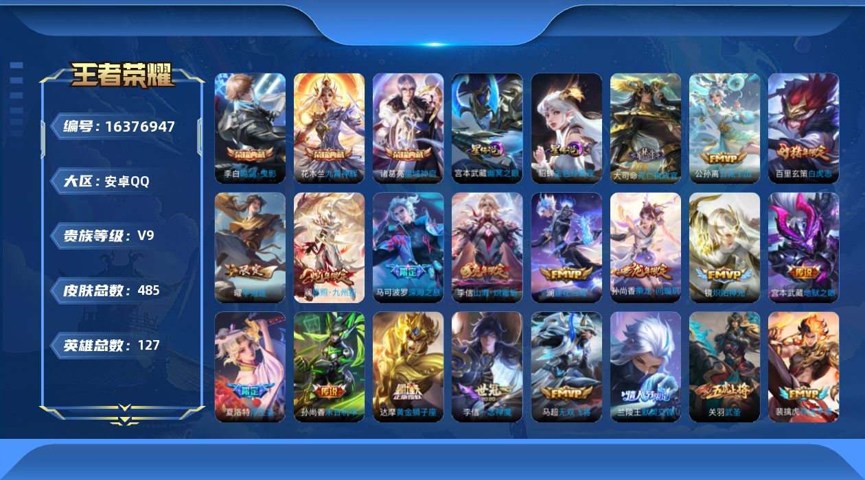 [16376947]【特价出售/店主推荐】安卓Q-V9-最强王者段位-127英雄-485皮肤-3典藏皮肤-46传说-154史诗