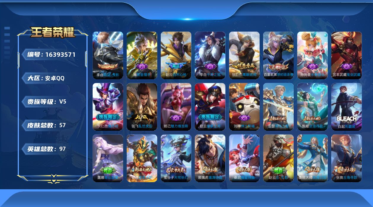 [16393571]【店主推荐捡漏号!可直接换绑】安卓Q-V5-最强王者段位-97英雄-57皮肤-1典藏皮肤-12史诗 【荣耀典藏】:李白鸣剑曳影 【限定皮肤】:狄仁杰阴阳师,赵云皇家上将,赵云百木心枪,狄仁杰魔术师,项羽海滩派对,兰陵王金庭之子,百里玄策原初追逐者,沈梦溪大漠名商,裴擒虎擒涛扼浪,鲁班大师探海日志,桑启海盐诗旅,张良古海寻踪,鬼谷子天穹祈灯 【赛季限定】:兰陵王金庭之子,张良古海寻踪,百里玄策原初追逐者,沈梦溪大漠名商,裴擒虎擒涛扼浪,鲁班大师探海日志,桑启海盐诗旅,鬼谷子天穹祈灯 【史诗皮肤】:赵云皇家上将,狄仁杰魔术师,宫本武藏鬼剑武藏,孙尚香水果甜心,妲己魅力维加斯,刘禅绅士熊喵,李白千年之狐,张飞乱世虎臣,狄仁杰鹰眼统帅,百里玄策原初追逐者,赵云百木心枪,澜赏金猎手 【其他皮肤】:项羽海滩派对,韩信教廷特使,露娜哥特玫瑰,达摩大发明家,赵云忍炎影,程咬金星际陆战队,亚瑟死亡骑士,花木兰兔女郎,甄姬花好人间,刘备万事如意,宫本武藏万象初新,后羿阿尔法小队,狄仁杰阴阳师,关羽龙腾万里,王昭君幻想奇妙夜,苏烈坚韧之力,吕布野性能量,兰陵王金庭之子,沈梦溪大漠名商,桑启海盐诗旅,裴擒虎擒涛扼浪,莱西奥西部游侠,鲁班大师探海日志,张良古海寻踪,兰陵王幻夜行动,鬼谷子天穹祈灯,钟馗虚灵犬护,露娜命运加冕,白起死霸装,甄姬逆浪荇歌,亚瑟荣光之誓,曹操死神来了,后羿精灵王,马可波罗激情绿茵,鬼谷子阿摩司公爵,铠龙域领主,公孙离花间舞,杨玉环霓裳曲,伽罗花见巫女,曜归虚梦演,马超幸存者,澜孤猎,司空震启蛰,云缨赤焰之缨 【营地ID】:1791985759