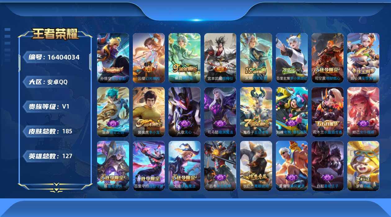 [16404034]【特价出售/店主推荐】安卓Q-V0-永恒钻石I段位-127英雄-185皮肤-1典藏皮肤-4传说-44史诗