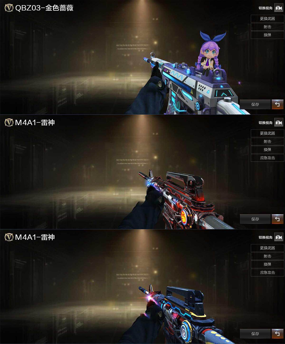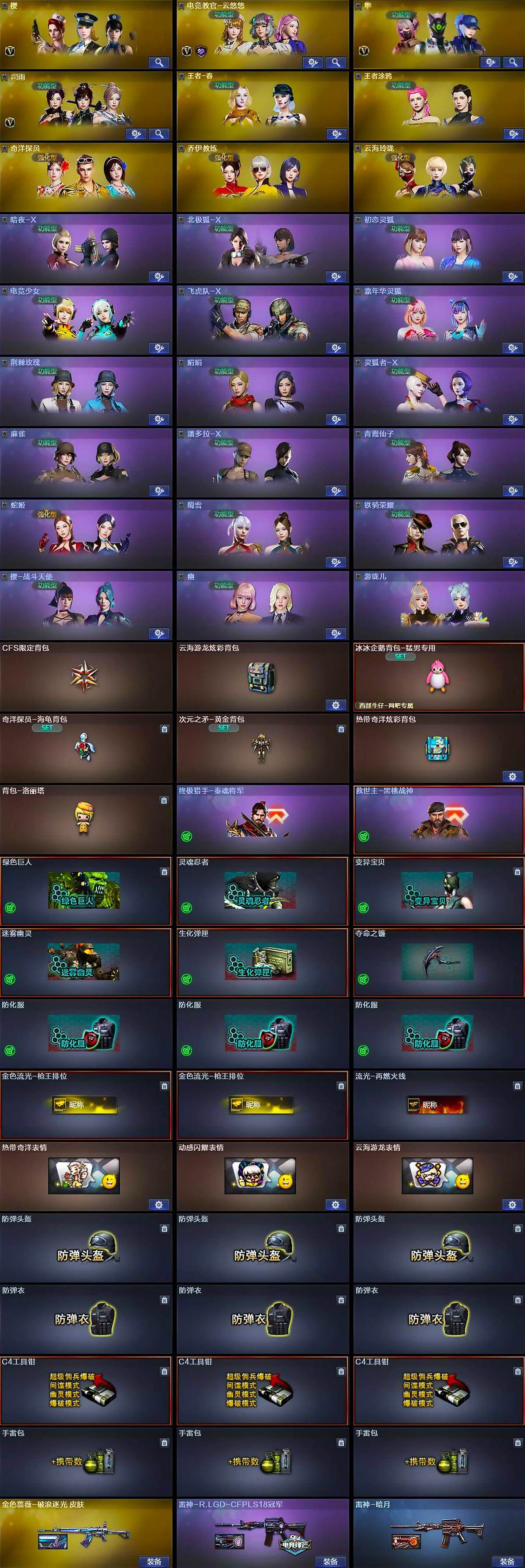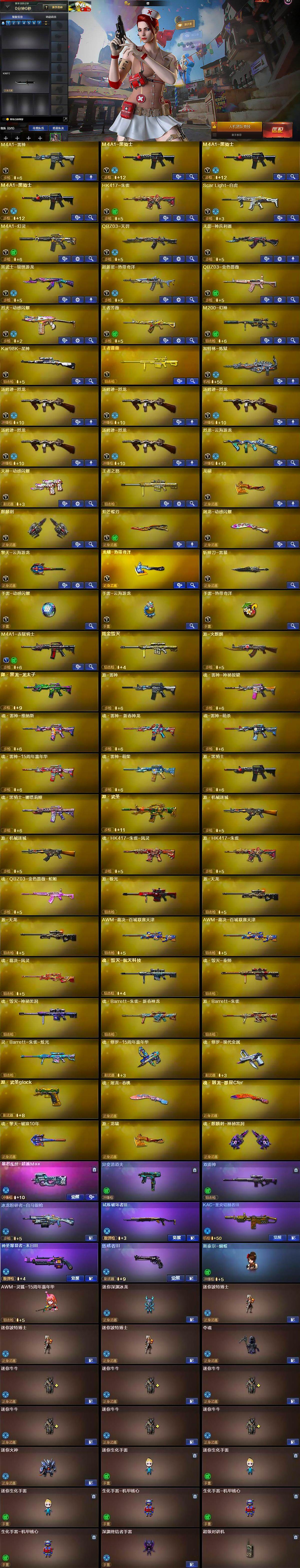 【英雄级武器】:M4A1-雷神,M4A1-黑骑士*3,HK417-朱雀,Scar Light-白虎,M4A1-幻灵,QBZ03-天罚,无影-神兵利器,黑武士-锦绣游龙,超新星-热带奇洋,QBZ03-金色蔷薇,烈火-动感闪耀,王者芳薇-觉醒版,M200-幻神,Kar98K-星神,王者蔷薇-觉醒版,加特林-炼狱,汤姆逊-烈龙*5,烈龙-云海游龙,天神-动感闪耀,龙啸,麒麟刺,炽芒蝶刃,屠龙-动感闪耀,擎天-云海游龙,龙啸-热带奇洋,斩神刀-雷暴,手雷-动感闪耀,手雷-云海游龙,手雷-热带奇洋,M4A1-赤狱骑士