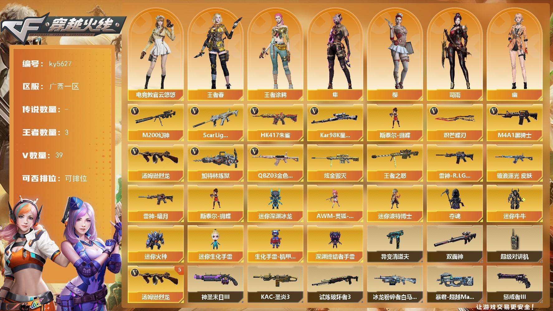 [16630172]广西一区-38V-3王者武器数-1炫金武器数 【热门武器】:QBZ03-金色蔷薇,Scar Light-白虎,HK417-朱雀,M200-幻神,Kar98K-星神,M4A1-黑骑士*3,汤姆逊-烈龙*5,加特林-炼狱,斯泰尔-蝴蝶,炽芒蝶刃 【王者炫金武器】:王者之怒,炫金毁灭 【皮肤】:金色蔷薇-破浪逐光 皮肤,雷神-暗月,雷神-R.LGD-CFPLS18冠军 【角色】:樱,电竞教官-云悠悠,隼,司雨,王者春,王者涂鸦,奇洋探员,乔伊教练,云海玲珑,暗夜-X,北极狐-X,初恋灵狐,电竞少女,飞虎队-X,嘉年华灵狐,荆棘玫瑰,娟娟,卡塔琳娜,灵狐者-X,麻雀,潘多拉-X,青霞仙子,蛇姬,蜀雪,铁骑荣耀,樱-战斗天使,幽,游珑儿 【人偶武器】:斯泰尔-蝴蝶,AWM-灵狐-15周年嘉年华,迷你深渊冰龙,迷你波特博士*3,夺魂,迷你牛牛*6,迷你火种,迷你生化手雷*3,生化手雷-机甲核心*3,深渊终结者手雷 【暴走生化】:异变清道夫,双面神,超级对讲机 【挑战大师】:暴君乱世-超越Max,冰龙粉碎者-白马银枪,试炼破坏者III,KAC-圣炎切割者III,神圣爆裂者-末日III,惩戒者III 【英雄级武器】:M4A1-雷神,M4A1-黑骑士*3,HK417-朱雀,Scar Light-白虎,M4A1-幻灵,QBZ03-天罚,无影-神兵利器,黑武士-锦绣游龙,超新星-热带奇洋,QBZ03-金色蔷薇,烈火-动感闪耀,王者芳薇-觉醒版,M200-幻神,Kar98K-星神,王者蔷薇-觉醒版,加特林-炼狱,汤姆逊-烈龙*5,烈龙-云海游龙,天神-动感闪耀,龙啸,麒麟刺,炽芒蝶刃,屠龙-动感闪耀,擎天-云海游龙,龙啸-热带奇洋,斩神刀-雷暴,手雷-动感闪耀,手雷-云海游龙,手雷-热带奇洋,M4A1-赤狱骑士 【道具】:CFS限定背包,云海游龙炫彩背包,冰冰企鹅背包-猛男专用,奇洋探员-海龟背包,次元之矛-黄金背包,热带奇洋炫彩背包,背包-洛丽塔,哔哩哔哩名片,终极猎手-秦魂将军,救世主-黑桃战神,绿色巨人,灵魂忍者,变异宝贝,迷雾幽灵,生化弹匣,夺命之镰,防化服*3,金色流光-枪王排位*2,流光-再燃火线,热带奇洋表情,动感闪耀表情,云海游龙表情,防弹头盔*3,防弹衣*3,C4工具钳*3,手雷包*3 【特殊枪械】:蝴蝶斯泰尔+5烈龙,1白虎,3黑骑士,5烈龙,1炼狱,1蝴蝶斯泰尔
