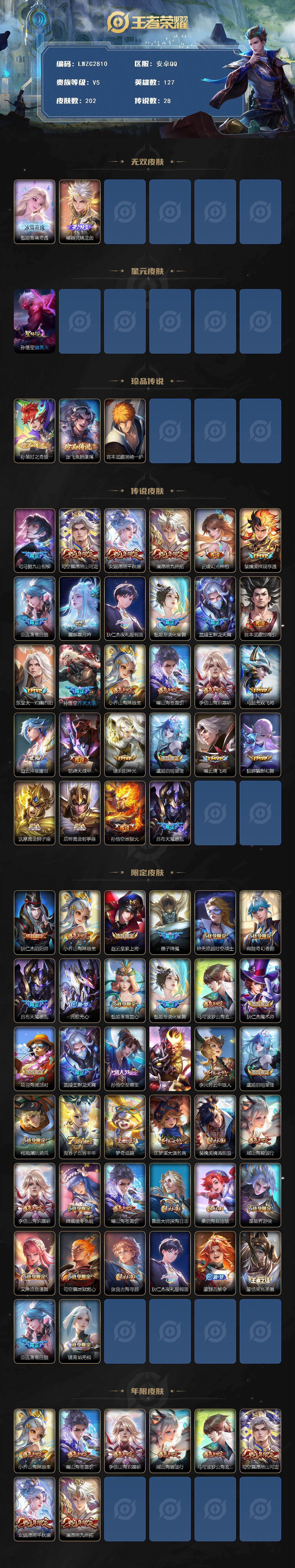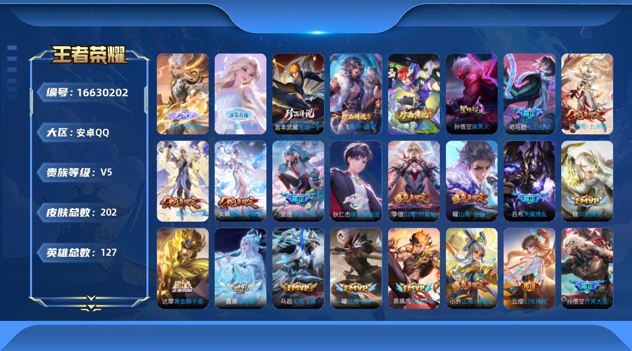 [16630202]【特价出售/店主推荐】游走39段、打野32段、金标廉颇、金标牛魔、金标墨子、10银标,安卓Q-V5-至尊星耀V段位-127英雄-202皮肤-2无双-3珍品传说-1星传说-28传说-65史诗 【英雄全皮】:司马懿全皮,司空震全皮,空空儿全皮 【无双皮肤】:甄姬雪境奇遇,曜器灵螭龙剑 【珍品传说】:孙策时之奇旅,张飞兔狲蓬尾,宫本武藏黑崎一护 【传说皮肤】:司马懿九山相柳,司空震愿照山河定,女娲愿照千秋盛,澜愿照九州拓,云缨幻光神枪,裴擒虎祥瑞亨通,亚连落雪白狼,露娜霜月吟,狄仁杰夜礼服假面,甄姬至美化雀舞,兰陵王影龙天霄,宫本武藏惊梅引,东皇太一灼幽烈阳,孙悟空齐天大圣,小乔山海琳琅生,曜山海苍雷引,李信山海炽霜斩,马超无双飞将,赵云淬星耀世,铠绛天战甲,镜炽阳神光,虞姬启明星使,曜云鹰飞将,貂蝉猫影幻舞,达摩黄金狮子座,后羿黄金射手座,孙悟空地狱火,吕布天魔缭乱 【限定皮肤】:狄仁杰阴阳师,小乔山海琳琅生,赵云皇家上将,墨子降魔,钟无艳超时空战士,扁鹊奇幻香踪,吕布天魔缭乱,元歌无心,甄姬落雪兰心,甄姬至美化雀舞,马可波罗山海玄木吟,狄仁杰魔术师,项羽海滩派对,兰陵王影龙天霄,孙悟空至尊宝,孙悟空齐天大圣,李元芳云中旅人,虞姬启明星使,杨戬潮玩骑兵,鬼谷子五谷丰年,梦奇顽趣,沈梦溪大漠名商,裴擒虎擒涛扼浪,瑶山海碧波行,李信山海炽霜斩,嫦娥暖冬兔眠,曜山海苍雷引,鲁班大师探海日志,桑启海盐诗旅,暃星界游侠,艾琳流音漫舞,司空震地狱燃心,张良古海寻踪,狄仁杰夜礼服假面,蒙犽百解令,蒙恬荣光圣徽,亚连落雪白狼,镜青焰无极 【年限皮肤】:小乔山海琳琅生,曜山海苍雷引,李信山海炽霜斩,瑶山海碧波行,马可波罗山海玄木吟,司空震愿照山河定,女娲愿照千秋盛,澜愿照九州拓 【赛季限定】:沈梦溪大漠名商,李元芳云中旅人,桑启海盐诗旅,裴擒虎擒涛扼浪,鲁班大师探海日志,张良古海寻踪,太乙真人谧流熔炉,钟馗虚灵犬护,甄姬逆浪荇歌,亚瑟荣光之誓,梦奇顽趣,蒙恬荣光圣徽,项羽九幽镇关 【战令限定】:钟无艳超时空战士,甄姬落雪兰心,暃星界游侠,嫦娥暖冬兔眠,扁鹊奇幻香踪,杨戬潮玩骑兵,司空震地狱燃心,艾琳流音漫舞,镜青焰无极,周瑜百相守梦,孙策百相守梦,周瑜线条小狗 【史诗皮肤】:鲁班七号电玩小子,项羽苍穹之光,赵云皇家上将,赵云未来纪元,貂蝉圣诞恋歌,甄姬冰雪圆舞曲,王昭君偶像歌手,狄仁杰