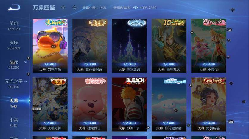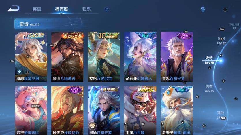 【史诗皮肤】:鲁班七号电玩小子,项羽苍穹之光,赵云皇家上将,赵云未来纪元,貂蝉圣诞恋歌,甄姬冰雪圆舞曲,王昭君偶像歌手,狄仁杰