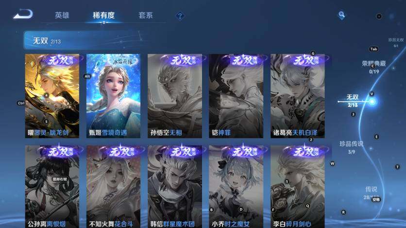 达摩黄金狮子座,铠绛天战甲,貂蝉猫影幻舞,曜云鹰飞将,镜炽阳神光,赵云淬星耀世,马超无双飞将,宫本武藏惊梅引,狄仁杰夜礼服假面,露娜霜月吟,亚连落雪白狼,裴擒虎祥瑞亨通,云缨幻光神枪