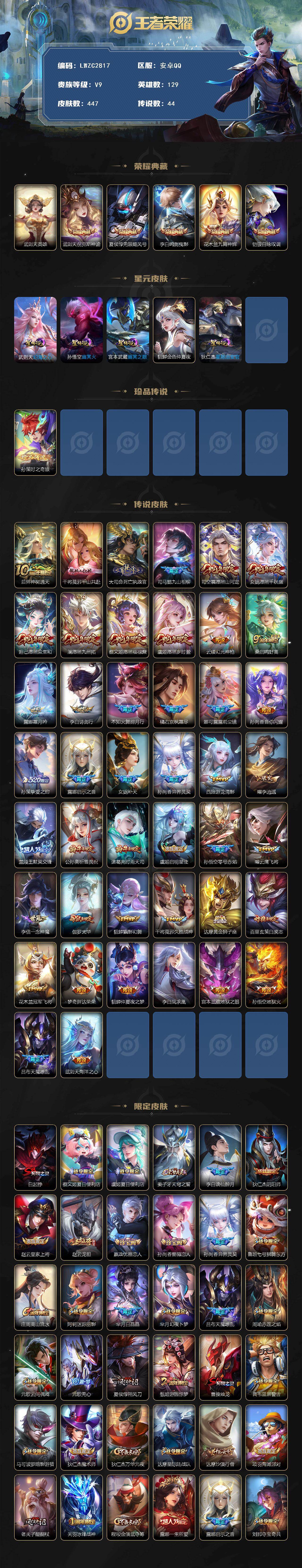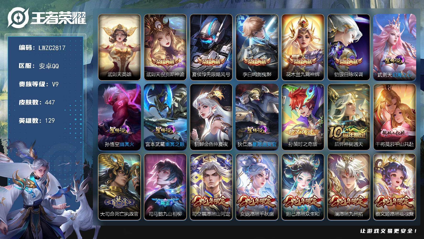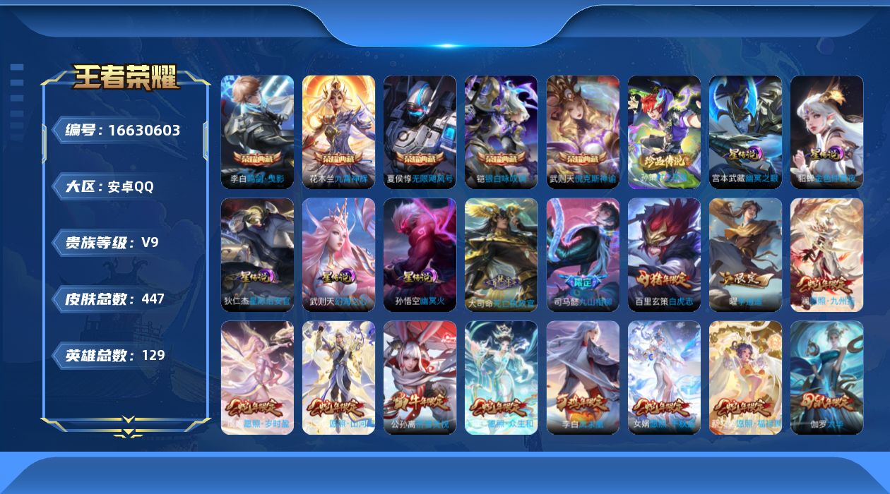 [16630603]可二次【特价出售/店主推荐】打野30段,3银标,安卓Q-V9-至尊星耀I段位-129英雄-447皮肤-5典藏皮肤-1典藏英雄-1珍品传说-5星传说-44传说-129史诗 【英雄全皮】:达摩全皮,司马懿全皮,露娜全皮,刘邦全皮,孙权全皮,娜可露露全皮,橘右京全皮,钟馗全皮,女娲全皮,鬼谷子全皮,大司命全皮,空空儿全皮,影全皮,少司缘全皮 【荣耀典藏】:武则天英雄,武则天倪克斯神谕,夏侯惇无限飓风号,李白鸣剑曳影,花木兰九霄神辉,铠银白咏叹调 【珍品传说】:孙策时之奇旅 【传说皮肤】:后羿神树通天,干将莫邪千山共赴,大司命死亡执政官,司马懿九山相柳,司空震愿照山河定,女娲愿照千秋盛,妲己愿照众生和,澜愿照九州拓,蔡文姬愿照福禄聚,虞姬愿照岁时盈,云缨幻光神枪,桑启鸣野蒿,露娜霜月吟,李白诗剑行,不知火舞绯月行,橘右京枫霜尽,娜可露露前尘镜,孙尚香音你闪耀,孙策挚爱之约,露娜启示之音,女娲补天,孙尚香异界灵契,西施游龙清影,曜李逍遥 ,兰陵王默契交锋,公孙离祈雪灵祝,诸葛亮时雨天司,虞姬启明星使,孙悟空零号赤焰,曜云鹰飞将,李信一念神魔,伽罗太华,貂蝉猫影幻舞,干将莫邪久胜战神,达摩黄金狮子座,百里玄策白虎志,花木兰冠军飞将,梦奇胖达荣荣,貂蝉仲夏夜之梦,李白凤求凰,宫本武藏地狱之眼,孙悟空地狱火,吕布天魔缭乱,武则天海洋之心 【限定皮肤】:白起狰,蔡文姬夏日便利店,虞姬夏日便利店,姜子牙天穹之誓,李白谪仙醉月,狄仁杰阴阳师,赵云皇家上将,赵云龙胆,嬴政优雅恋人,孙尚香蔷薇恋人,孙尚香异界灵契,鲁班七号狮舞东方,庄周高山流水,阿轲迷踪丽影,芈月白晶晶,芈月幻夜卜梦,吕布天魔缭乱,周瑜赤莲之焰,元歌云间偶戏,元歌无心,夏侯惇朔风刀,甄姬游园惊梦,曹操烛龙,典韦蓝屏警告,马可波罗暗影游猎,狄仁杰魔术师,狄仁杰万华元夜,达摩星际陆战队,达摩沙漠行僧,项羽海滩派对,老夫子醍醐杖,关羽冰锋战神,程咬金演武夺筹,露娜一生所爱,露娜启示之音,刘邦夺宝奇兵,王昭君凤凰于飞,兰陵王默契交锋,兰陵王驯魔猎人,兰陵王金庭之子,不知火舞绯月行,娜可露露前尘镜,橘右京枫霜尽,孙悟空至尊宝,孙悟空大圣娶亲,孙悟空零号赤焰,牛魔御旌,李元芳银河之约,李元芳云中旅人,虞姬启明星使,钟馗神迹守卫,钟馗驱傩正仪,杨玉环遇见飞天,女娲朔望之晖,女娲补天,雅典娜单词大作战,雅典娜黎明之约,蔡文姬繁星吟游,太乙