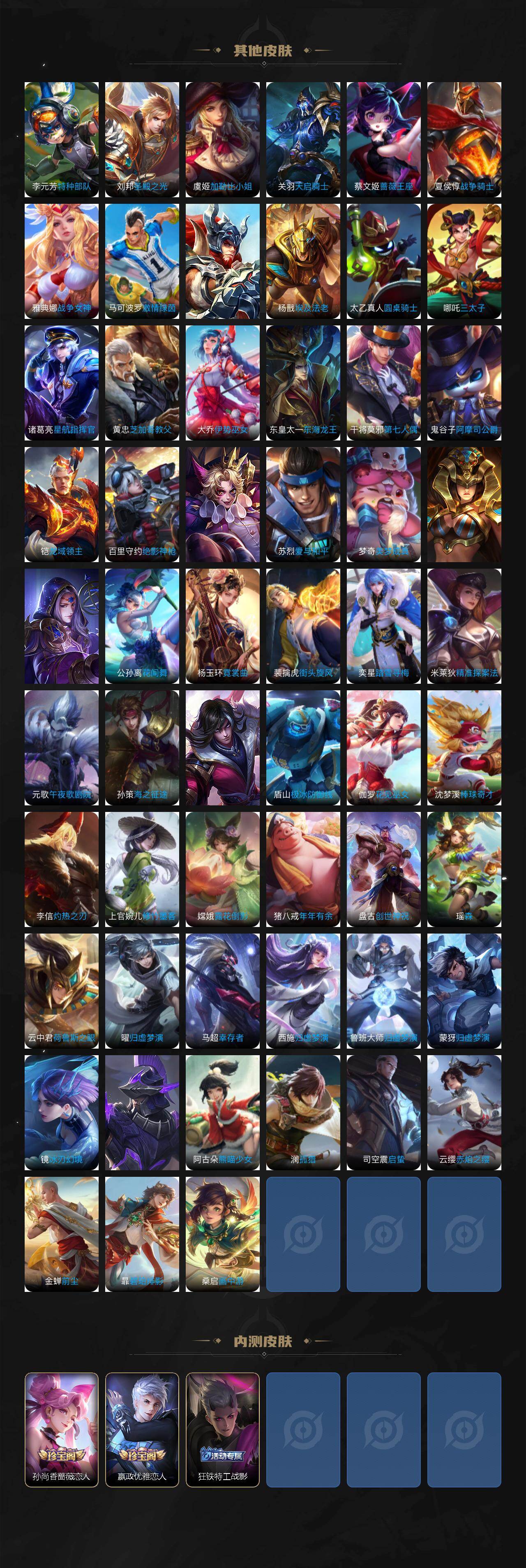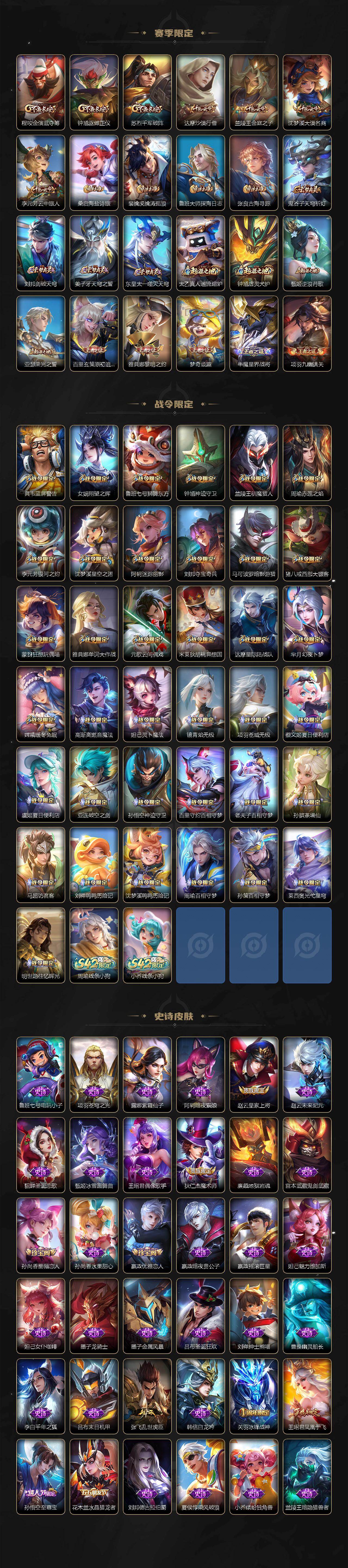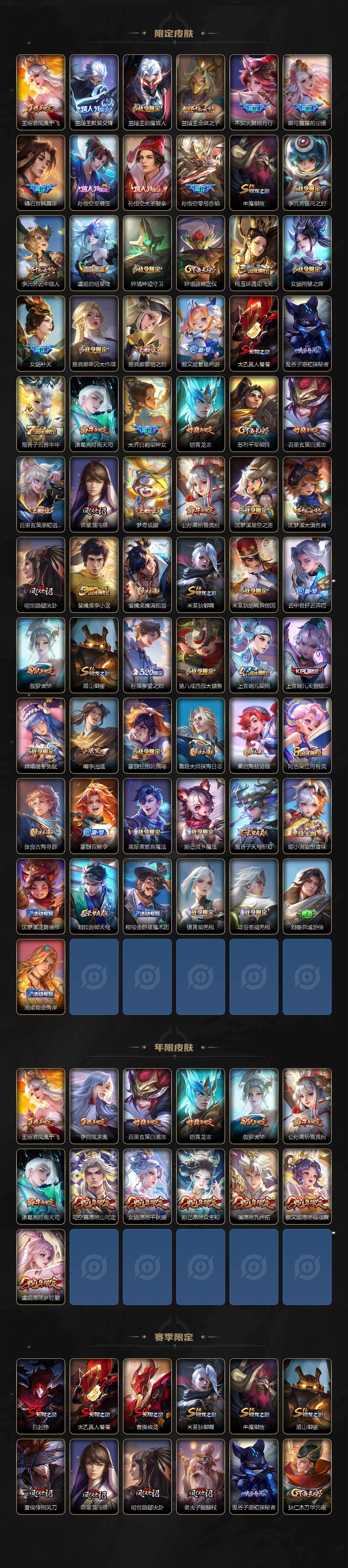 【限定皮肤】:白起狰,蔡文姬夏日便利店,虞姬夏日便利店,姜子牙天穹之誓,李白谪仙醉月,狄仁杰阴阳师,赵云皇家上将,赵云龙胆,嬴政优雅恋人,孙尚香蔷薇恋人,孙尚香异界灵契,鲁班七号狮舞东方,庄周高山流水,阿轲迷踪丽影,芈月白晶晶,芈月幻夜卜梦,吕布天魔缭乱,周瑜赤莲之焰,元歌云间偶戏,元歌无心,夏侯惇朔风刀,甄姬游园惊梦,曹操烛龙,典韦蓝屏警告,马可波罗暗影游猎,狄仁杰魔术师,狄仁杰万华元夜,达摩星际陆战队,达摩沙漠行僧,项羽海滩派对,老夫子醍醐杖,关羽冰锋战神,程咬金演武夺筹,露娜一生所爱,露娜启示之音,刘邦夺宝奇兵,王昭君凤凰于飞,兰陵王默契交锋,兰陵王驯魔猎人,兰陵王金庭之子,不知火舞绯月行,娜可露露前尘镜,橘右京枫霜尽,孙悟空至尊宝,孙悟空大圣娶亲,孙悟空零号赤焰,牛魔御旌,李元芳银河之约,李元芳云中旅人,虞姬启明星使,钟馗神迹守卫,钟馗驱傩正仪,杨玉环遇见飞天,女娲朔望之晖,女娲补天,雅典娜单词大作战,雅典娜黎明之约,蔡文姬繁星吟游,太乙