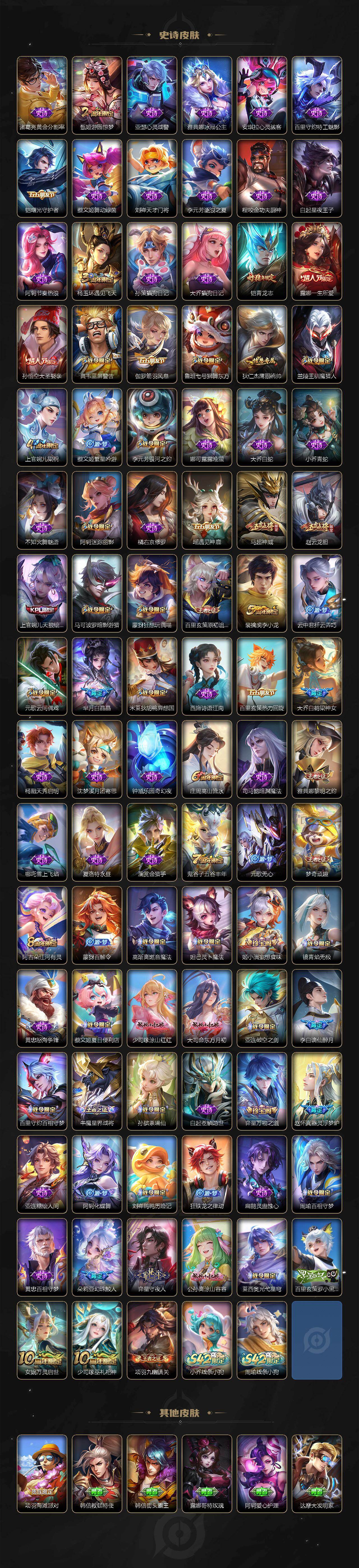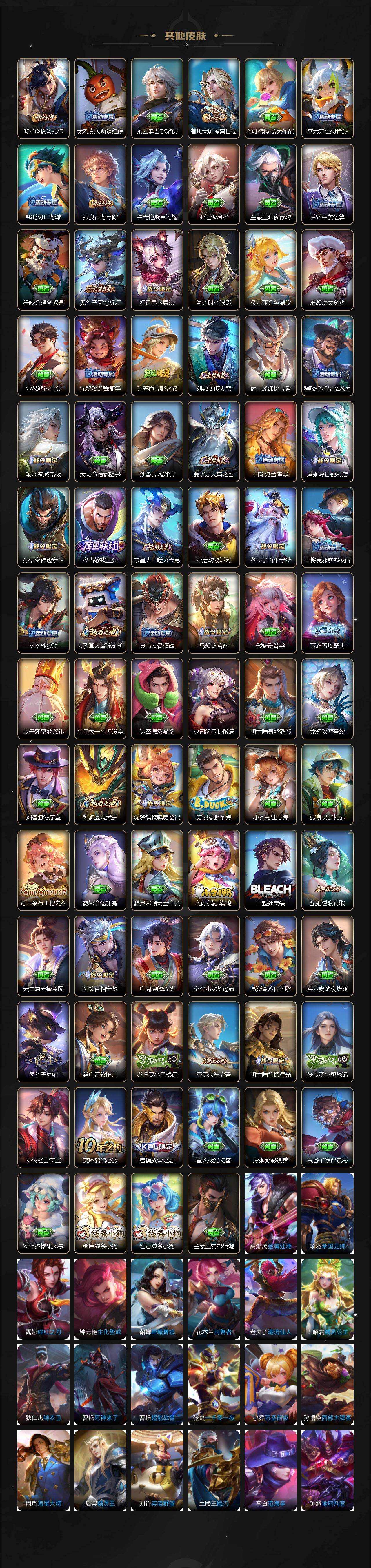 小乔青蛇,大乔白蛇,瑶遇见神鹿,娜可露露晚萤,伽罗箭羽风息,李元芳逐浪之夏,不知火舞魅语,大乔猫狗日记,孙策猫狗日记,阿轲节奏热浪,露娜紫霞仙子,诸葛亮黄金分割率,王昭君偶像歌手,韩信白龙吟,项羽苍穹之光,阿轲暗夜猫娘,雅典娜冰冠公主,吕布末日机甲,鲁班七号电玩小子,橘右京修罗,墨子龙骑士,嬴政摇滚巨星,刘禅绅士熊喵,刘禅天才门将,白起星夜王子,安琪拉心灵骇客,程咬金功夫厨神,刘邦德古拉伯爵,兰陵王暗隐猎兽者,曹操幽灵船长,宫本武藏鬼剑武藏,司马懿暗渊魔法,亚瑟心灵战警,钟馗乐园奇幻夜,杨戬天秀·启明,蔡文姬舞动绿茵,廉颇地狱岩魂,西施诗语江南,小乔缤纷独角兽,夏侯惇乘风破浪,花木兰水晶猎龙者,铠曙光守护者,百里玄策热力回旋,墨子金属风暴,百里玄策原初追逐者,吕布圣诞狂欢,貂蝉圣诞恋歌,百里守约特工魅影,嬴政暗夜贵公子,雅典娜黎明之约,李白千年之狐,哪吒雪上飞焰,夏洛特永昼,澜赏金猎手,蒙犽百解令,高渐离燃音魔法,李白谪仙醉月,白起苍鳞隐世,赵怀真器灵·浮梦炉,亚连糖绘人间
