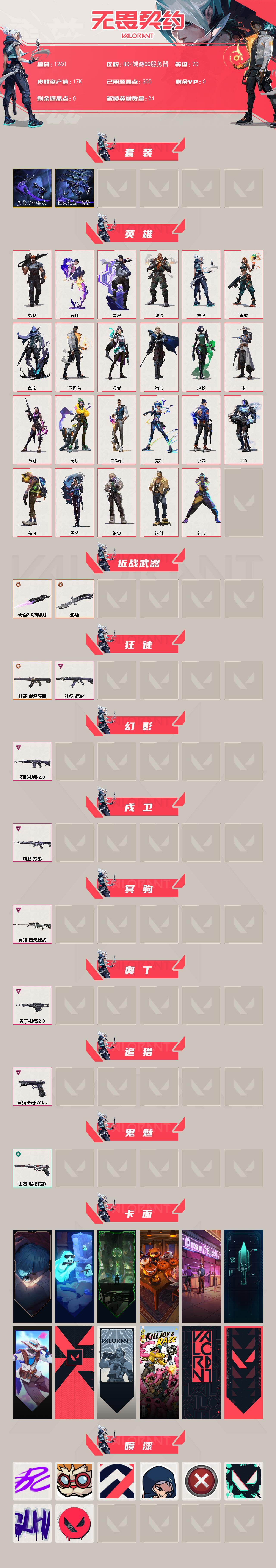 [16630717]【套装】:掠影//3.0套装,回火礼包:掠影套装 【英雄】:幻棱,炼狱,暮蝶,钛狐,壹决,铁臂,捷风,雷兹,幽影,不死鸟,贤者,猎枭,蝰蛇,零,芮娜,奇乐,尚勃勒,霓虹,夜露,K/O,盖可,黑梦,钢锁 【近战武器】:近战武器-影蝶,近战武器-奇点//2.0 蝴蝶刀 【狂徒】:狂徒-混沌序曲,狂徒-掠影 【幻影】:幻影-掠影//2.0 【戍卫】:戍卫-掠影 【冥驹】:冥驹-堕天遗武 【奥丁】:奥丁-掠影//2.0 【追猎】:追猎-掠影//3.0 【鬼魅】:鬼魅-诡秘蛇影 【卡面】:《双城之战》拥抱 卡面,精灵大战 卡面,欢迎来到底城 卡面,南瓜盛典 卡面,梦幻奶茶 卡面,零点嗅探设计图 卡面,无畏契约GO!第一卷:零 卡面,代号红色 卡面,新兵报到 卡面,友军火力 卡面,V契约 卡面,无畏契约 卡面 【喷漆】:嘭! 喷漆,都算到了 喷漆,控场勿近 喷漆,捷风差距 喷漆,买装还是存钱 喷漆,胜利属于无畏契约 喷漆,GLHF 喷漆,无畏契约 喷漆 【挂饰】:《双城之战》小蛋糕 挂饰,第九季//第三幕 纪念币 挂饰,第八季//第三幕 纪念币 挂饰,天外飞客 挂饰,无畏契约 纪念币 挂饰