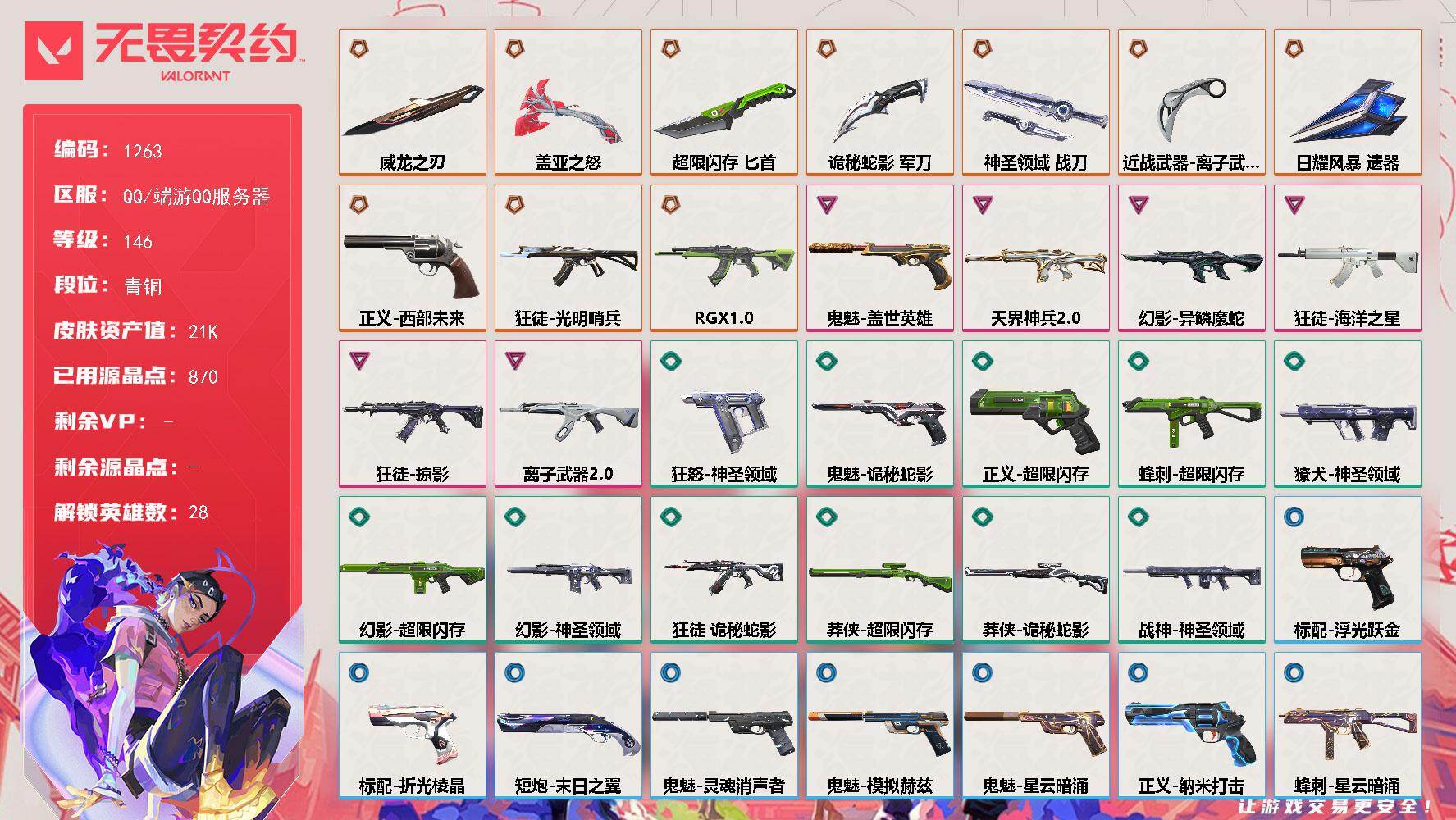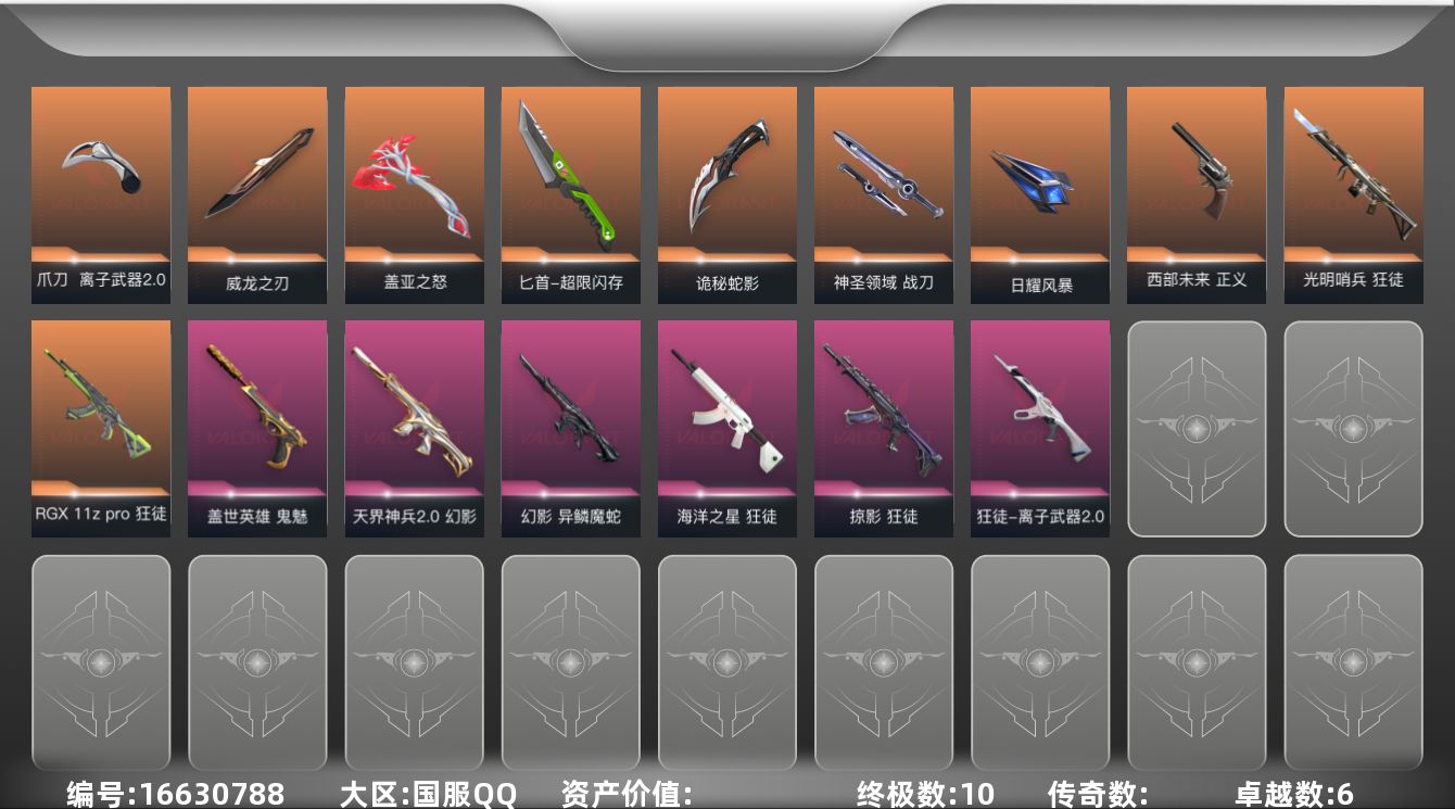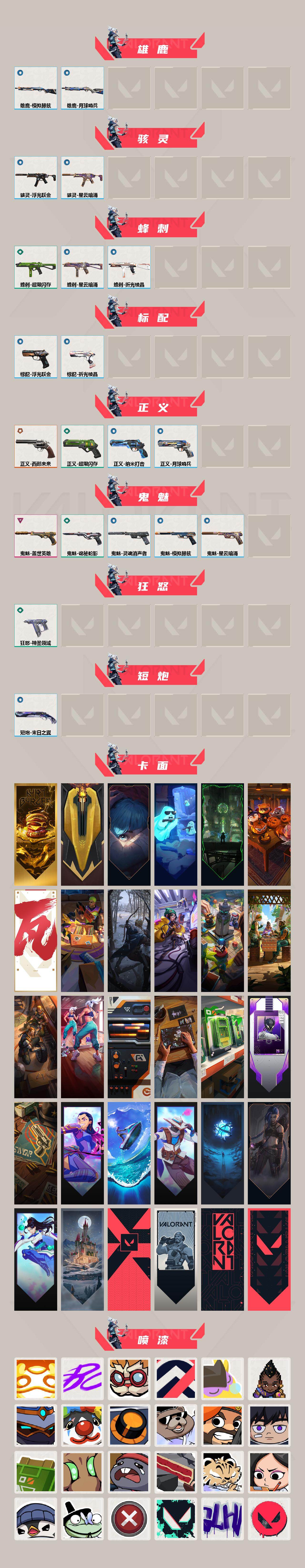[16630788]【英雄】:幻棱,炼狱,维斯,暮蝶,钛狐,壹决,铁臂,捷风,雷兹,幽影,不死鸟,贤者,猎枭,蝰蛇,零,芮娜,奇乐,尚勃勒,霓虹,斯凯,夜露,星礈,K/O,海神,盖可,黑梦,钢锁 【近战武器】:近战武器-威龙之刃,近战武器-离子武器//2.0 爪刀,近战武器-超限闪存 匕首,近战武器-盖亚之怒,近战武器-诡秘蛇影 军刀,近战武器-神圣领域 战刀,近战武器-日耀风暴 遗器 【狂徒】:狂徒-光明哨兵,狂徒-RGX 11z Pro,狂徒-掠影,狂徒-海洋之星,狂徒-离子武器//2.0,狂徒-诡秘蛇影 【幻影】:幻影-天界神兵//2.0,幻影-异鳞魔蛇,幻影-超限闪存,幻影-神圣领域,幻影-末日之翼 【戍卫】:戍卫-浮光跃金,戍卫-月球哨兵,戍卫-折光棱晶 【獠犬】:獠犬-神圣领域,獠犬-模拟赫兹 【冥驹】:冥驹-模拟赫兹,冥驹-星云暗涌 【飞将】:飞将-末日之翼 【莽侠】:莽侠-超限闪存,莽侠-诡秘蛇影,莽侠-月球哨兵 【战神】:战神-神圣领域,战神-浮光跃金 【奥丁】:奥丁-末日之翼 【判官】:判官-诡秘蛇影 【雄鹿】:雄鹿-模拟赫兹,雄鹿-月球哨兵 【骇灵】:骇灵-浮光跃金,骇灵-星云暗涌 【蜂刺】:蜂刺-超限闪存,蜂刺-星云暗涌,蜂刺-折光棱晶 【标配】:标配-浮光跃金,标配-折光棱晶 【正义】:正义-西部未来,正义-超限闪存,正义-纳米打击,正义-月球哨兵 【鬼魅】:鬼魅-盖世英雄,鬼魅-诡秘蛇影,鬼魅-灵魂消声者,鬼魅-模拟赫兹,鬼魅-星云暗涌 【狂怒】:狂怒-神圣领域 【短炮】:短炮-末日之翼 【卡面】:终章:激斗汉堡 卡面,进入射程 卡面,《双城之战》拥抱 卡面,精灵大战 卡面,欢迎来到底城 卡面,南瓜盛典 卡面,VCT CN首冠 卡面,唱片的故事 卡面,钢弓与箭弦 卡面,排除故障 卡面,战术桌游 卡面,悠享食光 卡面,修车达人 卡面,热舞环节 卡面,模拟赫兹 卡面,浮光跃金 卡面,超限闪存 卡面,维斯工牌 卡面,正义的化身 卡面,无畏契约GO!第一卷:芮娜 卡面,复古浪潮 卡面,无畏契约GO!第一卷:零 卡面,无垠星环 卡面,《双城之战》金克丝 卡面,无畏契约GO!第一卷:贤者 卡面,胡桃狂想 卡面,代号红色 卡面,新兵报到 卡面,V契约 卡面,无畏契约 卡面 【喷漆】:嗨宝南瓜灯 喷漆,嘭! 喷漆,都算到了 喷漆,控场勿近 喷漆,皮蛋呼呼 喷漆,像素星礈