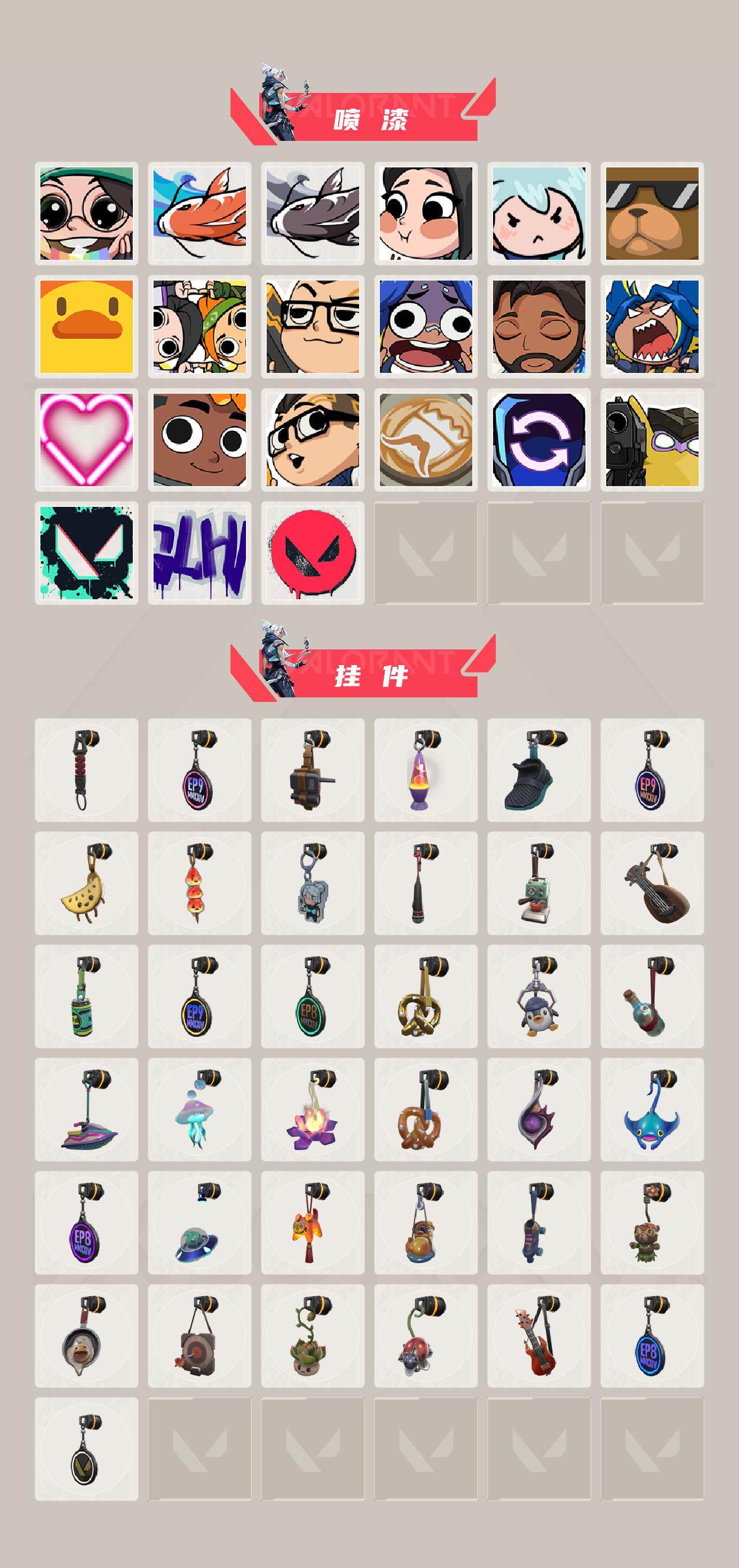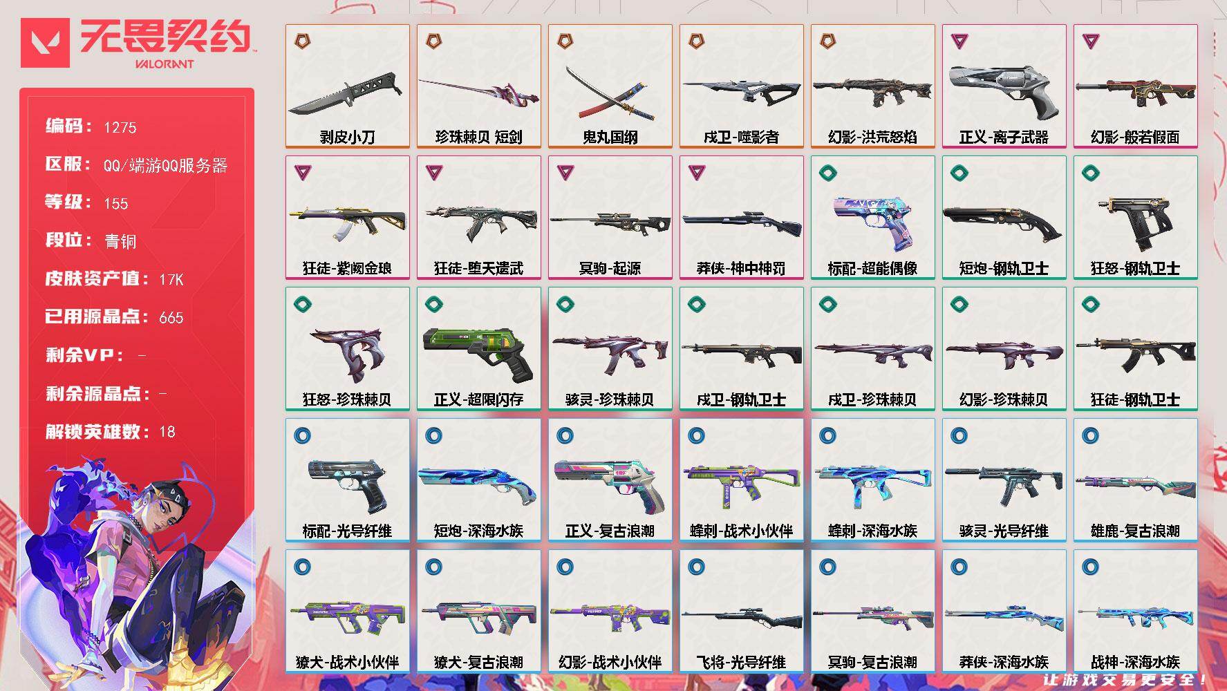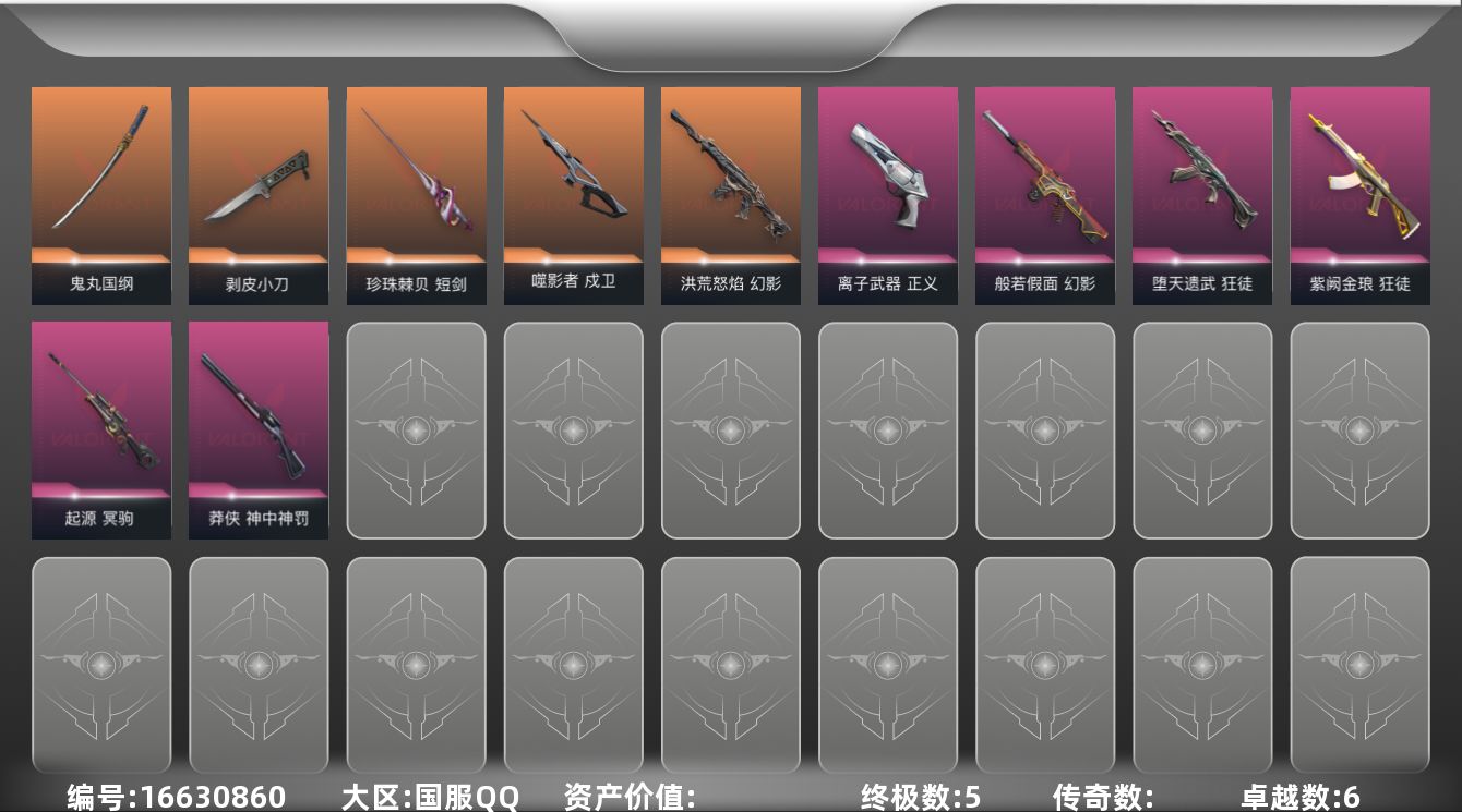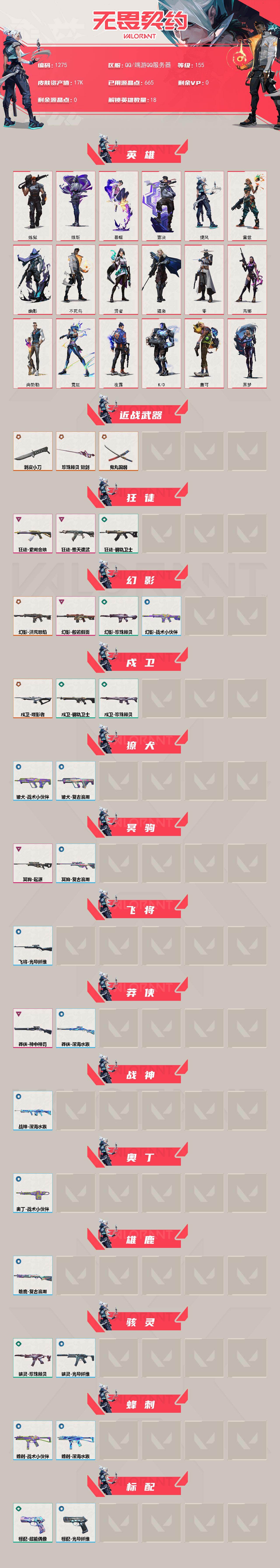 [16630860]【英雄】:炼狱,维斯,暮蝶,壹决,捷风,雷兹,幽影,不死鸟,贤者,猎枭,零,芮娜,尚勃勒,霓虹,夜露,K/O,盖可,黑梦 【近战武器】:近战武器-剥皮小刀,近战武器-鬼丸国纲,近战武器-珍珠棘贝 短剑 【狂徒】:狂徒-堕天遗武,狂徒-紫阙金琅,狂徒-钢轨卫士 【幻影】:幻影-洪荒怒焰,幻影-般若假面,幻影-珍珠棘贝,幻影-战术小伙伴 【戍卫】:戍卫-噬影者,戍卫-钢轨卫士,戍卫-珍珠棘贝 【獠犬】:獠犬-复古浪潮,獠犬-战术小伙伴 【冥驹】:冥驹-起源,冥驹-复古浪潮 【飞将】:飞将-光导纤维 【莽侠】:莽侠-神中神罚,莽侠-深海水族 【战神】:战神-深海水族 【奥丁】:奥丁-战术小伙伴 【雄鹿】:雄鹿-复古浪潮 【骇灵】:骇灵-珍珠棘贝,骇灵-光导纤维 【蜂刺】:蜂刺-深海水族,蜂刺-战术小伙伴 【标配】:标配-超能偶像,标配-光导纤维 【正义】:正义-离子武器,正义-超限闪存,正义-复古浪潮 【狂怒】:狂怒-钢轨卫士,狂怒-珍珠棘贝 【短炮】:短炮-钢轨卫士,短炮-深海水族 【卡面】:《双城之战》拥抱 卡面,精灵大战 卡面,欢迎来到底城 卡面,南瓜盛典 卡面,VCT CN首冠 卡面,修车达人 卡面,热舞环节 卡面,正义的化身 卡面,终章:生意人麦宝 卡面,铁之华 卡面,时间到 卡面,最高舞台 卡面,音熊登场 卡面,树懒大作战 卡面,声感陷阱设计图 卡面,Clutch 卡面,霓帧牛蛙 卡面,梦幻奶茶 卡面,零点嗅探设计图 卡面,终章:瓦娃脸雪糕 卡面,表象之下 卡面,虹吸式咖啡壶 卡面,源能者美容 卡面,脚踝终结者 卡面 ,夜班 卡面,瓦娃脸雪糕 卡面 ,沙雕爆能器 卡面,无畏契约GO!第一卷:芮娜 卡面,深海水族 卡面,珍珠棘贝 卡面,复古浪潮 卡面,盖可工牌 卡面,清除名单 卡面,无畏契约GO!第一卷:零 卡面,龍记 卡面,比比看谁快? 卡面,无垠星环 卡面,《双城之战》金克丝 卡面,蝰蛇vs幽影 卡面,势不可挡//盖可 卡面,逆向独行 卡面 ,同步耍酷 卡面,完美调谐 卡面 ,没有什么能逃过我的眼睛 卡面,光导纤维 卡面,战术小伙伴 卡面,钢轨卫士 卡面,暗枪 卡面,钢锁vs盖可 卡面,势不可挡//K/O 卡面,代号红色 卡面,新兵报到 卡面,V契约 卡面,无畏契约 卡面 【喷漆】:嘭! 喷漆,都算到了 喷漆,控场勿近 喷漆,小丑猫 喷漆,熊抱 喷漆,蛋糕
