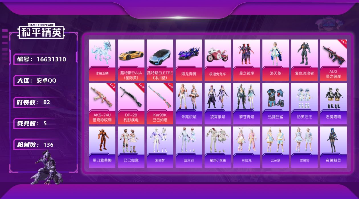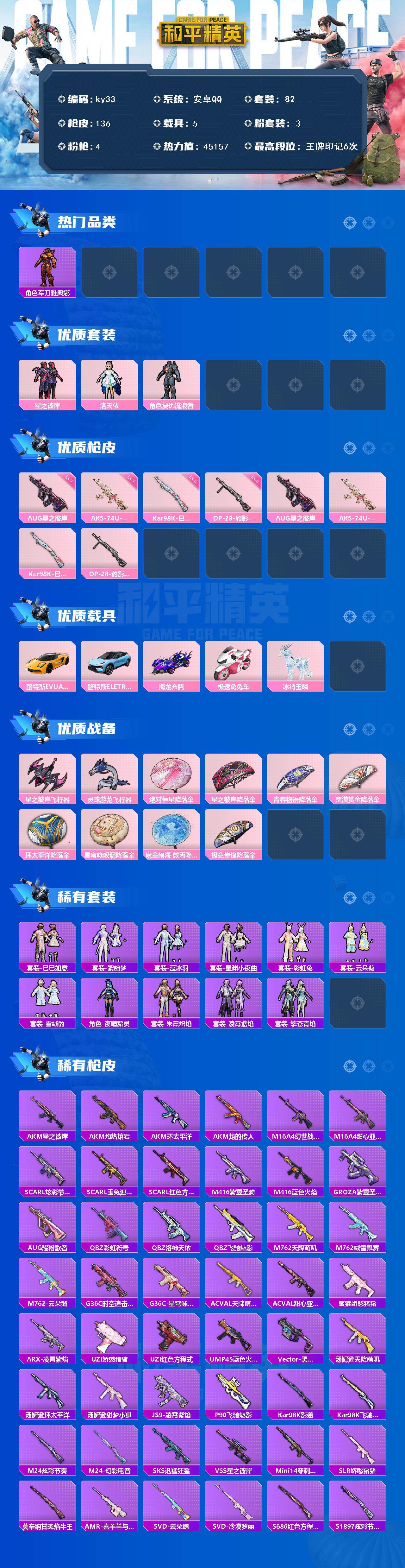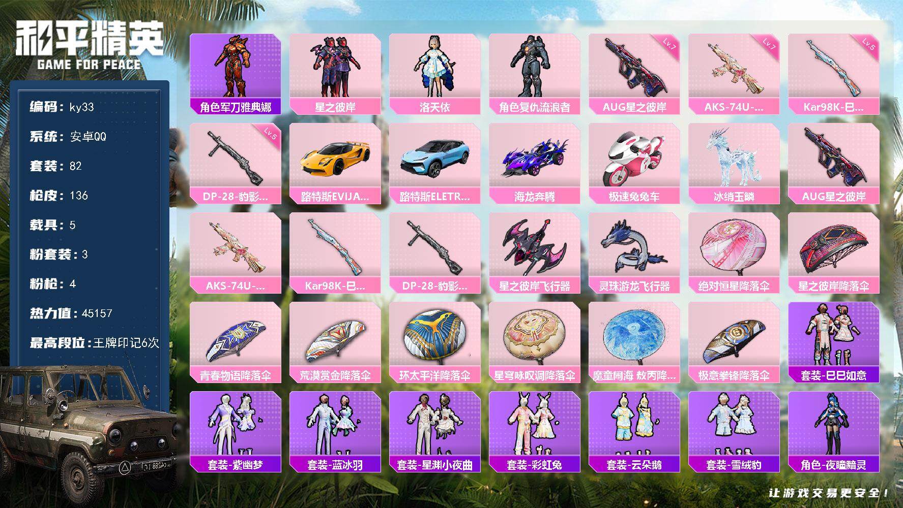 [16631310]安卓 手Q-3粉装-4特效枪-5载具-3粉色飞行器-45157热力值-6王牌印记-82套装-136枪皮 【热门品类】:角色-军刀雅典娜 【粉色套装】:粉装-星之彼岸,角色-洛天依,角色-复仇流浪者 【粉色枪皮等级】:AUG-星之彼岸(七级),AKS-74U-星穹咏叹调(七级),Kar98K-巳巳如意(五级),DP-28-豹影疾电(五级) 【粉色载具】:路特斯EVIJA(星际黄),路特斯ELETRE(冰川蓝),海龙奔腾,极速兔兔车,冰绡玉鳞 【粉色枪皮】:AUG-星之彼岸,AKS-74U-星穹咏叹调,Kar98K-巳巳如意,DP-28-豹影疾电 【粉色飞行器】:星之彼岸飞行器,灵珠游龙飞行器 【粉色降落伞】:绝对恒星降落伞,星之彼岸降落伞,青春物语降落伞,荒漠赏金降落伞,环太平洋降落伞,星穹咏叹调降落伞,魔童闹海 敖丙降落伞,极意拳锋降落伞,炫彩糖果降落伞 【稀有套装】:套装-巳巳如意,套装-炫彩糖果,套装-紫幽梦,套装-蓝冰羽,套装-星渊小夜曲,套装-彩虹兔,套装-云朵鹅,套装-雪绒豹,角色-夜瞳黯灵,套装-朱霞炽焰,套装-凌霄紫焰,套装-擎苍青焰 【稀有枪皮】:AKM-星之彼岸,AKM-灼热熔岩,AKM-环太平洋,AKM-龙的传人,M16A4-幻世战舞者,M16A4-甜心亚梦,SCAR-L-炫彩节奏,SCAR-L-玉兔迎春,SCAR-L-红色方程式,M416-紫翼圣骑,M416-蓝色火焰,GROZA-紫翼圣骑,AUG-耀粉歌者,QBZ-彩虹符号,QBZ-洛神天依,QBZ-飞驰魅影,M762-天降萌叽,M762-绒雪飘舞,M762-云朵鹅,G36C-时空追击者,G36C-星穹咏叹调,AC-VAL-天降萌叽,AC-VAL-甜心亚梦,蜜獾-娇憨猪猪,ARX-凌霄紫焰,UZI-娇憨猪猪,UZI-红色方程式,UMP45-蓝色火焰,Vector-黑色刀锋,汤姆逊-天降萌叽,汤姆逊-环太平洋,汤姆逊-甜梦小狐,JS9-凌霄紫焰,P90-飞驰魅影,Kar98K-影袭,Kar98K-飞驰魅影,M24-炫彩节奏,M24-幻彩电音,SKS-迅猛狂鲨,VSS-星之彼岸,Mini14-穿刺龙虾,SLR-娇憨猪猪,莫辛纳甘-炙焰牛王,AMR-喜羊羊与灰太狼,SVD-云朵鹅,SVD-冷漠罗丽,S686-红色方程式,S1897-炫彩节奏,S1897-飞驰魅影,S1897-荧海星豚,S12K-娇