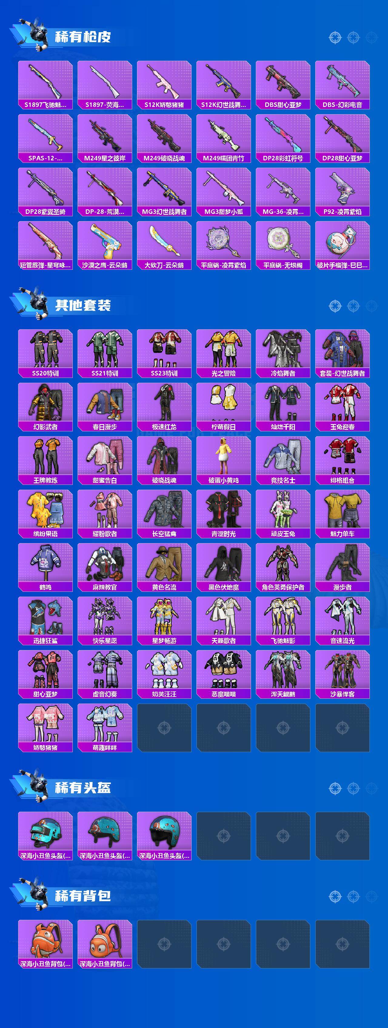 【稀有枪皮】:AKM-星之彼岸,AKM-灼热熔岩,AKM-环太平洋,AKM-龙的传人,M16A4-幻世战舞者,M16A4-甜心亚梦,SCAR-L-炫彩节奏,SCAR-L-玉兔迎春,SCAR-L-红色方程式,M416-紫翼圣骑,M416-蓝色火焰,GROZA-紫翼圣骑,AUG-耀粉歌者,QBZ-彩虹符号,QBZ-洛神天依,QBZ-飞驰魅影,M762-天降萌叽,M762-绒雪飘舞,M762-云朵鹅,G36C-时空追击者,G36C-星穹咏叹调,AC-VAL-天降萌叽,AC-VAL-甜心亚梦,蜜獾-娇憨猪猪,ARX-凌霄紫焰,UZI-娇憨猪猪,UZI-红色方程式,UMP45-蓝色火焰,Vector-黑色刀锋,汤姆逊-天降萌叽,汤姆逊-环太平洋,汤姆逊-甜梦小狐,JS9-凌霄紫焰,P90-飞驰魅影,Kar98K-影袭,Kar98K-飞驰魅影,M24-炫彩节奏,M24-幻彩电音,SKS-迅猛狂鲨,VSS-星之彼岸,Mini14-穿刺龙虾,SLR-娇憨猪猪,莫辛纳甘-炙焰牛王,AMR-喜羊羊与灰太狼,SVD-云朵鹅,SVD-冷漠罗丽,S686-红色方程式,S1897-炫彩节奏,S1897-飞驰魅影,S1897-荧海星豚,S12K-娇