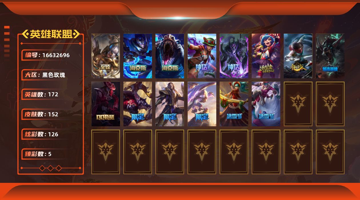[16632696]【特价出售/店主推荐】未定级段位-172英雄-152皮肤-126炫彩-0终极-7神话-9限定-21传说-35史诗