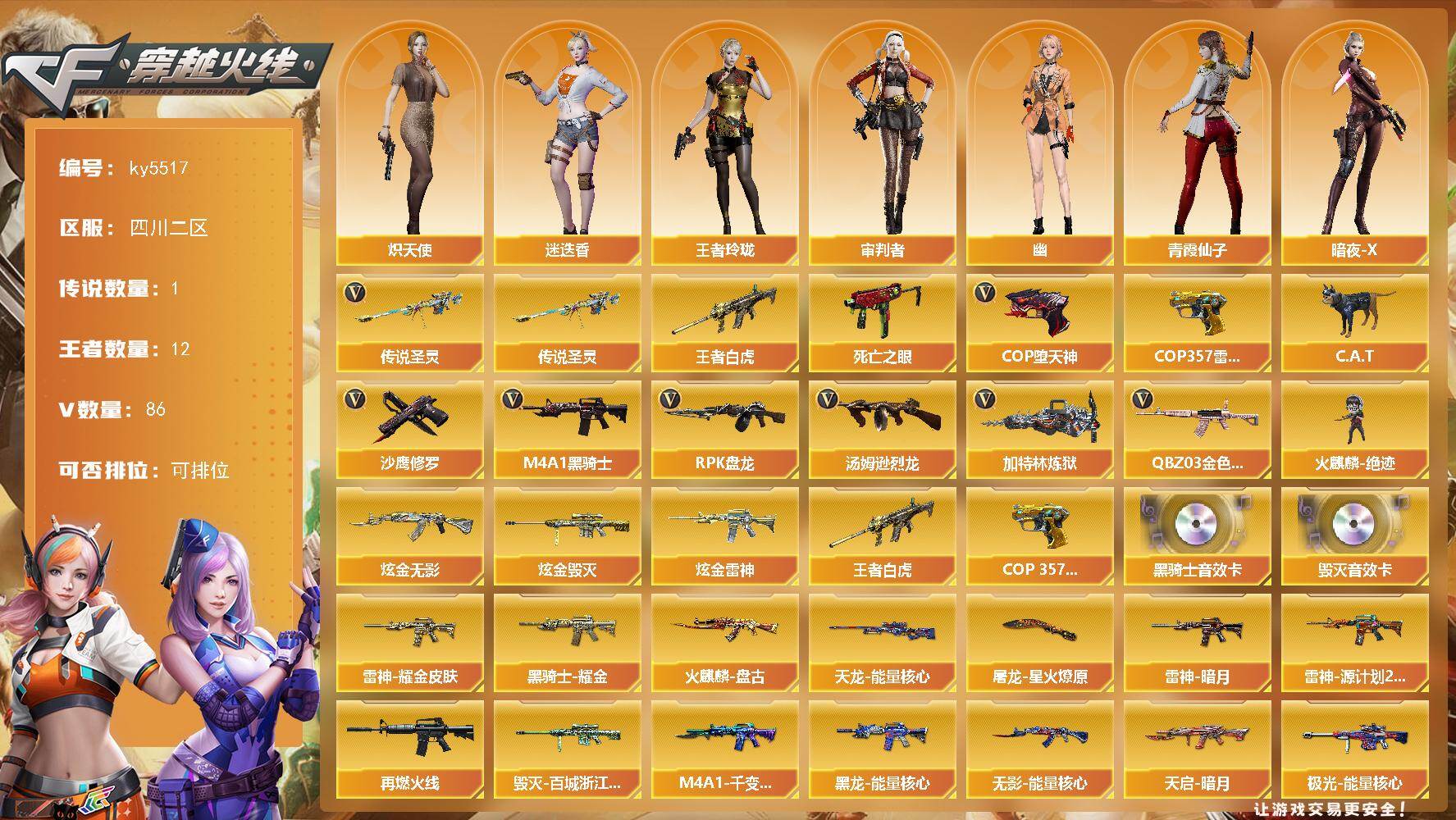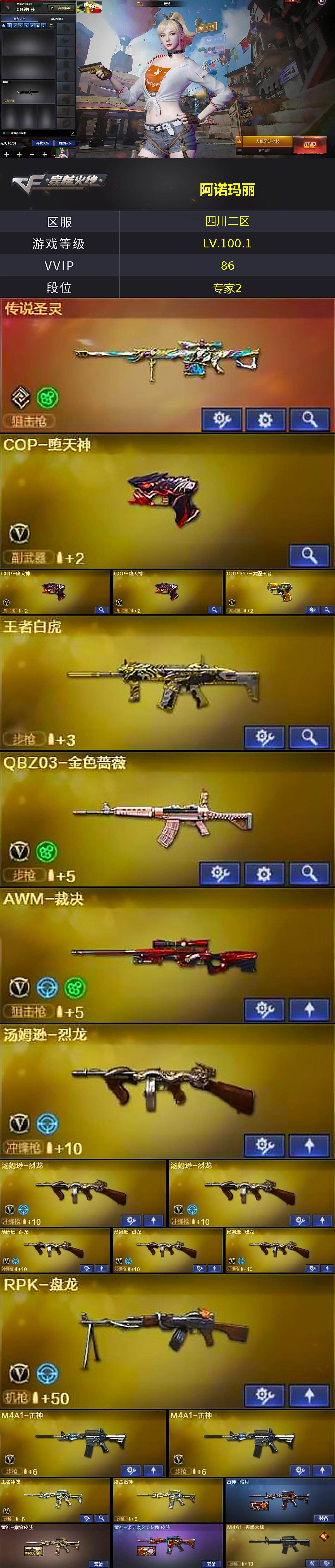 [16634213]四川二区-95V-12王者武器数-3炫金武器数 【传说武器】:传说圣灵 【热门武器】:传说圣灵,王者白虎,QBZ03-金色蔷薇,死亡之眼,C.A.T,M4A1-黑骑士,汤姆逊-烈龙*6,RPK-盘龙,加特林-炼狱,火麒麟-绝迹,COP-堕天神*3,COP 357-雷霆王者,沙鹰-修罗 【王者炫金武器】:王者白虎,COP 357-雷霆王者,炫金无影,炫金雷神,炫金毁灭 【音效卡】:M4A1-黑骑士音效卡,Barrett-毁灭音效卡 【皮肤】:雷神-暗月,雷神-耀金皮肤,雷神-源计划2.0专属 皮肤,M4A1-再燃火线,火麒麟-盘古,毁灭-百城浙江 皮肤,M4A1-千变-孔明皮肤,黑龙-能量核心,黑骑士耀金皮肤,无影-能量核心,天启-暗月,天龙-能量核心,极光-能量核心*3,修罗-能量核心,屠龙-星火燎原,轻型军用手斧-再燃火线 【角色】:迷迭香,审判者,王者玲珑,炽天使,暗夜-X,电竞少女,芳心审判者,风暴女,嘉年华灵狐,猎狐者-追月,灵狐-花神,灵狐者-X,曼陀罗-礼服,潘多拉-X,青霞仙子,兔囡囡,影武者-X,幽 【人偶武器】:火麒麟-绝迹,M4A1-雷神-精英刀锋,巴雷特-零-水下丽影,AWM-灵狐-15周年嘉年华,C.A.T,迷你深渊冰龙,迷你裂空之翼,迷你生化手雷,生化手雷-机甲核心,深渊终结者手雷,迷你艾比,沙鹰-夜玫瑰,灵狐娃娃手雷 【暴走生化】:死亡之眼,超级对讲机 【挑战大师】:神圣爆裂者III,冰龙粉碎者-白马银枪,VEPR-12-金魔,激光毁灭者III,机甲撕裂者III,阐释者III 【英雄级武器】:M4A1-千变,AK47-火麒麟,M4A1-黑龙,M4A1-雷神*2,M4A1-黑骑士,AK47-无影,M4A1-死神,AK12-天启,AN94-超新星,M4A1-武圣,AK47-黑鲨,M4A1-堕天神,无影-神兵利器,黑武士-锦绣游龙,M4A1-玫瑰精灵,QBZ03-金色蔷薇,王者冰魄-觉醒版,王者炎心-觉醒版,王者火魄-觉醒版,M4A1-雷霆王者-觉醒版,黑武士-CF网剧冠军,AWM-天龙,Barrett-毁灭,Barrett-极光,AWM-裁决,Barrett-雷霆王者-觉醒版,RPK-盘龙,加特林-炼狱,汤姆逊-烈龙*6,沙鹰-修罗,COP-堕天神*3,COP 357-雷霆王者-觉醒版,Glock18-武圣,天神-CF网剧冠军,屠龙,龙啸,