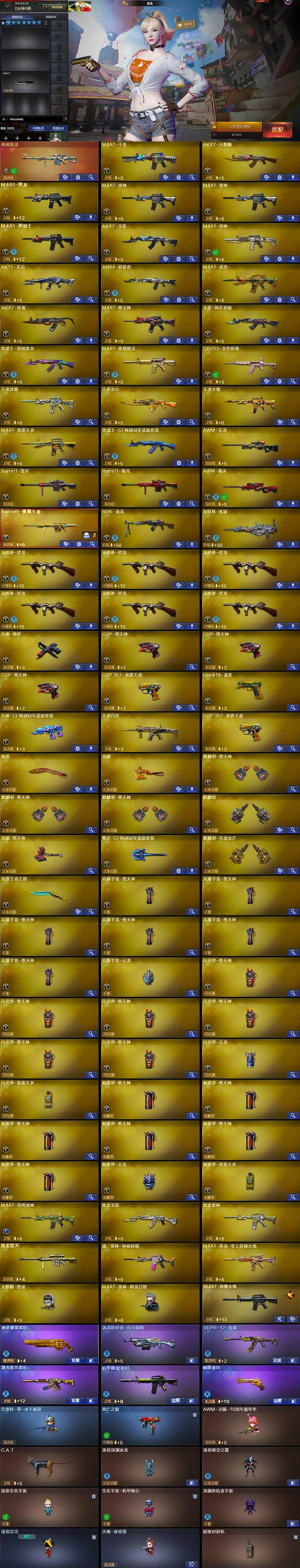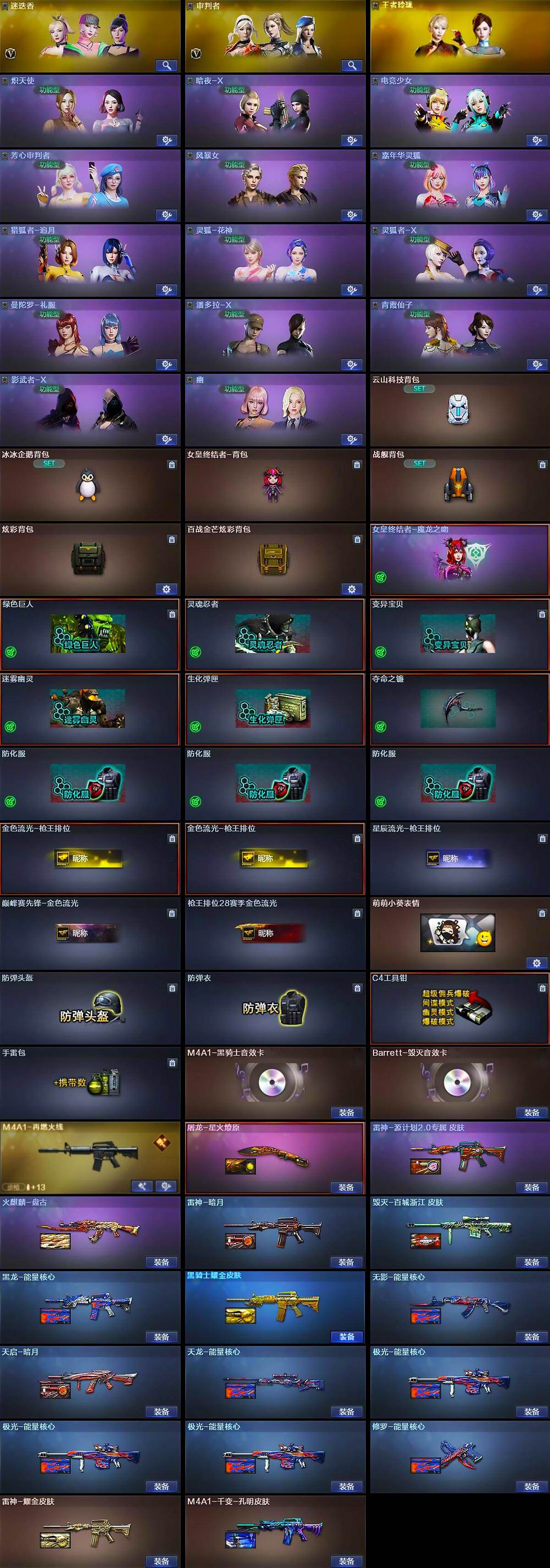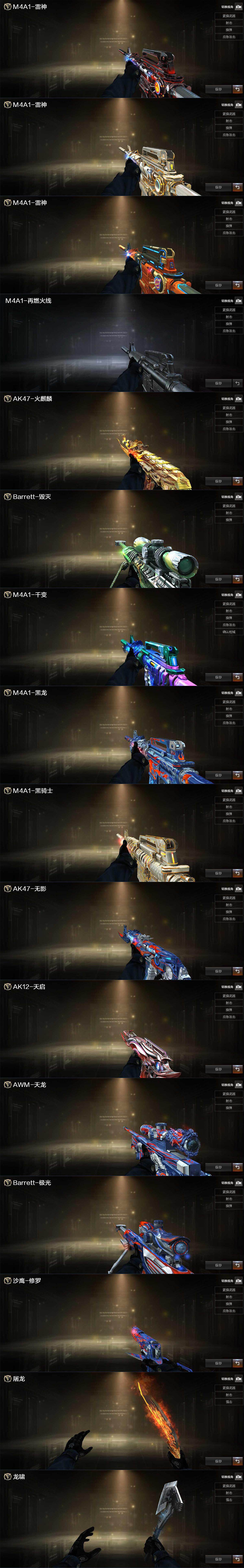 【英雄级武器】:M4A1-千变,AK47-火麒麟,M4A1-黑龙,M4A1-雷神*2,M4A1-黑骑士,AK47-无影,M4A1-死神,AK12-天启,AN94-超新星,M4A1-武圣,AK47-黑鲨,M4A1-堕天神,无影-神兵利器,黑武士-锦绣游龙,M4A1-玫瑰精灵,QBZ03-金色蔷薇,王者冰魄-觉醒版,王者炎心-觉醒版,王者火魄-觉醒版,M4A1-雷霆王者-觉醒版,黑武士-CF网剧冠军,AWM-天龙,Barrett-毁灭,Barrett-极光,AWM-裁决,Barrett-雷霆王者-觉醒版,RPK-盘龙,加特林-炼狱,汤姆逊-烈龙*6,沙鹰-修罗,COP-堕天神*3,COP 357-雷霆王者-觉醒版,Glock18-武圣,天神-CF网剧冠军,屠龙,龙啸,