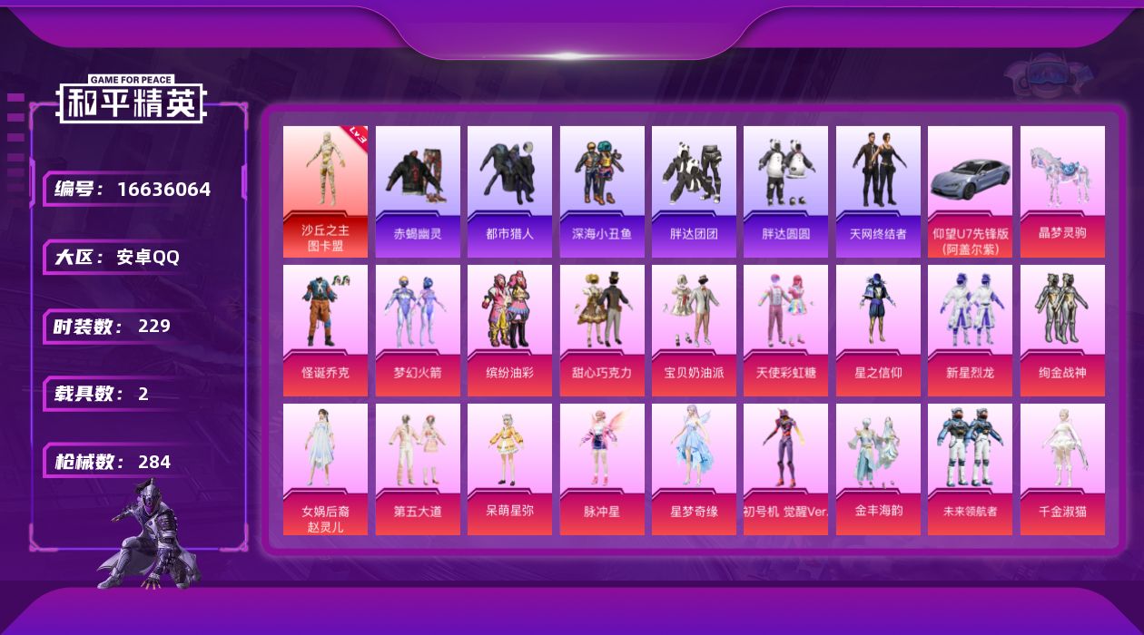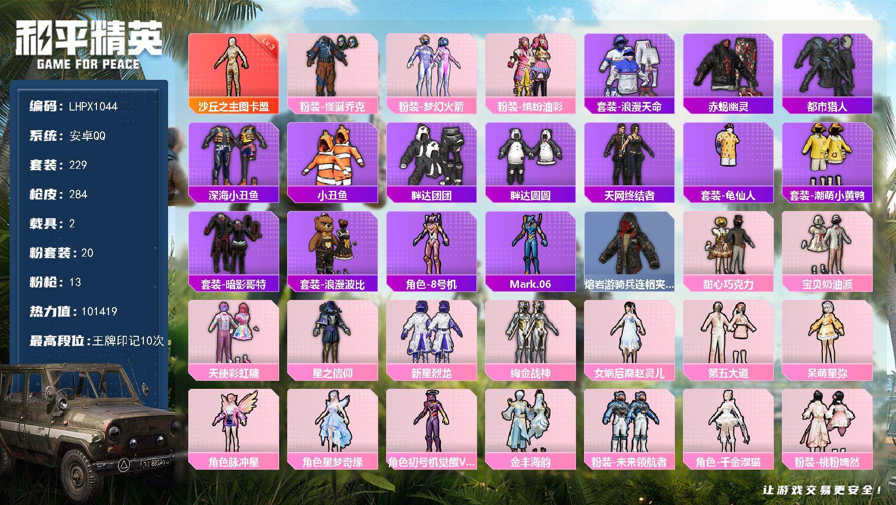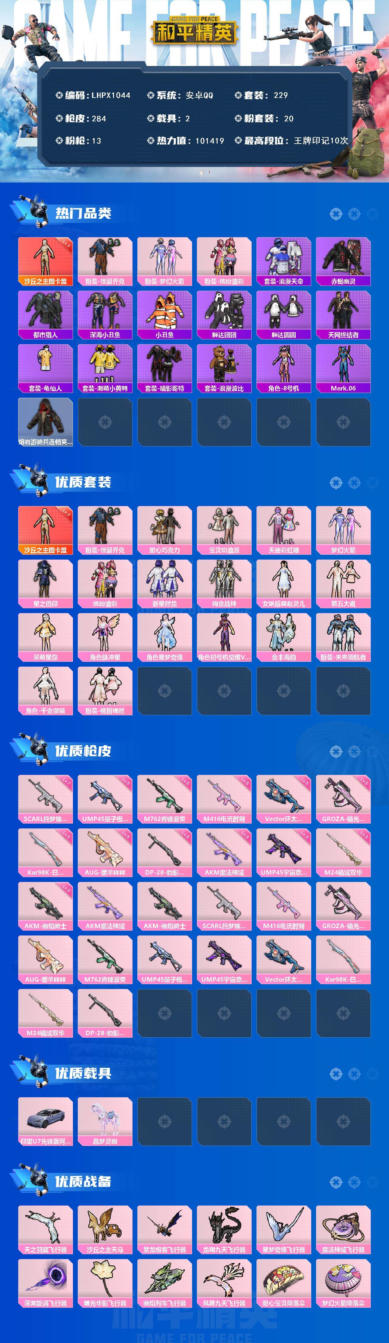 [16636064]【特价出售/店主推荐】安卓 手Q-1神装-20粉装-13特效枪-2载具-11粉色飞行器-101419热力值-10王牌印记-229套装-284枪皮
