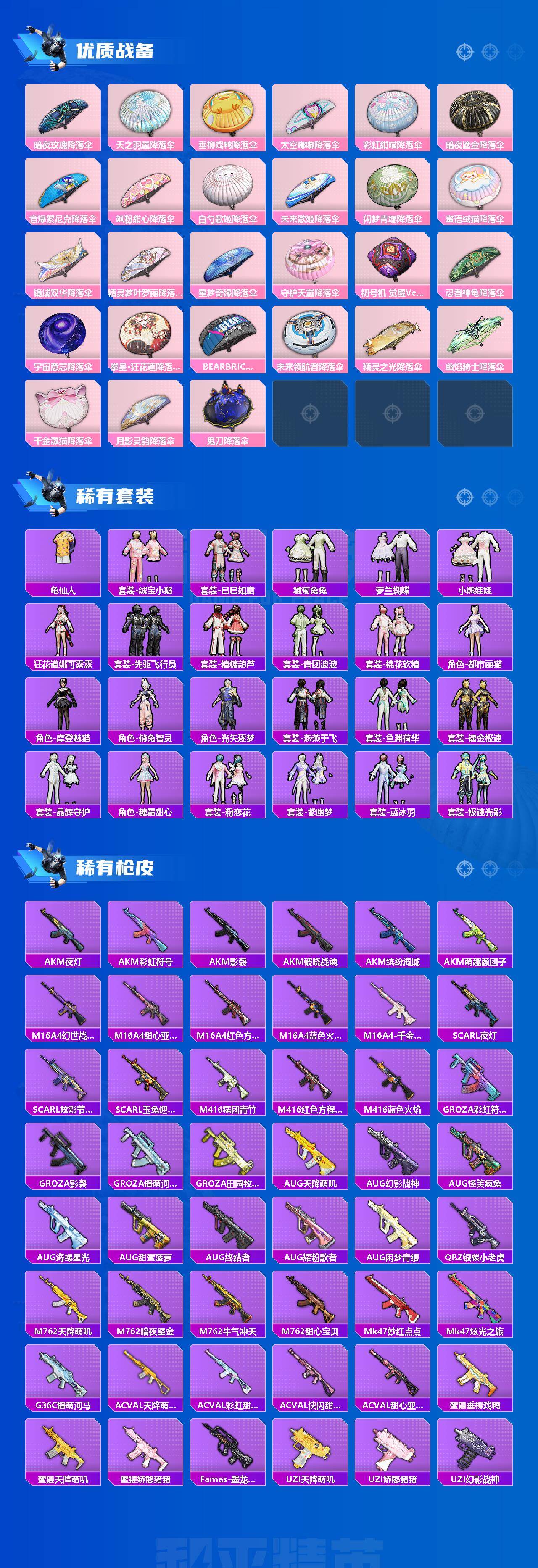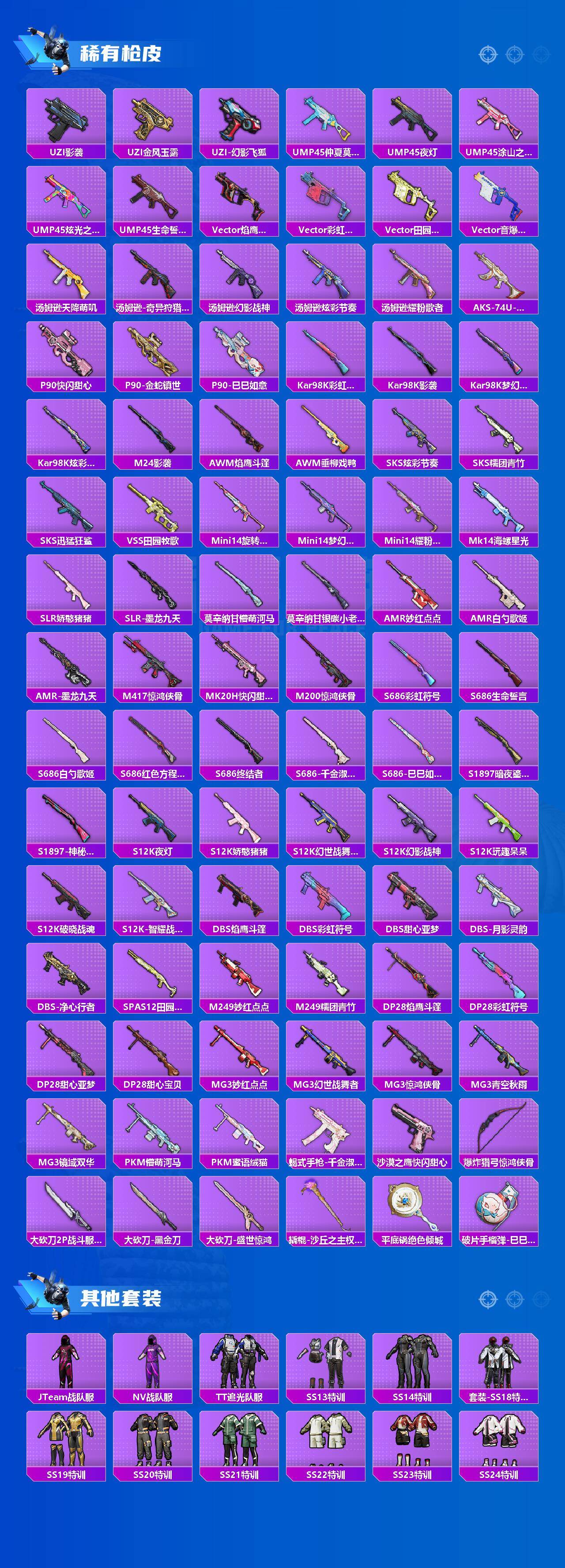 AKM-魔法神域,AKM-幽焰骑士,SCAR-L-纯梦嫁纱,M416-电玩时刻,GROZA-镜光银凌,AUG-暖羊咩咩,M762-青锋波束,UMP45-量子极限,UMP45-宇宙意志,Vector-环太平洋,Kar98K-巳巳如意,M24-镜域双华