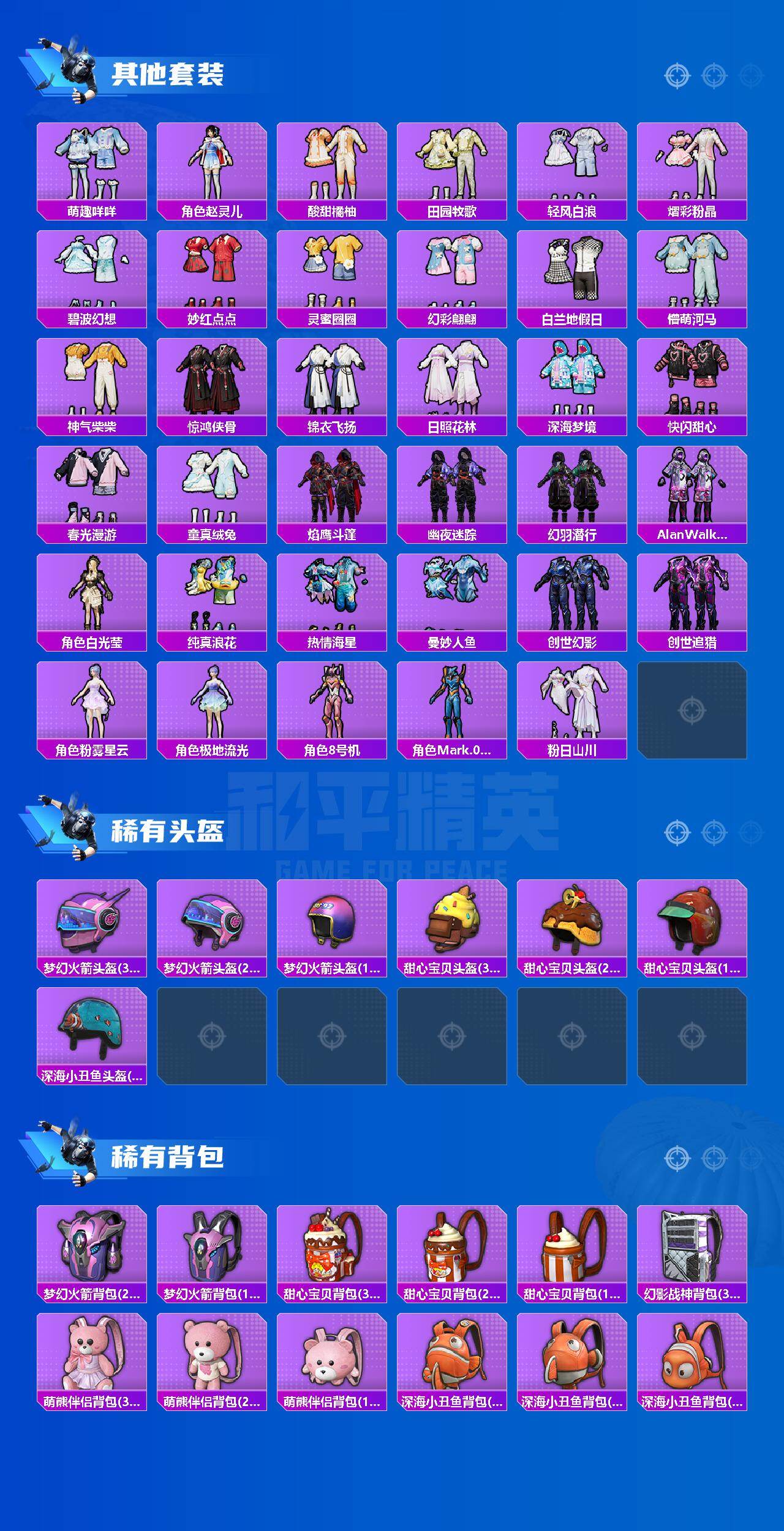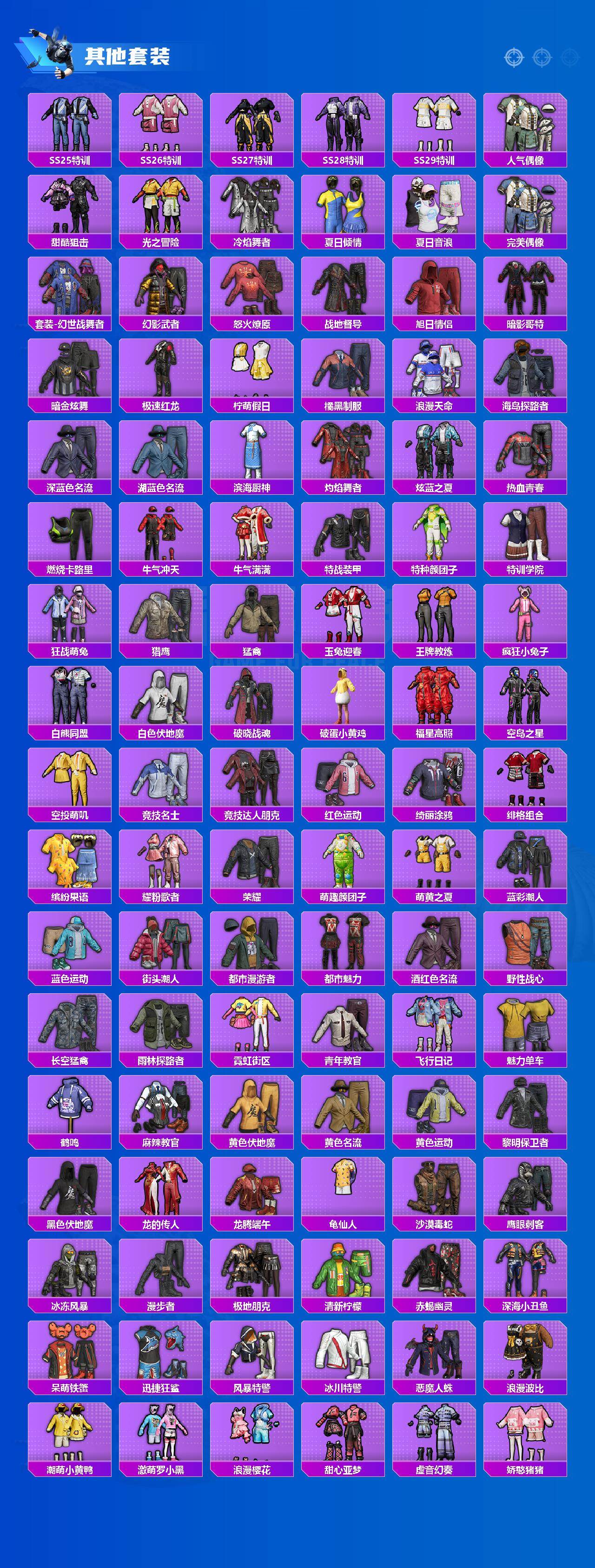 【粉色套装】:粉装-怪诞乔克,粉装-甜心巧克力,粉装-宝贝奶油派,粉装-天使彩虹糖,粉装-梦幻火箭,粉装-星之信仰,粉装-缤纷油彩,粉装-新星烈龙,粉装-绚金战神,女娲后裔-赵灵儿,粉装-第五大道,角色-呆萌星弥,角色-脉冲星,角色-星梦奇缘,角色-初号机 觉醒Ver.,粉装-金丰海韵,粉装-未来领航者,角色-千金淑猫,粉装-桃粉嫣然