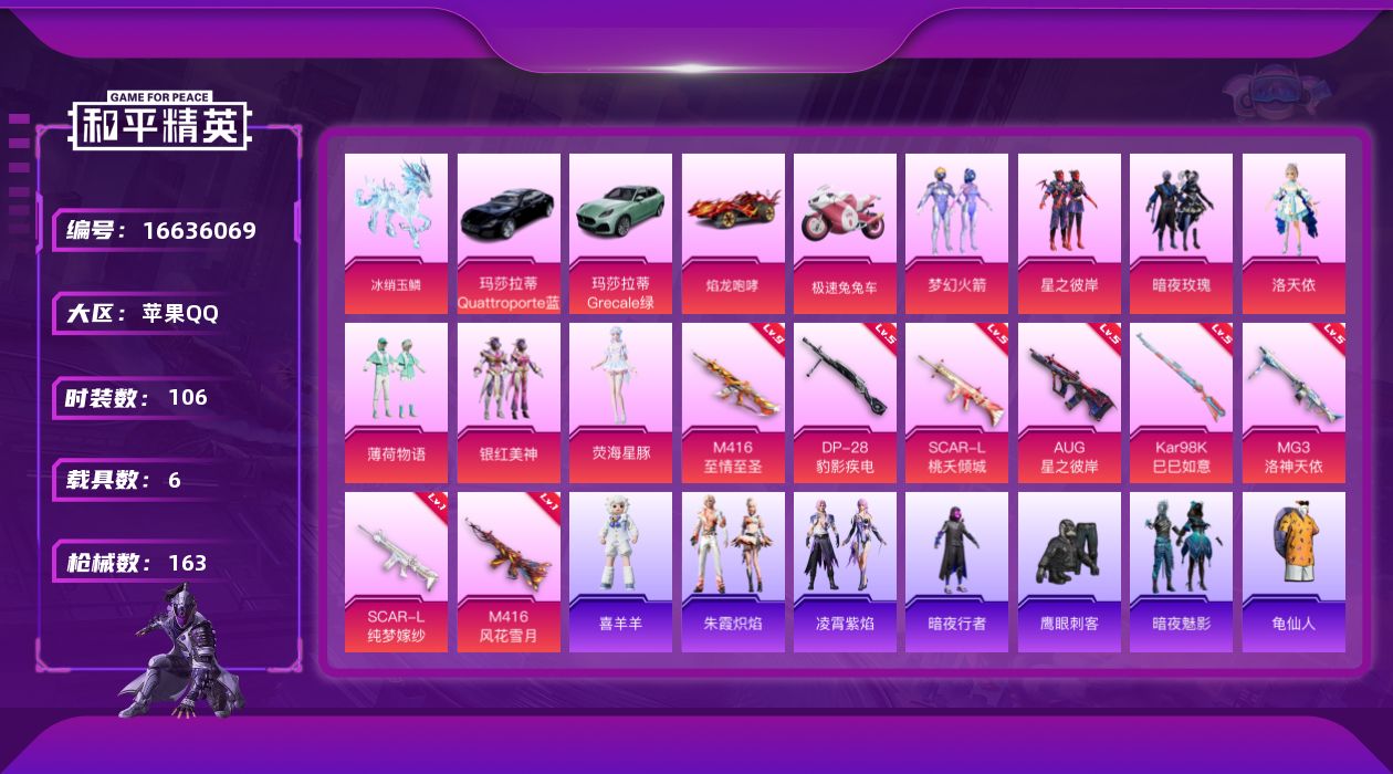 [16636069]【特价出售/店主推荐】果Q 手Q-7粉装-8特效枪-6载具-6粉色飞行器-61800热力值-12王牌印记-106套装-163枪皮 【热门品类】:粉装-梦幻火箭,套装-暗夜行者,套装-龟仙人 【粉色套装】:粉装-梦幻火箭,粉装-星之彼岸,粉装-暗夜玫瑰,角色-洛天依,粉装-薄荷物语,粉装-银红美神,角色-荧海星豚 【粉色枪皮等级】:SCAR-L-桃夭倾城(五级),SCAR-L-纯梦嫁纱(一级),M416-风花雪月(一级),M416-至情至圣(九级),AUG-星之彼岸(五级),Kar98K-巳巳如意(五级),DP-28-豹影疾电(五级),MG3-洛神天依(五级) 【粉色载具】:玛莎拉蒂Quattroporte(夜幕蓝),玛莎拉蒂Grecale(薄荷绿),焰龙咆哮,极速兔兔车,僚机-萌兔起飞,冰绡玉鳞,暮色幽蹄 【粉色枪皮】:SCAR-L-桃夭倾城,SCAR-L-纯梦嫁纱,M416-风花雪月,M416-至情至圣,AUG-星之彼岸,Kar98K-巳巳如意,DP-28-豹影疾电,MG3-洛神天依 【粉色飞行器】:梦幻火箭飞行器,星之彼岸飞行器,齐天大圣飞行器,星际浪客飞行器,灵珠游龙飞行器 【粉色降落伞】:至尊龙雀降落伞,梦幻火箭降落伞,星之彼岸降落伞,暗夜玫瑰降落伞,洛神天依降落伞,风花雪月降落伞,蓝莓炮弹降落伞,绚金瑰梦降落伞,青春物语降落伞,翩跹演武降落伞,旋转彩虹降落伞,星际浪客降落伞,荧海星豚降落伞,魔童闹海 哪吒降落伞,魔童闹海 敖丙降落伞,炫彩糖果降落伞 【稀有套装】:套装-龟仙人,套装-炫彩糖果,角色-米开朗基罗,角色-绛羽幽主,套装-朱霞炽焰,套装-凌霄紫焰,玩偶服-喜羊羊 【稀有枪皮】:AKM-星之彼岸,AKM-虎虎生威,M16A4-幻世战舞者,SCAR-L-暗夜玫瑰,SCAR-L-玉兔迎春,SCAR-L-红色方程式,SCAR-L-青丘仙客,M416-夜灯,M416-暗夜行者,M416-红色方程式,M416-绯红前夜,M416-蓝色火焰,GROZA-异彩先驱,GROZA-彩虹符号,GROZA-恐龙拽拽,GROZA-田园牧歌,GROZA-蓝莓炮弹,AUG-天降萌叽,AUG-海螺星光,QBZ-彩虹符号,QBZ-洛神天依,QBZ-绚金瑰梦,QBZ-飞驰魅影,M762-天降萌叽,M762-风花雪月,Mk47-洛神天依,G36C-暗夜玫瑰,AC-VAL-天降萌叽,