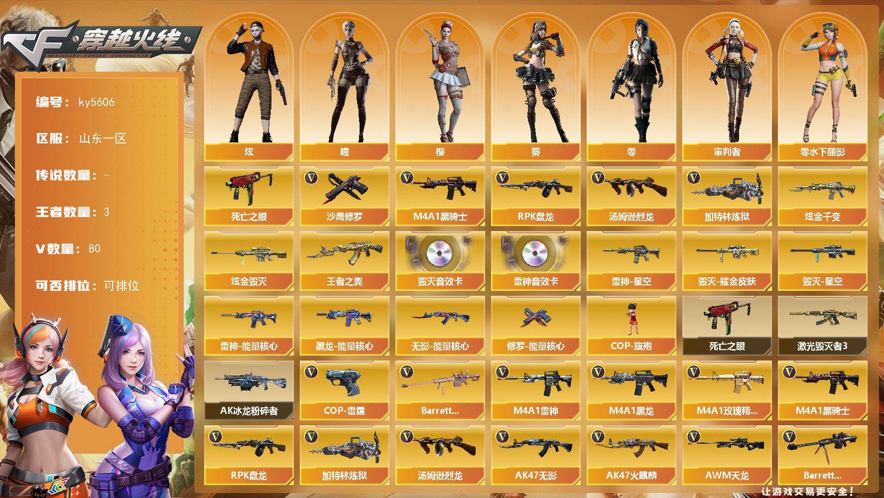 - [16156242]重庆一区-54V-3王者-0炫金 【传说武器】:传说圣灵 【热门武器】:传说圣灵,M200-幻神,荣耀世冠-雷神,荣耀世冠-柯尔特,M4A1-黑骑士,汤姆逊-烈龙*3,雷神-小红,COP 357-幻灵,沙鹰-修罗*4 【音效卡】:M4A1-黑骑士音效卡,Barrett-碧霄极光音效卡*2,白虎-盛典舞曲音效卡,炼狱-百战金芒-庆典舞曲音效卡 【皮肤】:幻神-AG-CFPL S24冠军 皮肤,白虎-白鲨-CFPLS23冠军,QBZ03-荣耀世冠EP 皮肤,裁决-巅峰荣耀 皮肤,裁决-胜者为王 皮肤,雷神-暗月,雷神-烈虎皮肤,雷神-化蛇 皮肤,M4A1-再燃火线,雷神-神秘按键 皮肤,毁灭-风暴,战神-流金岁月皮肤,AK47-B-常胜将军-曹操,AK47-B-常胜将军-刘备*2,AK47-B-常胜将军-孙权,龙啸-巅峰荣耀 皮肤,轻型军用手斧-再燃火线 【角色】:魅影,妮妮,修道士,暗夜-X,虎妞,娟娟,灵狐者-X,龙儿-小淘气,麻雀,娜塔莉娅,潘多拉-X,潘多拉-甜心教官,青霞仙子,蛇姬,斯沃特-X,铁骑荣耀 【人偶武器】:雷神-小红,迷你深渊冰龙,迷你裂空之翼*2,夺魂,生化手雷-机甲核心,深渊终结者手雷,闪光弹-貂蝉,高爆手雷-大乔,迷你艾比 【挑战大师】:神圣爆裂者III,冰龙粉碎者-白马银枪,VEPR-12-金魔,激光毁灭者III,机甲撕裂者III,试炼破坏者III,阐释者III 【英雄级武器】:AK47-火麒麟,M4A1-雷神,M4A1-黑骑士,AK47-B-常胜将军,荣耀世冠-雷神,Barrett-毁灭,AWM-裁决,M200-幻神,炼狱-百战金芒,汤姆逊-烈龙*3,沙鹰-修罗*4,沙鹰-天神*3,COP 357-幻灵,荣耀世冠-柯尔特,屠龙*3,幻灵之锋,麒麟刺-百战金芒,王者之啸-觉醒版,王者之击-觉醒版*2,高爆手雷-幻灵*4,闪光弹-幻灵*4,烟雾弹-幻灵*5,烟雾弹-荣耀世冠EP*3,M4A1-赤狱骑士,M4A1-苍鸣雷神 【道具】:BS战队炫彩背包,EP战队炫彩背包,云山科技背包,亚洲杯纪念炫彩背包,炫彩背包,百战金芒炫彩背包,背包-洛丽塔,虎牙炫彩背包,超级背包,女皇终结者-魔龙之吻,救世主-黑桃战神,黄金生化钩,绿色巨人,灵魂忍者,迷雾幽灵,夺命之镰,防化服*3,流光-鎏金之域,枪王排位29赛季金色流光,语音特效-盛典烟火,萌萌小葵表情
