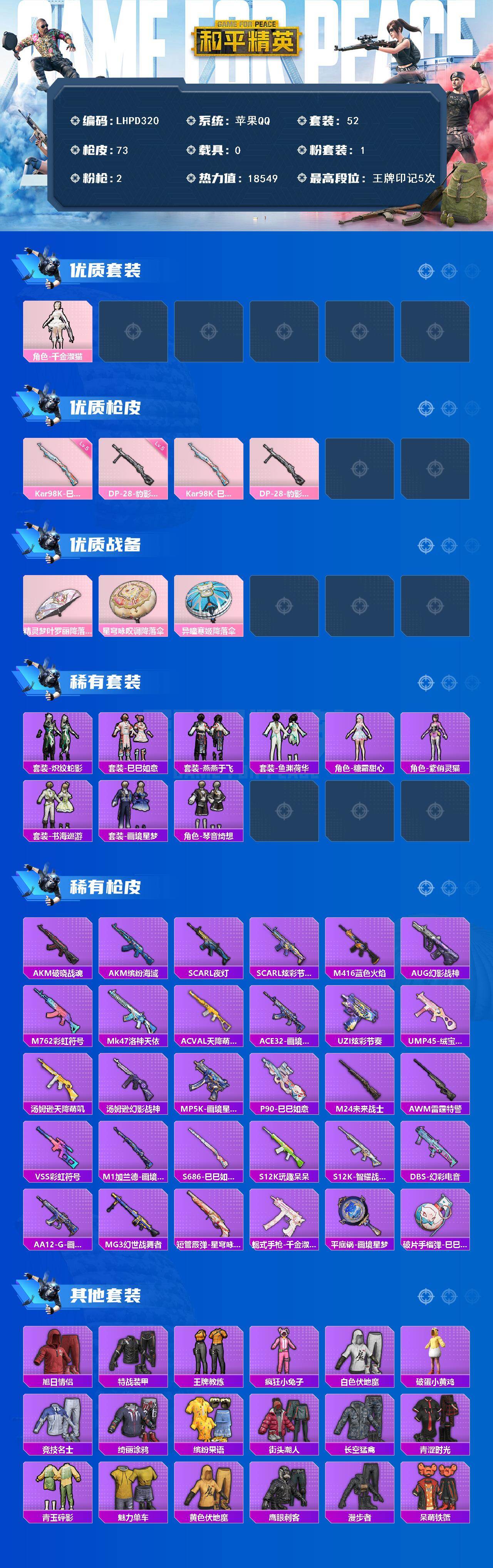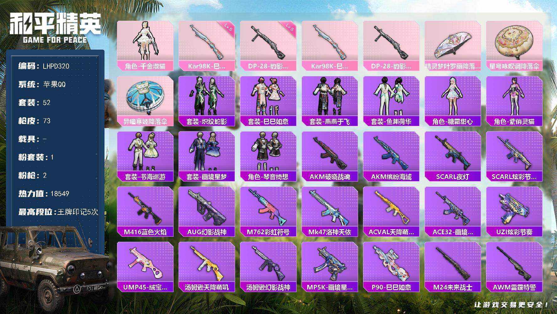 [16636754]【特价出售/苹果 手Q-1粉装-2特效枪-0载具-1粉色飞行器-18549热力值-5王牌印记-52套装-73枪皮【粉色套装】:角色-千金淑猫【粉色枪皮等级】:Kar98K-巳巳如意(五级),DP-28-豹影疾电(五级)【粉色枪皮】:Kar98K-巳巳如意,DP-28-豹影疾电