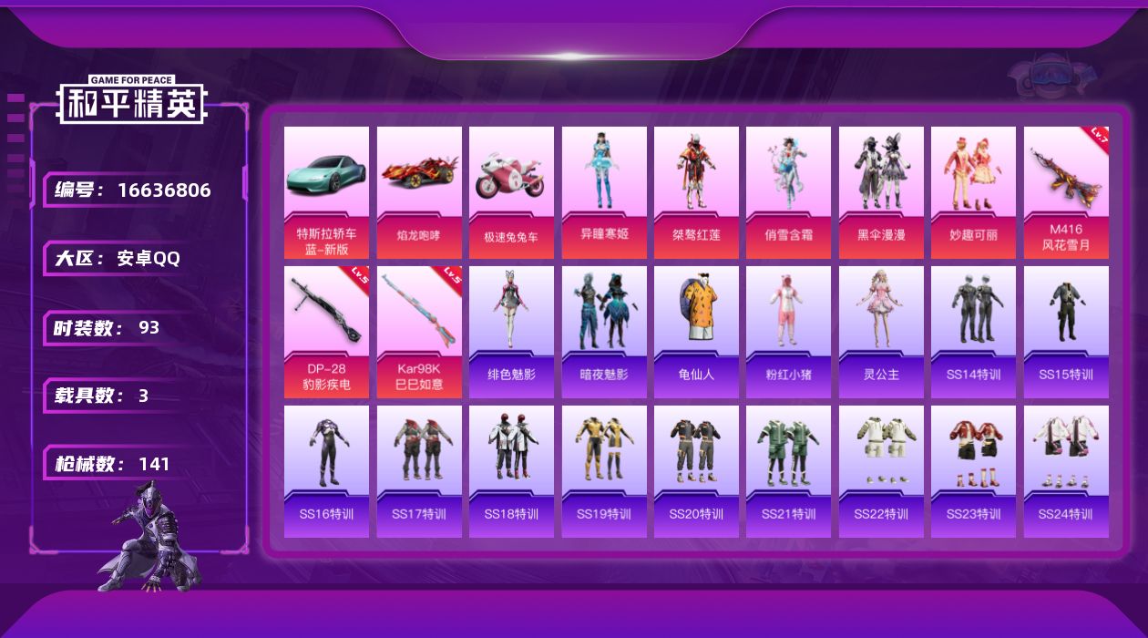 [16636806]【店主推荐捡漏号!可直接换绑】安卓 手Q-5粉装-3特效枪-3载具-2粉色飞行器-45847热力值-5王牌印记-93套装-141枪皮【热门品类】:套装-龟仙人,套装-粉红小猪【粉色套装】:粉装-桀骜红莲,粉装-俏雪含霜,粉装-黑伞漫漫,粉装-妙趣可丽,角色-异瞳寒姬【粉色枪皮等级】:M416-风花雪月(七级),Kar98K-巳巳如意(五级),DP-28-豹影疾电(五级)【粉色载具】:特斯拉Roadster(水滴蓝),焰龙咆哮,极速兔兔车【粉色枪皮】:M416-风花雪月,Kar98K-巳巳如意,DP-28-豹影疾电【粉色飞行器】:红伞翩翩飞行器