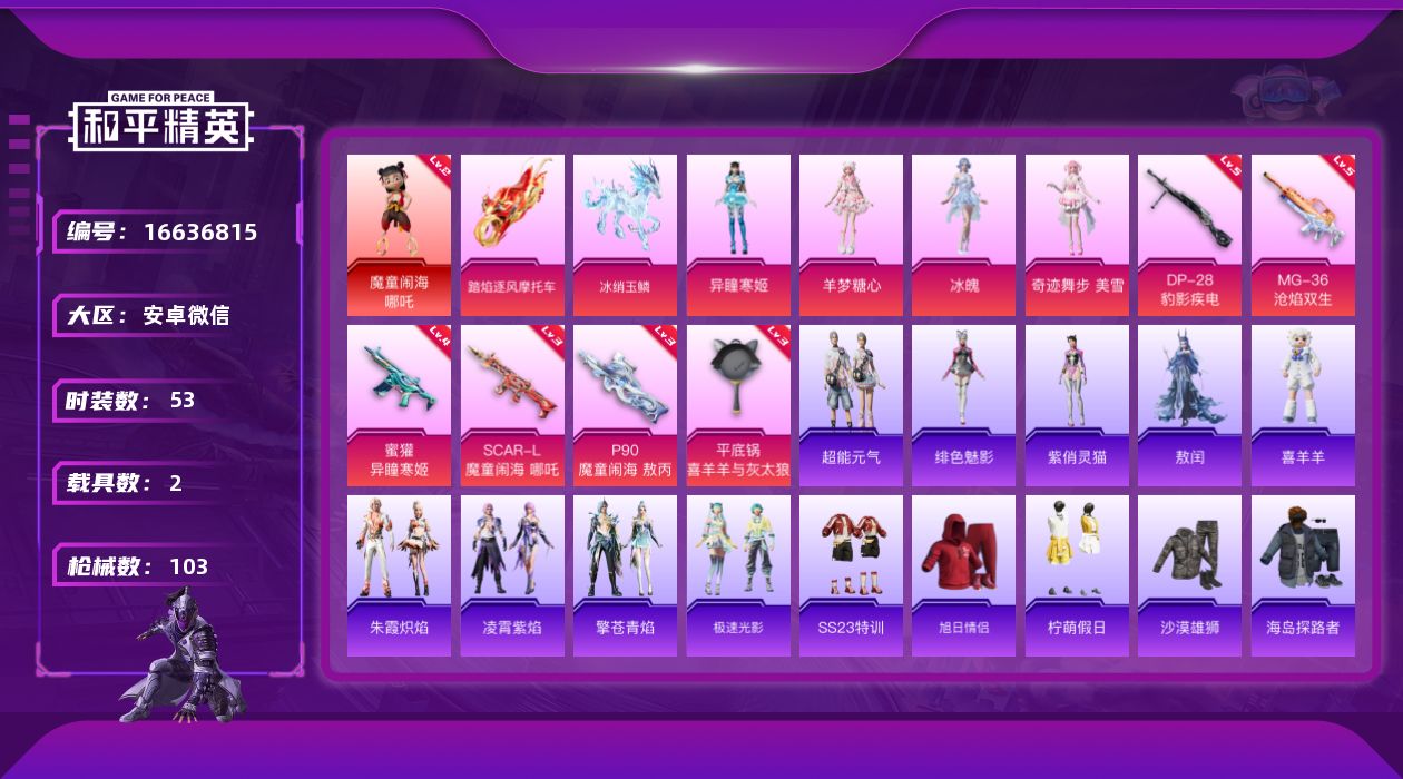 [16636815]【店主推荐捡漏号!可直接换绑】安卓 微信-1神装-4粉装-6特效枪-2载具-3粉色飞行器-29690热力值-4王牌印记-53套装-103枪皮【红色神装等级】:魔童闹海-哪吒(二级)【红色角色神装】:魔童闹海-哪吒【粉色套装】:角色-奇迹舞步 美雪,角色-冰魄,角色-羊梦糖心,角色-异瞳寒姬【粉色枪皮等级】:SCAR-L-魔童闹海 哪吒(三级),蜜獾-异瞳寒姬(四级),P90-魔童闹海 敖丙(三级),DP-28-豹影疾电(五级),MG-36-沧焰双生(五级),平底锅-喜羊羊与灰太狼(三级)【粉色载具】:踏焰逐风摩托车,冰绡玉鳞【粉色枪皮】:SCAR-L-魔童闹海 哪吒,蜜獾-异瞳寒姬,P90-魔童闹海 敖丙,DP-28-豹影疾电,MG-36-沧焰双生,平底锅-喜羊羊与灰太狼【粉色飞行器】:飞天猪飞行器,灵珠游龙飞行器
