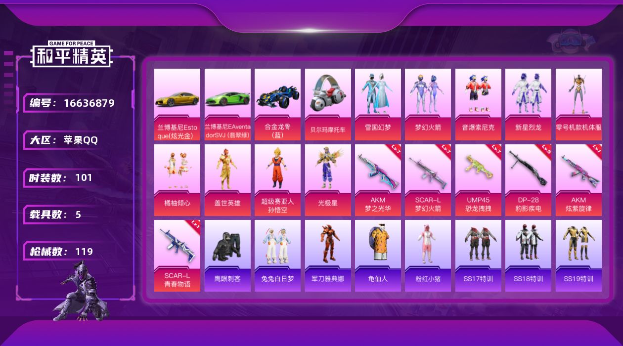 - [15636765]无敌战神框-港澳-巡查员上衣-2粉装-2特效枪-3载具-0粉色飞行器-61219热力值-20王牌印记-148套装-189枪皮 【热门品类】:绝对防御上衣,套装-金羽特工,套装-忍者信条,套装-动感兔斯基人偶服,套装-潮萌小黄鸭,套装-粉红小猪 【粉色套装】:粉装-新星烈龙,粉装-幻彩马卡龙 【粉色枪皮等级】:M416-心之恋语(七级),Kar98K-巳巳如意(二级) 【粉色载具】:特斯拉Model 3(冷光银),阿斯顿马丁DBX(橙),合金龙骨(蓝) 【粉色枪皮】:M416-心之恋语,Kar98K-巳巳如意 【粉色降落伞】:深海曼妙降落伞,炫紫旋律降落伞,神秘黑猫降落伞,四圣焕新降落伞,阿狸红降落伞,银刃赛罗降落伞,香水柠檬降落伞 【稀有枪皮】:AKM-夜灯,AKM-彩虹符号,AKM-灼热熔岩,AKM-玉龙,AKM-生命誓言,AKM-破晓战魂,AKM-萌趣颜团子,AKM-虎虎生威,AKM-霓虹街区,M16A4-机械英豪,M16A4-生命誓言,M16A4-红色方程式,M16A4-蓝色火焰,SCAR-L-炫彩节奏,SCAR-L-繁花小夜曲,SCAR-L-红色方程式,SCAR-L-雷霆特警,SCAR-L-黄金龙骨,M416-夜灯,M416-红色方程式,M416-绯红前夜,M416-蓝色火焰,M416-魔法学院,GROZA-异彩先驱,GROZA-彩虹符号,GROZA-治愈之星,GROZA-生命誓言,GROZA-雷霆特警,GROZA-黑色刀锋,AUG-耀粉歌者,QBZ-原初圣火,QBZ-洛神天依,QBZ-潮汐统领,QBZ-诡娃娃,M762-动感兔斯基,M762-奇异狩猎者,M762-拳皇97,M762-牛气冲天,M762-瑞龙福将,M762-绯红前夜,M762-诡娃娃,M762-镭射皇者,Mk47-百万伏特,G36C-不夜海上花,G36C-金风玉露,AC-VAL-天降萌叽,UZI-众神之王,UZI-古堡领主,UZI-影袭,UZI-炫彩节奏,UZI-生命誓言,UZI-红色方程式,UMP45-夜灯,UMP45-生命誓言,UMP45-荒野猎神,UMP45-蓝色火焰,UMP45-诡娃娃,Vector-彩虹符号,Vector-治愈之星,Vector-生命誓言,Vector-黑色刀锋,汤姆逊-勇闯险境,汤姆逊-异彩先驱,汤姆逊-炫彩节奏,汤姆逊-耀粉歌者,野牛-夜灯,野牛-机械英豪,M