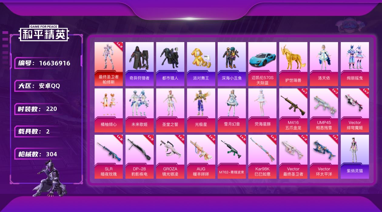 [16636916]【店主推荐捡漏号!可直接换绑】安卓 手Q-1神装-8粉装-11特效枪-2载具-10粉色飞行器-106302热力值-18王牌印记-220套装-304枪皮【红色神装等级】:最终圣卫者-帕修斯(三级)【红色角色神装】:最终圣卫者-帕修斯【热门品类】:套装-浪漫天命,套装-都市猎人,套装-派对舞王,套装-深海小丑鱼,套装-小丑鱼,套装-奇异狩猎者,角色-军刀雅典娜,套装-金羽特工,套装-龟仙人,套装-暗影哥特,角色-8号机【粉色套装】:角色-洛天依,粉装-绚丽摇曳,粉装-橘柚倾心,粉装-未来歌姬,角色-圣堂之誓,角色-光极星,粉装-雪月幻音,角色-荧海星豚【粉色枪皮等级】:M416-五爪金龙(七级),GROZA-镜光银凌(五级),AUG-暖羊咩咩(五级),M762-青锋波束(五级),UMP45-相思残雪(七级),Vector-环太平洋(一级),Vector-最终圣卫者(三级),Vector-绯穹魔姬(七级),Kar98K-巳巳如意(五级),SLR-暗夜玫瑰(六级),DP-28-豹影疾电(五级)【粉色载具】:迈凯伦570S(天际蓝),护世瑞兽【粉色枪皮】:M416-五爪金龙,GROZA-镜光银凌,AUG-暖羊咩咩,M762-青锋波束,UMP45-相思残雪,Vector-环太平洋,Vector-最终圣卫者,Vector-绯穹魔姬,Kar98K-巳巳如意,SLR-暗夜玫瑰,DP-28-豹影疾【粉色飞行器】:梦幻火箭飞行器,齐天大圣飞行器,黄族统领飞行器,沙丘之主天马,镜域双华-灵镜之阶,龙翔九天飞行器,幽焰列车飞行器,圣域金龙飞行器,终晖之翼飞行器