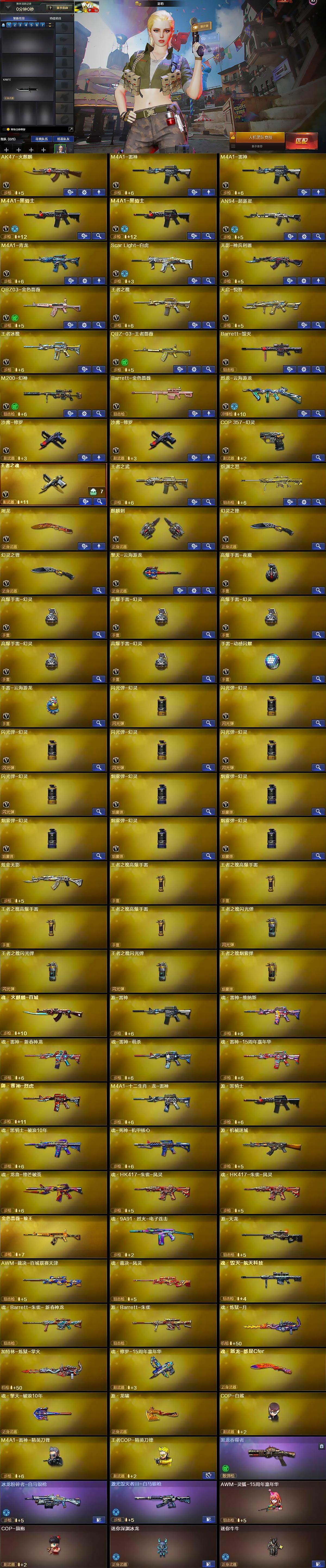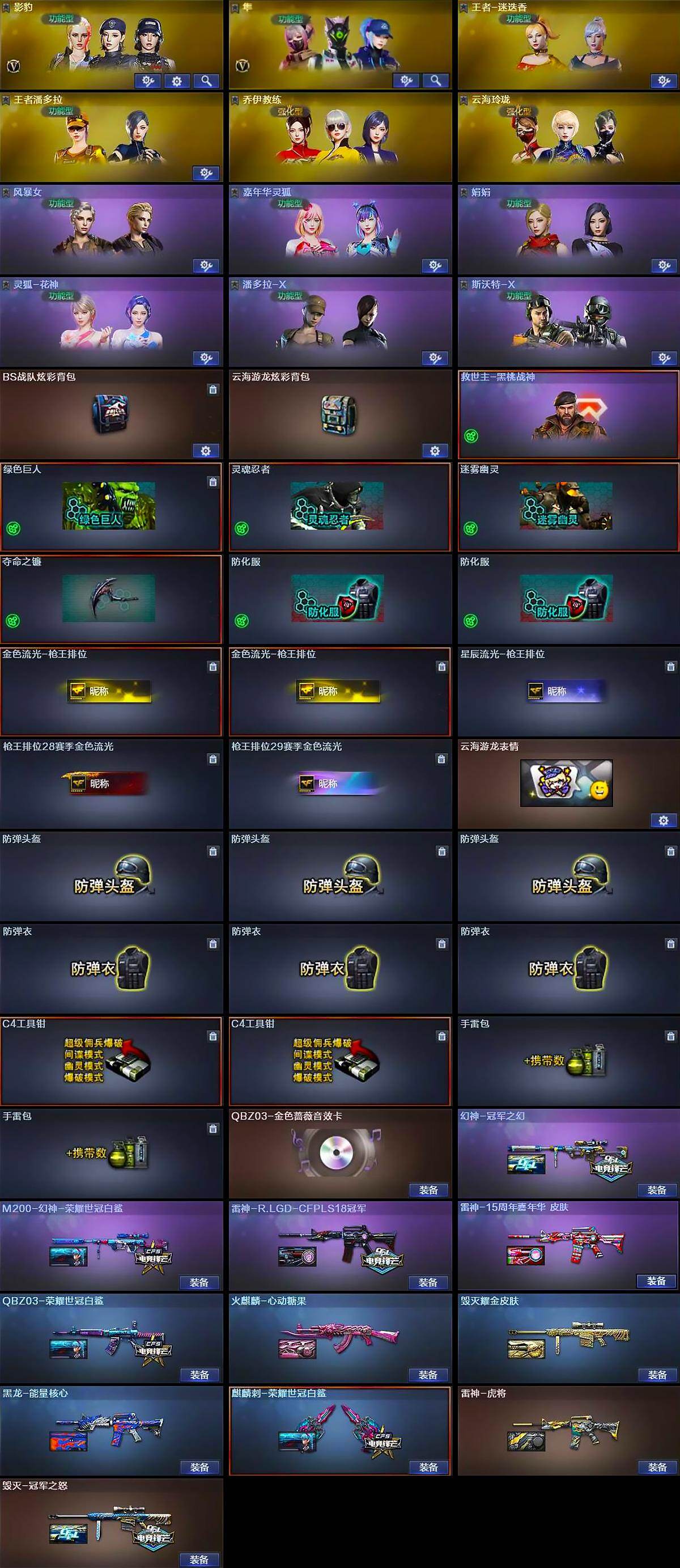 【英雄级武器】:AK47-火麒麟,M4A1-雷神*2,M4A1-黑骑士*2,AN94-超新星,M4A1-青龙,Scar Light-白虎,无影-神兵利器,QBZ03-金色蔷薇,王者之魄-觉醒版,天启-悦智-觉醒版,王者冰魄-觉醒版,QBZ-03-王者蔷薇-觉醒版,Barrett-毁灭,M200-幻神,Barrett-金色蔷薇,烈龙-云海游龙,沙鹰-修罗*2,COP 357-幻灵,王者之魂-觉醒版,屠龙,麒麟刺,幻灵之锋*2,擎天-云海游龙,高爆手雷-夜魔,高爆手雷-幻灵*5,手雷-动感闪耀,手雷-云海游龙,闪光弹-幻灵*6,烟雾弹-幻灵*5