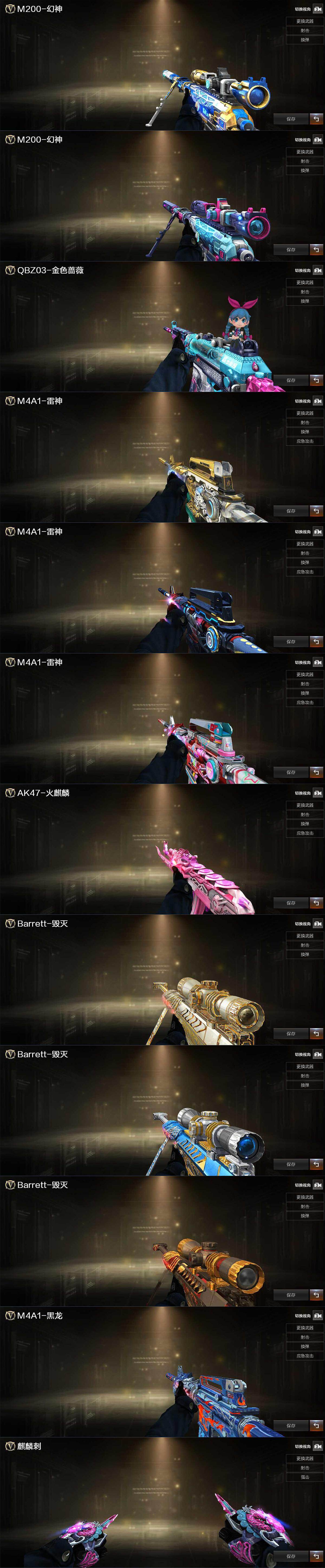 【热门武器】:QBZ03-金色蔷薇,Scar Light-白虎,M4A1-青龙,M200-幻神,M4A1-黑骑士*2,降世魔童,COP-白鲨,COP 357-幻灵,沙鹰-修罗*2