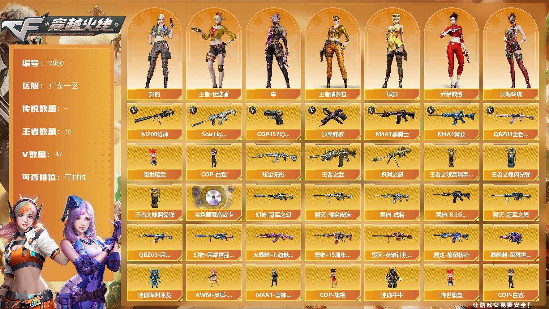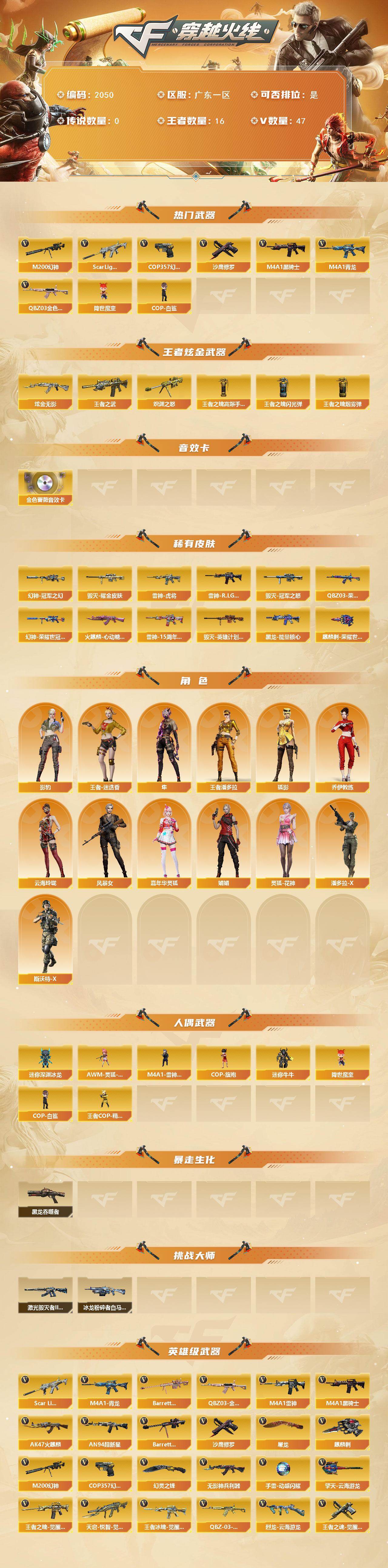 [16637574]广东一区-53V-16王者武器数-1炫金武器数 【热门武器】:QBZ03-金色蔷薇,Scar Light-白虎,M4A1-青龙,M200-幻神,M4A1-黑骑士*2,降世魔童,COP-白鲨,COP 357-幻灵,沙鹰-修罗*2 【王者炫金武器】:王者之武,炽渊之怒,炫金无影,王者之魄高爆手雷*4,王者之魄闪光弹*3,王者之魄烟雾弹 【音效卡】:QBZ03-金色蔷薇音效卡 【皮肤】:幻神-冠军之幻,M200-幻神-荣耀世冠白鲨,QBZ03-荣耀世冠白鲨,雷神-虎将,雷神-R.LGD-CFPLS18冠军,雷神-15周年嘉年华 皮肤,火麒麟-心动糖果,毁灭耀金皮肤,毁灭-冠军之怒,毁灭-英雄计划 皮肤,黑龙-能量核心,麒麟刺-荣耀世冠白鲨 【角色】:影豹,隼,王者-迷迭香,王者潘多拉,狐影,乔伊教练,云海玲珑,风暴女,嘉年华灵狐,娟娟,灵狐-花神,潘多拉-X,斯沃特-X 【人偶武器】:COP-白鲨,M4A1-雷神-精英刀锋,王者COP-精英刀锋,AWM-灵狐-15周年嘉年华,COP-旗袍,迷你深渊冰龙,迷你牛牛,降世魔童 【暴走生化】:黑龙吞噬者 【挑战大师】:冰龙粉碎者-白马银枪,激光毁灭者III-白马银枪 【英雄级武器】:AK47-火麒麟,M4A1-雷神*2,M4A1-黑骑士*2,AN94-超新星,M4A1-青龙,Scar Light-白虎,无影-神兵利器,QBZ03-金色蔷薇,王者之魄-觉醒版,天启-悦智-觉醒版,王者冰魄-觉醒版,QBZ-03-王者蔷薇-觉醒版,Barrett-毁灭,M200-幻神,Barrett-金色蔷薇,烈龙-云海游龙,沙鹰-修罗*2,COP 357-幻灵,王者之魂-觉醒版,屠龙,麒麟刺,幻灵之锋*2,擎天-云海游龙,高爆手雷-夜魔,高爆手雷-幻灵*5,手雷-动感闪耀,手雷-云海游龙,闪光弹-幻灵*6,烟雾弹-幻灵*5 【道具】:BS战队炫彩背包,云海游龙炫彩背包,救世主-黑桃战神,绿色巨人,灵魂忍者,迷雾幽灵,夺命之镰,防化服*2,金色流光-枪王排位*2,星辰流光-枪王排位,枪王排位28赛季金色流光,枪王排位29赛季金色流光,云海游龙表情,防弹头盔*3,防弹衣*3,C4工具钳*2,手雷包*2 【特殊枪械】:1白虎,2黑骑士